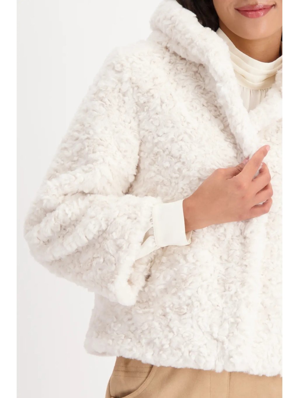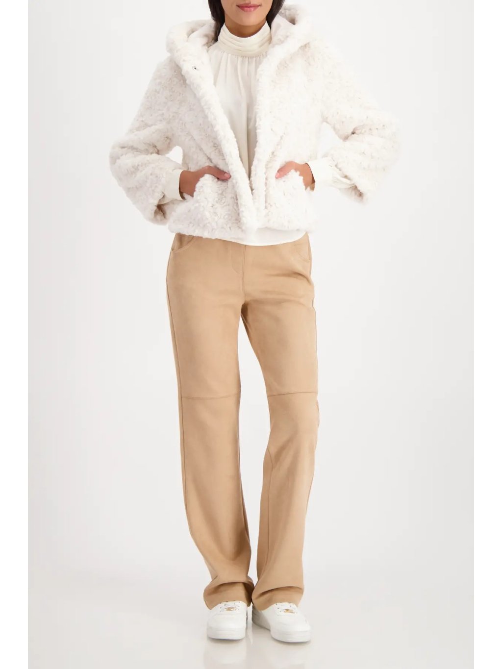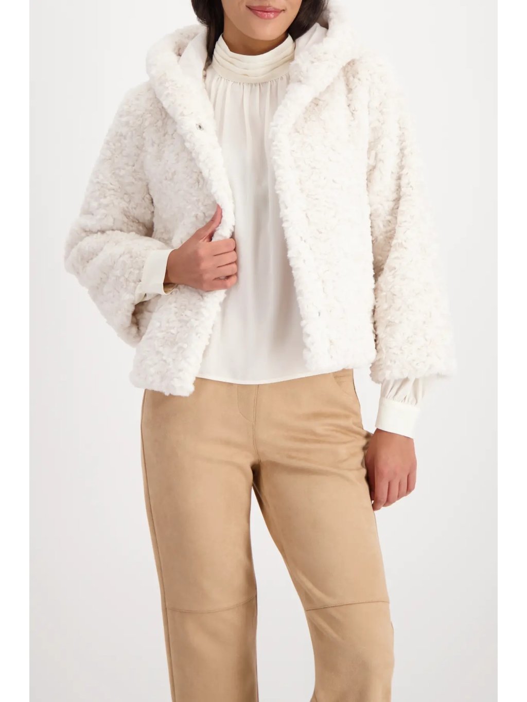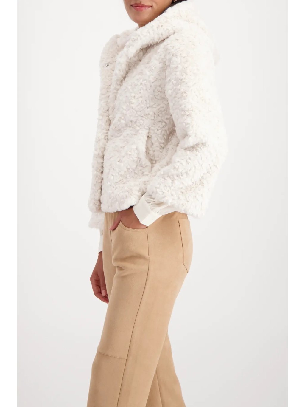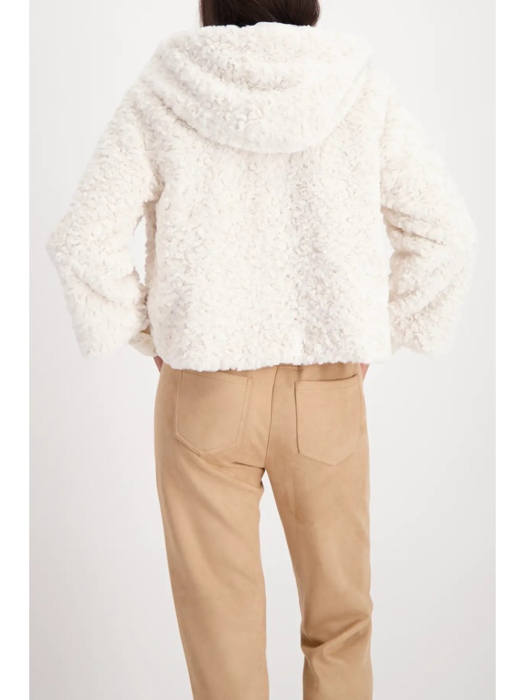 Krátká bunda v plyšovém vzhledu s kapucí a zapínání na druhy působí ležérně, ale stále elegantně.