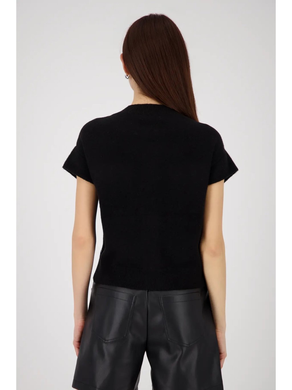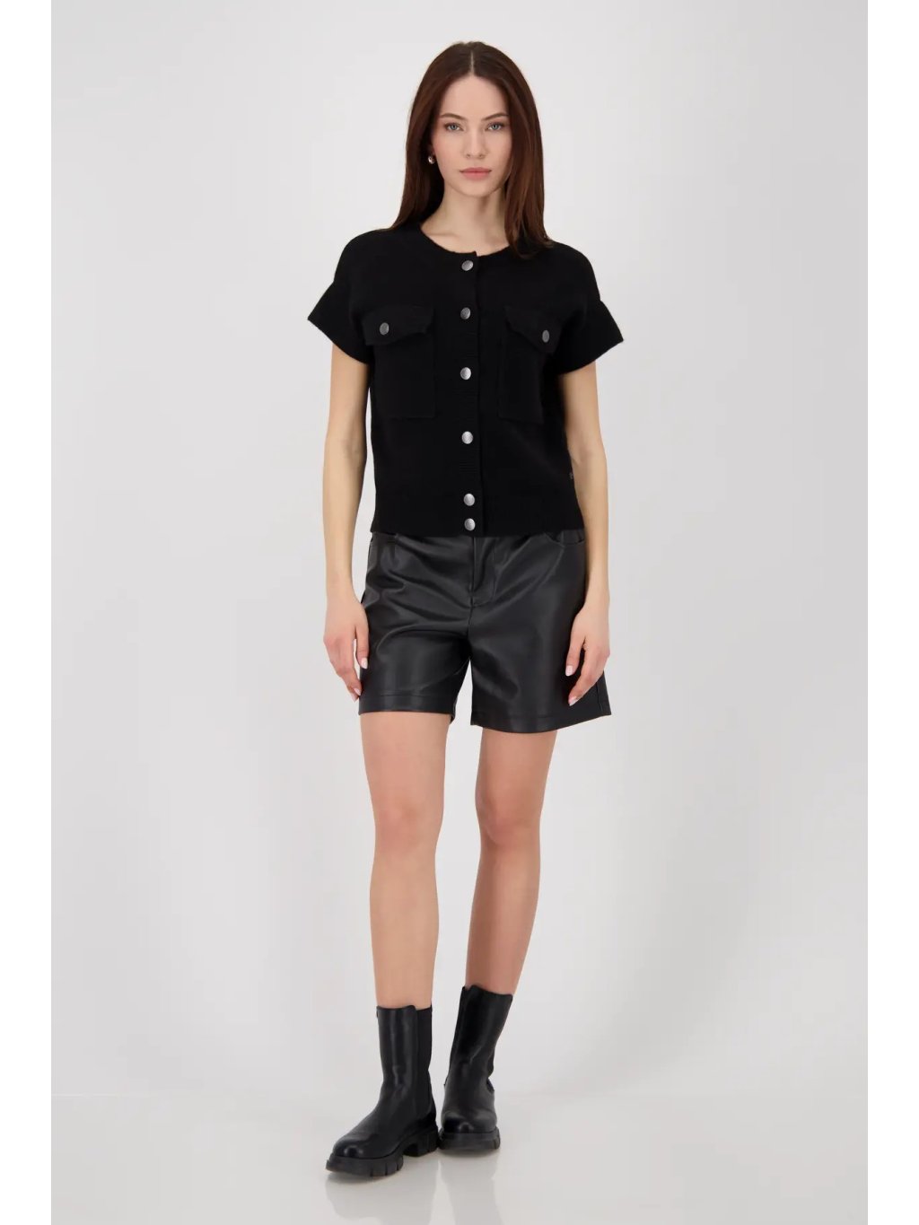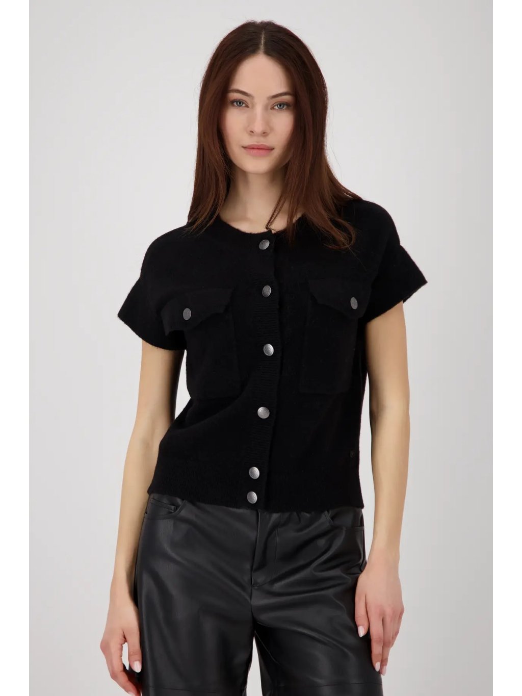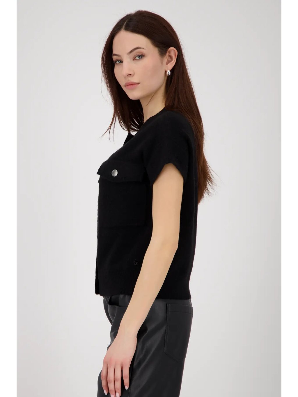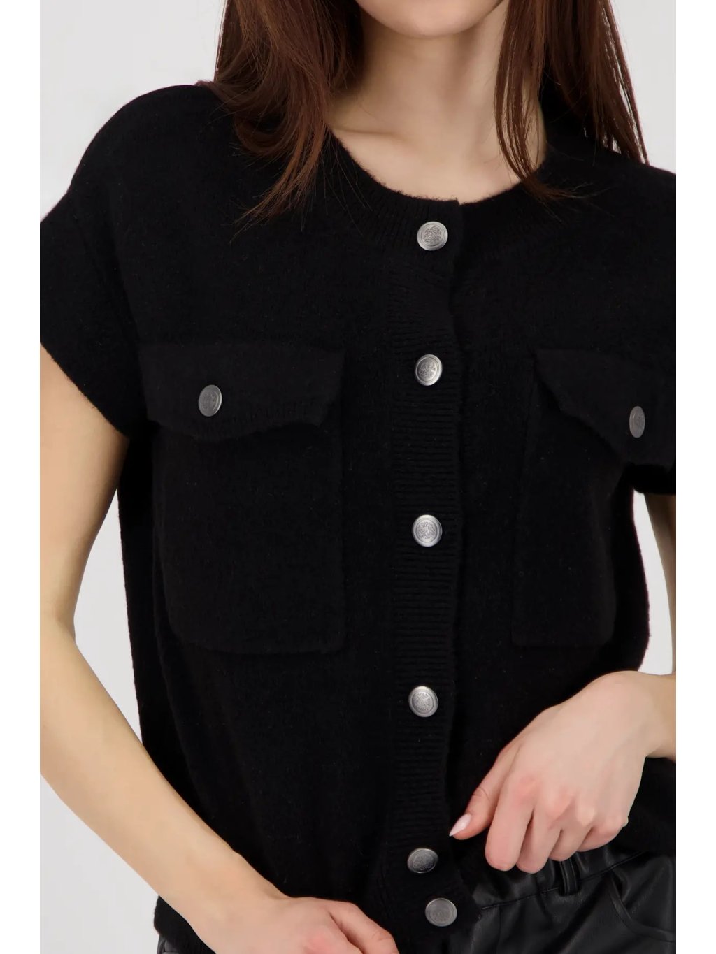 Elegantní pletená černá vesta na knoflíky z kvalitní vlny má krátký rukáv, výstřih kulatý a dvě náprsní kapsy.