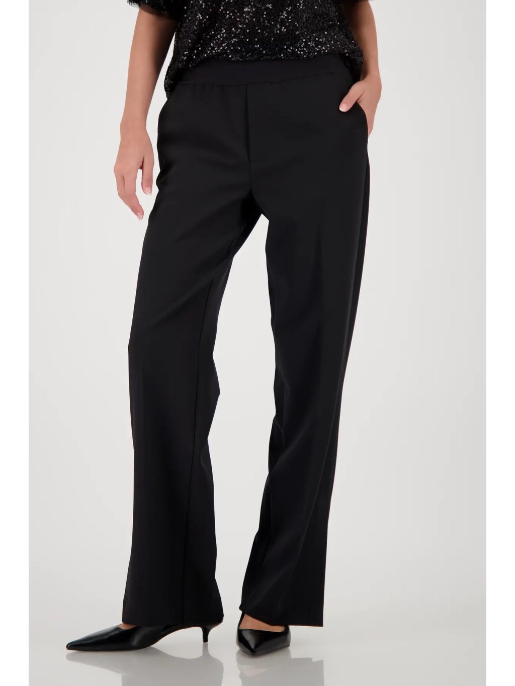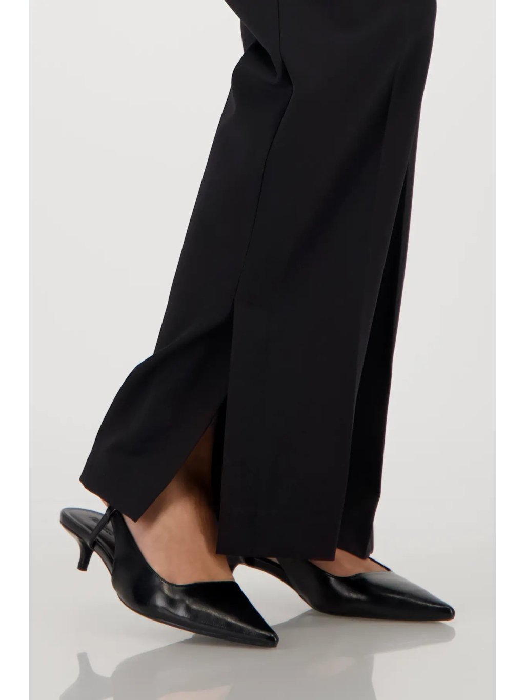 Elegantní černé kalhoty jsou ušité z pružného, příjemného materiálu, který krásně drží tvar a zároveň poskytuje pohodlí při celodenním nošení. Rovný střih s decetní pukovou linií opticky prodlužuje nohy a působí velmi čistě a uhlazeně.