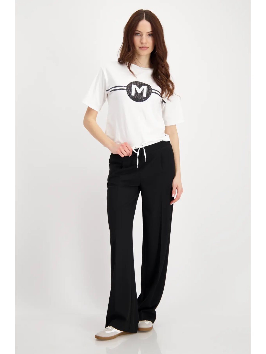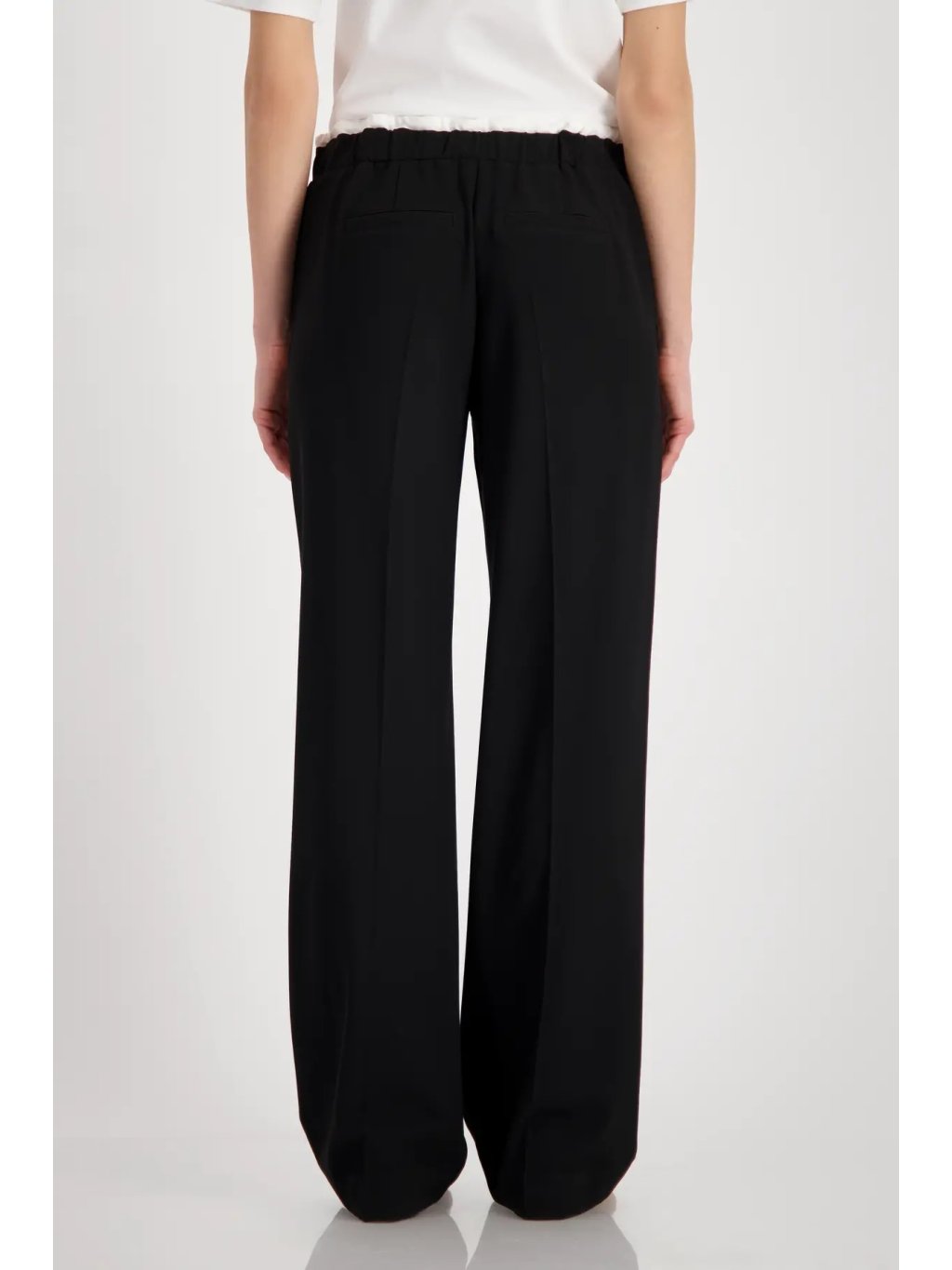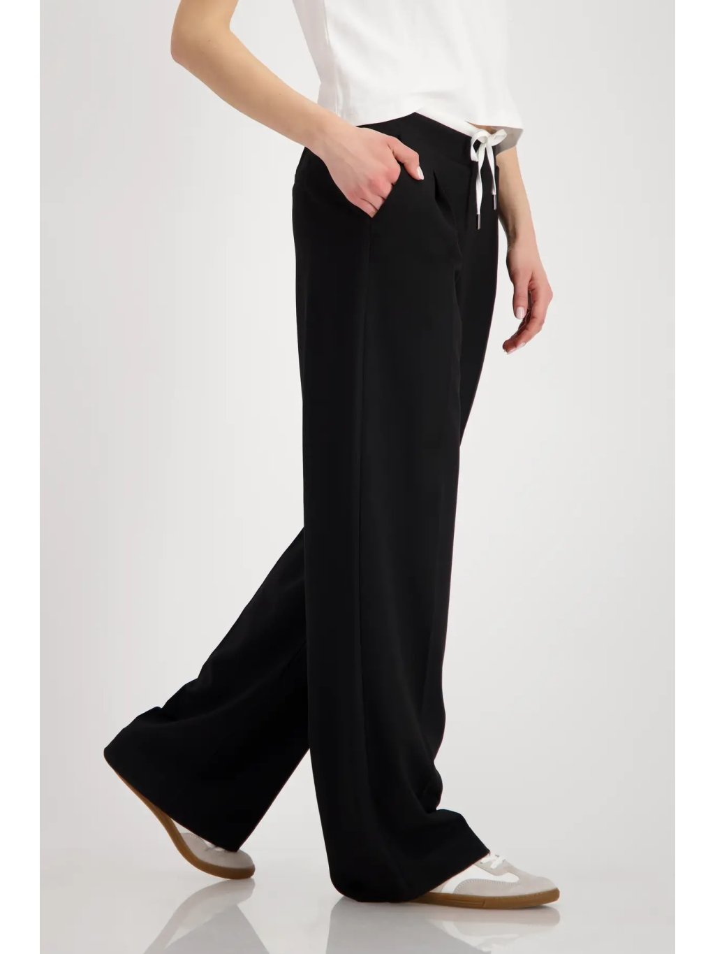 Elegantní černé kalhoty se širokou nohavicí 26 cm a sportovním detailem v podobě bílého pružného pasu se šňůrkou na stažení. Přední část doplňují decetní sklady pro pohodlý střih, zadní díl má dvě falešné kapsy. Kombinace měkkého, příjemného materiálu a elastického pasu zajišťuje celodenní komfort. Perfekně padnou k elegantní halence i volnému svetru, pro ležérní i chic styl.