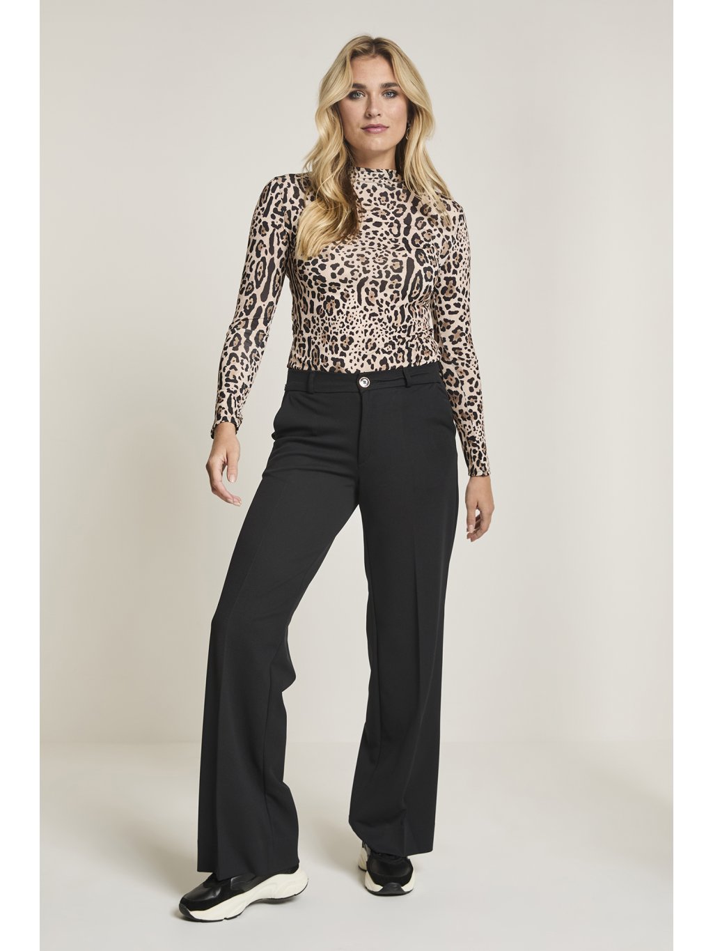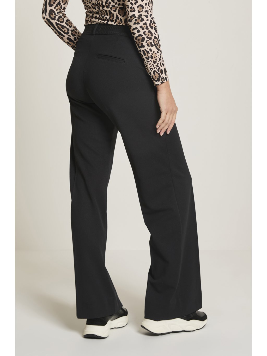 Kalhoty černé splývavé mají boční kapsy, zadní díl je v pase na gumu a šíře nohavice je 28 cm.