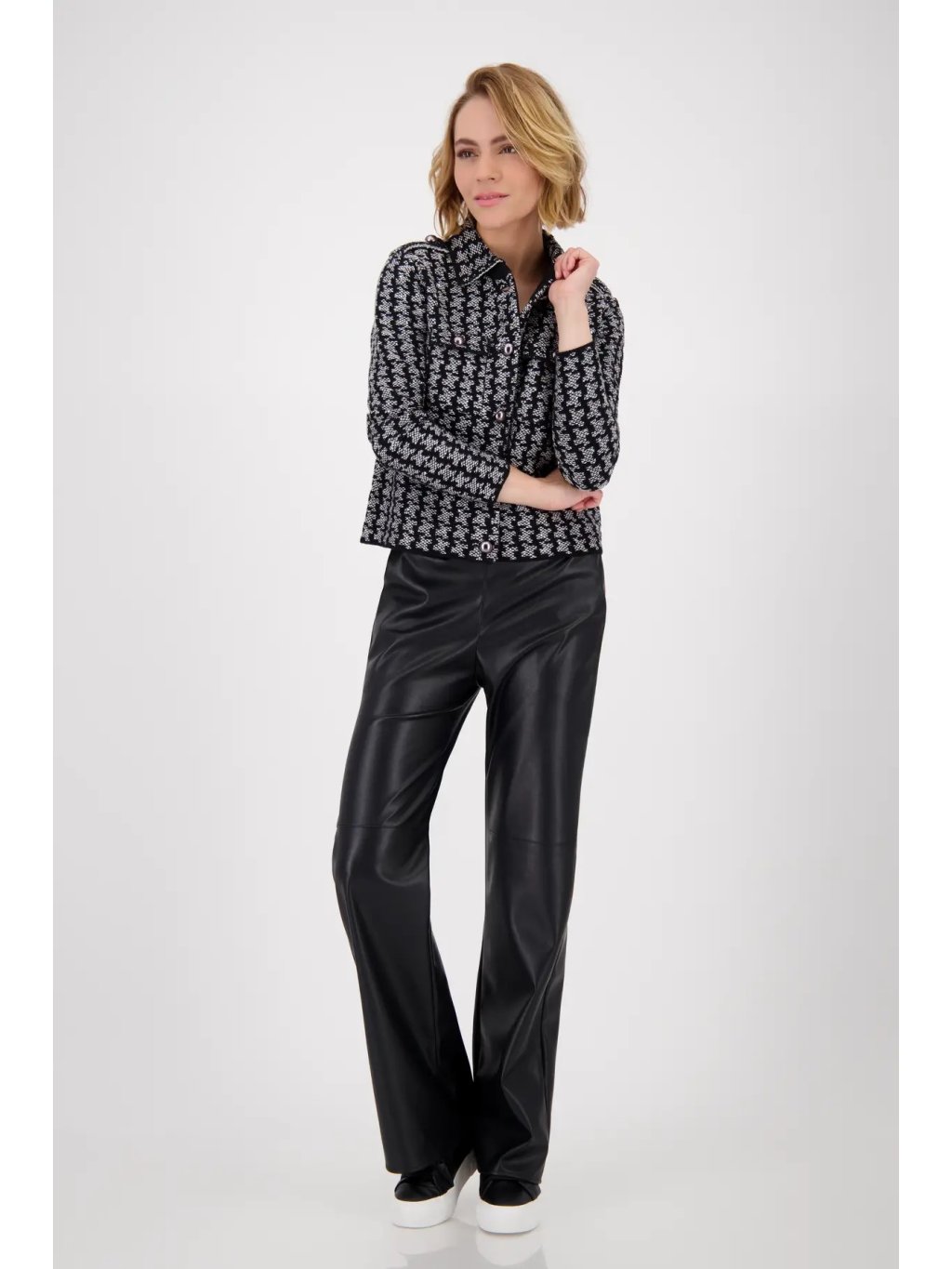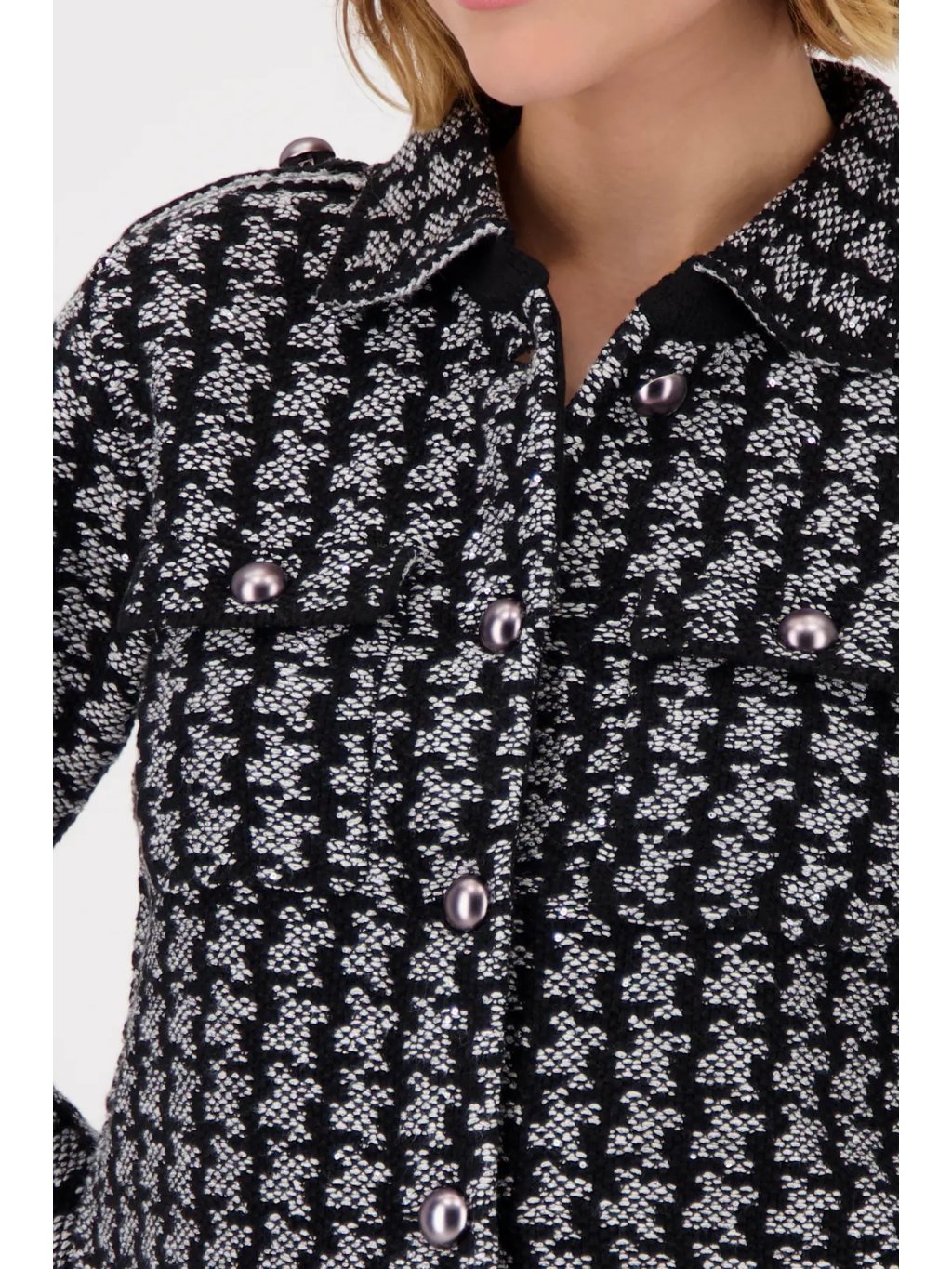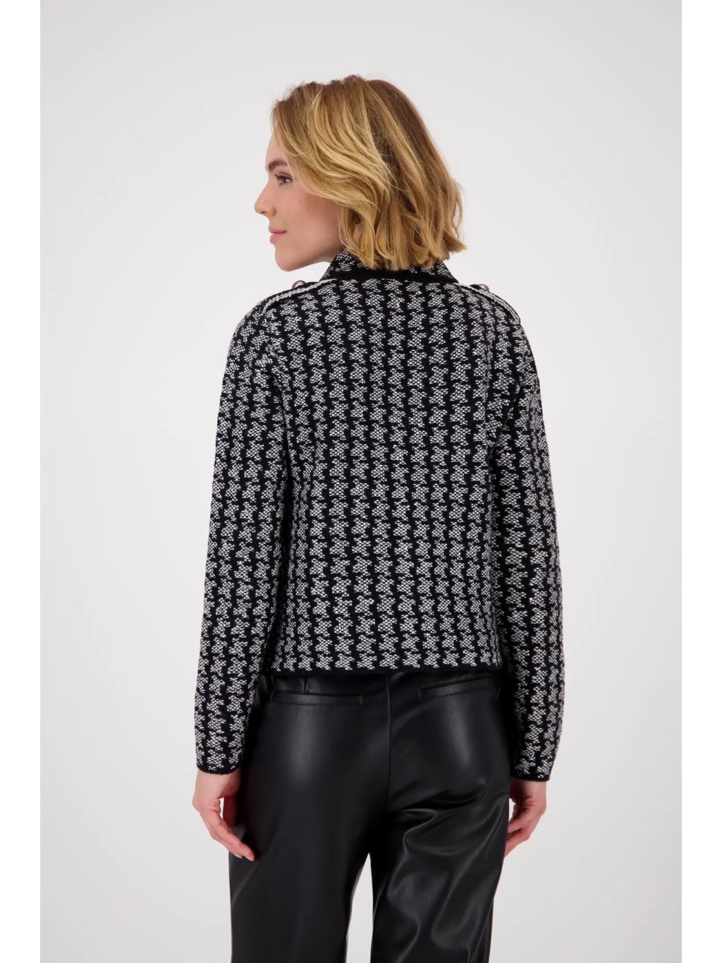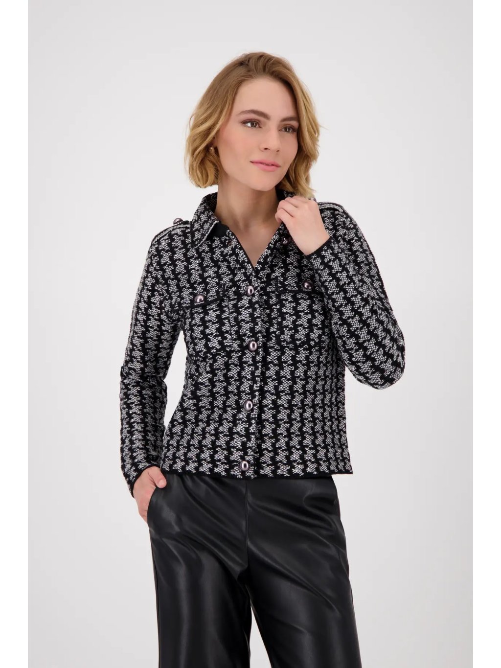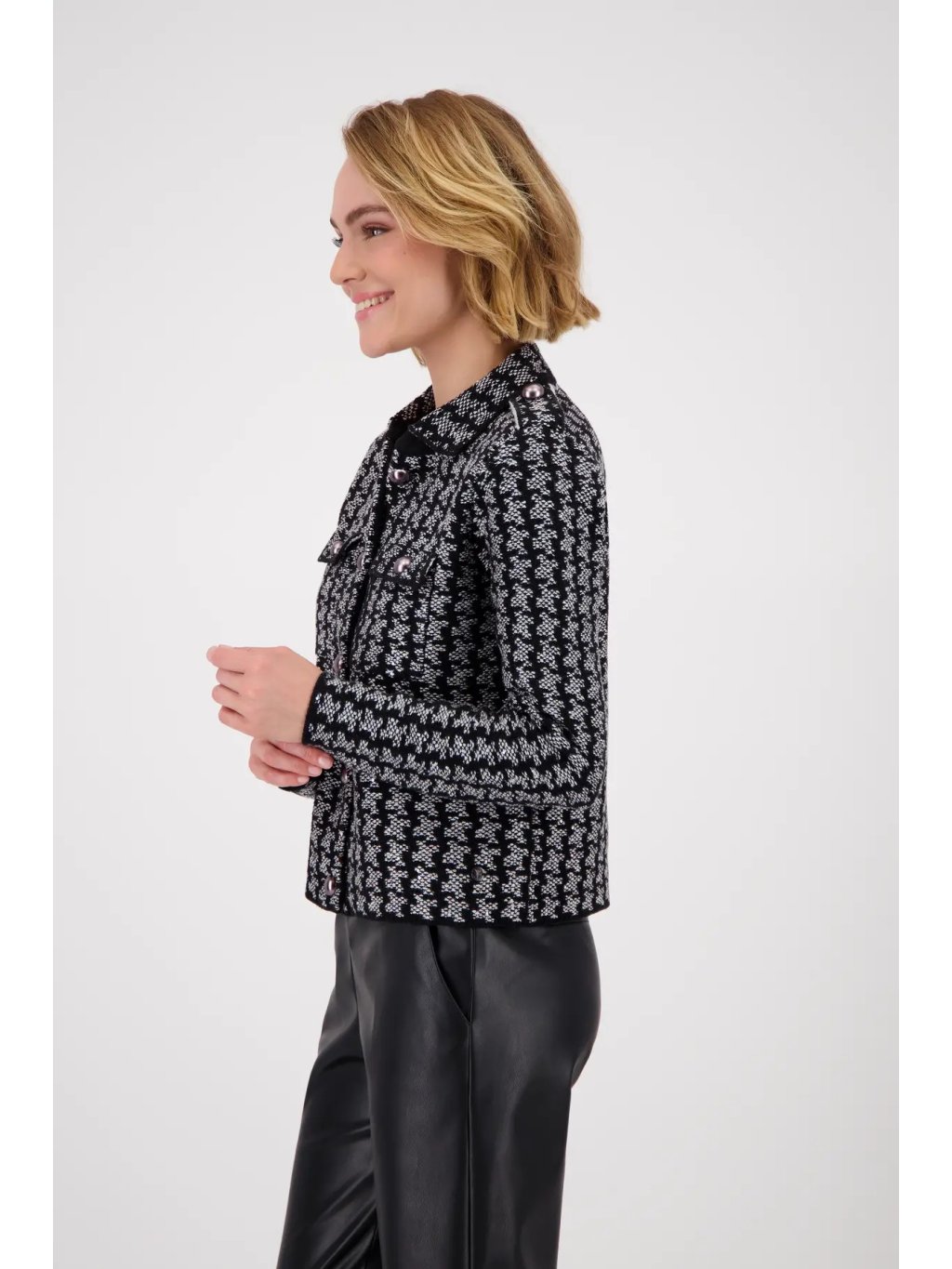 Elegantní pletené sako s nadčasovým vzorem kohoutí stopy v černo-bílé kombinaci. Má klasický límec, zapínání na ozdobné knoflíky a dvě přední kapsy. Pohodlný elastický materiál se snadno kombinuje jak s kalhotami, tak se sukní a skvěle doplní jak pracovní, tak volnočasový outfit.