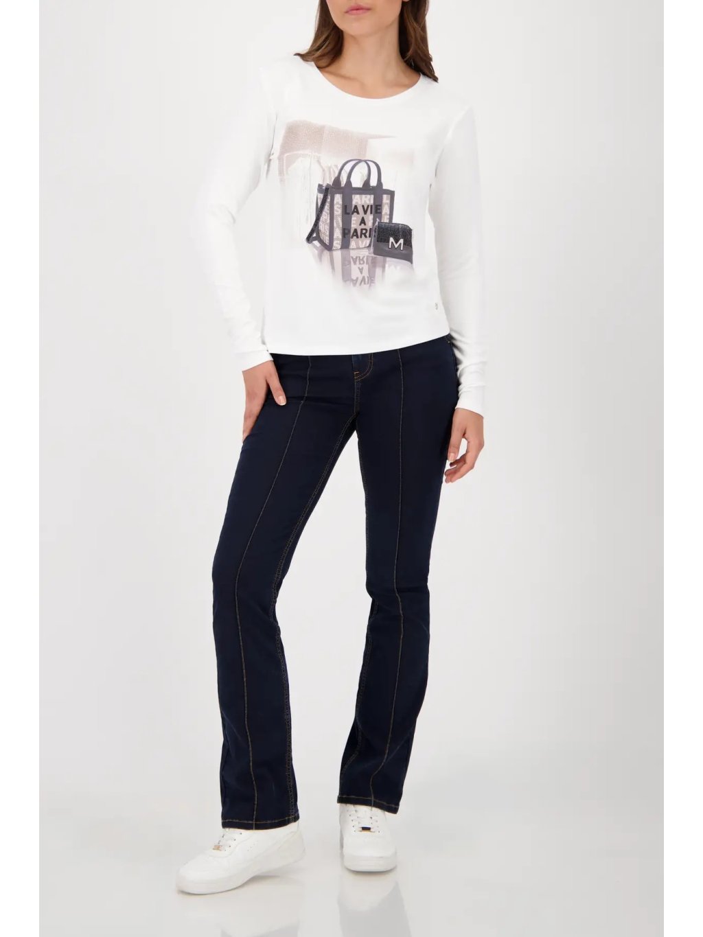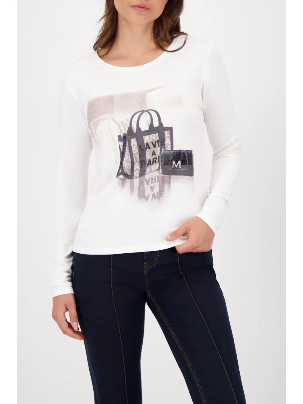 Originální bílé triko s dlouhým rukávem a kulatým výstřihem zaujme unikátním potiskem doplněným o 3 D aplikaci kabelky. Tento detail dodává modelu hravý a zárověň elegantní vzhled, který se hodí pro každodenní nošení i stylové kombinace.