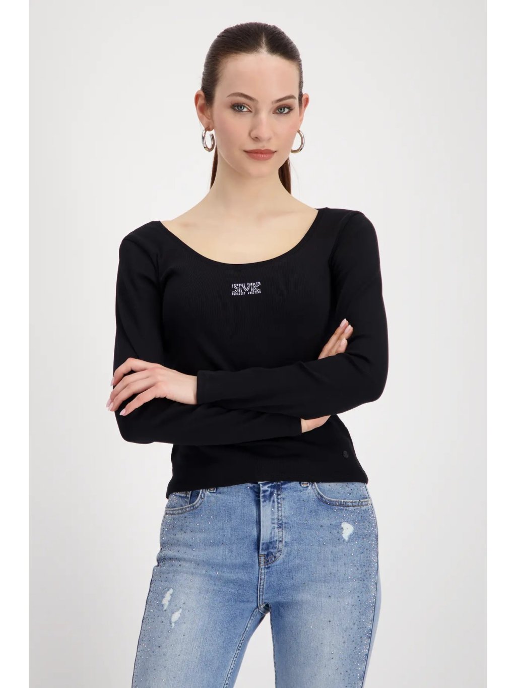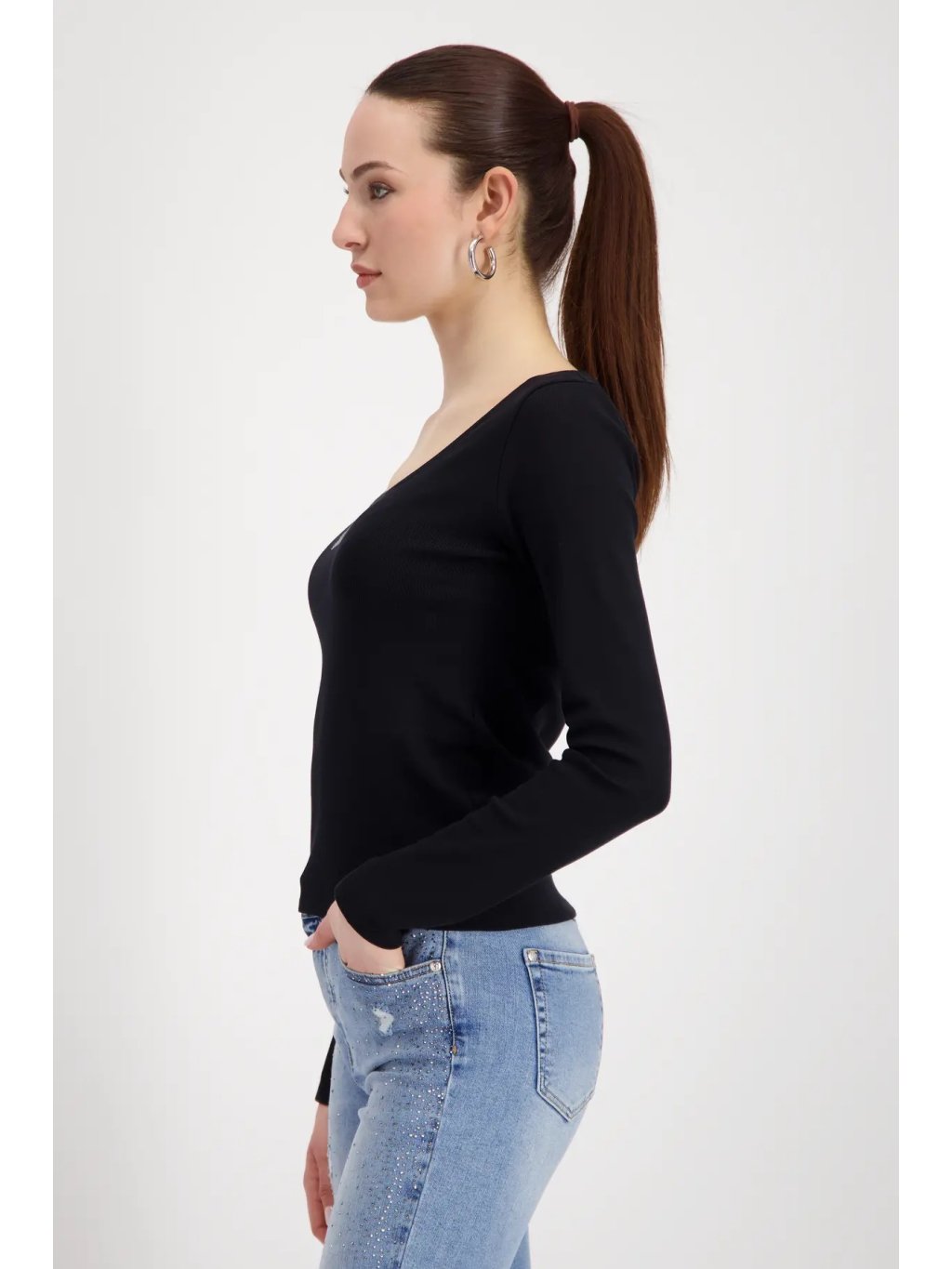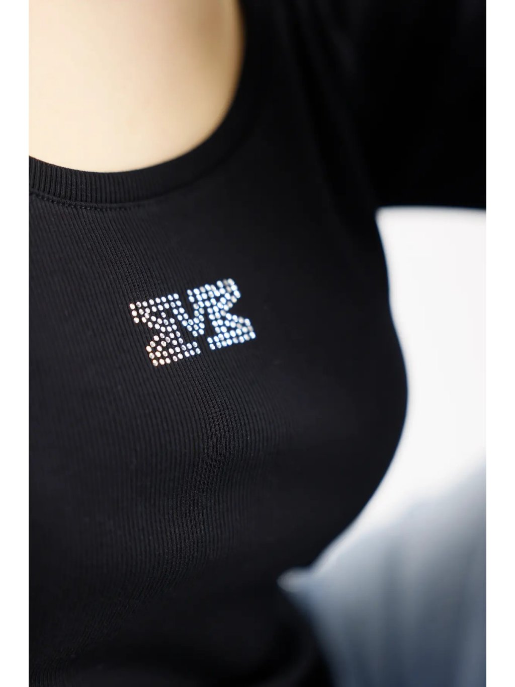 Triko je vyrobeno z kvalitního materiálu, na předním díle pod výstřihem motiv s kamínky.