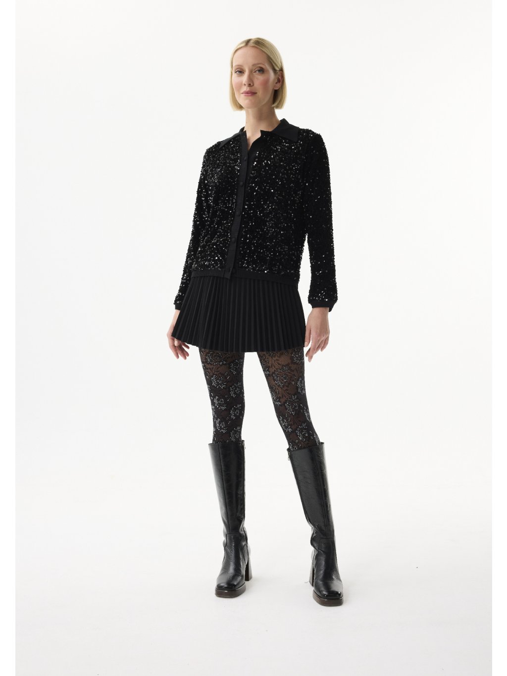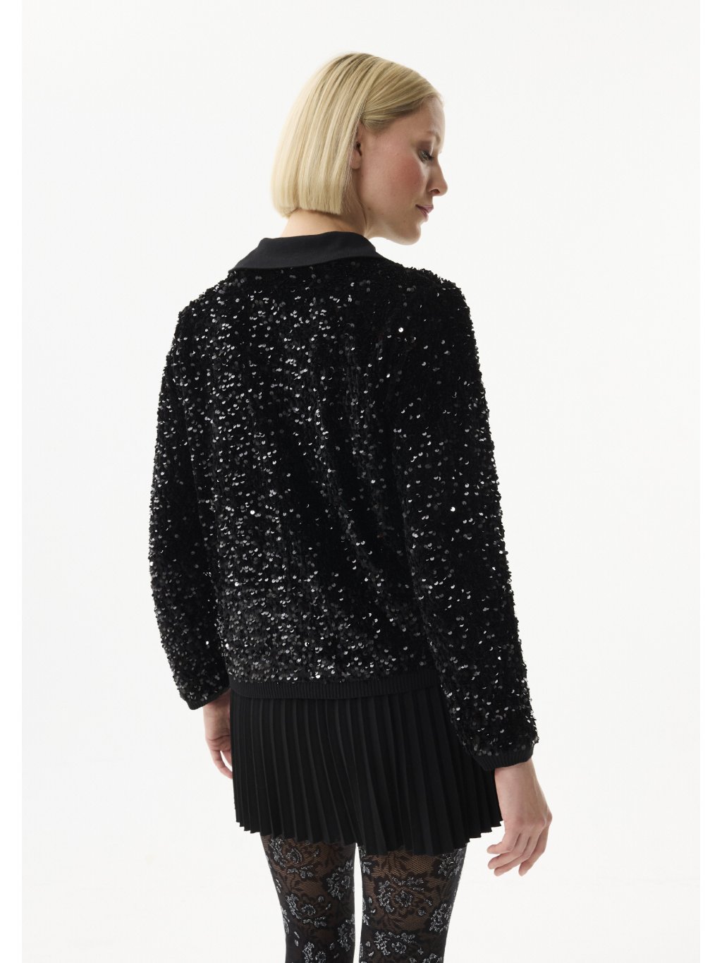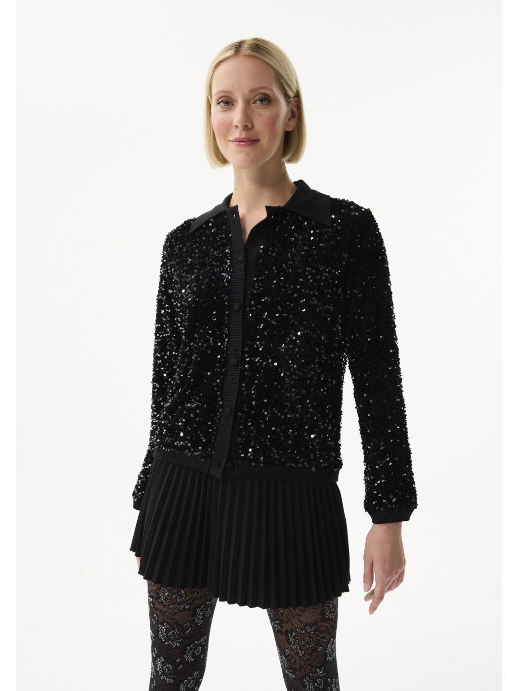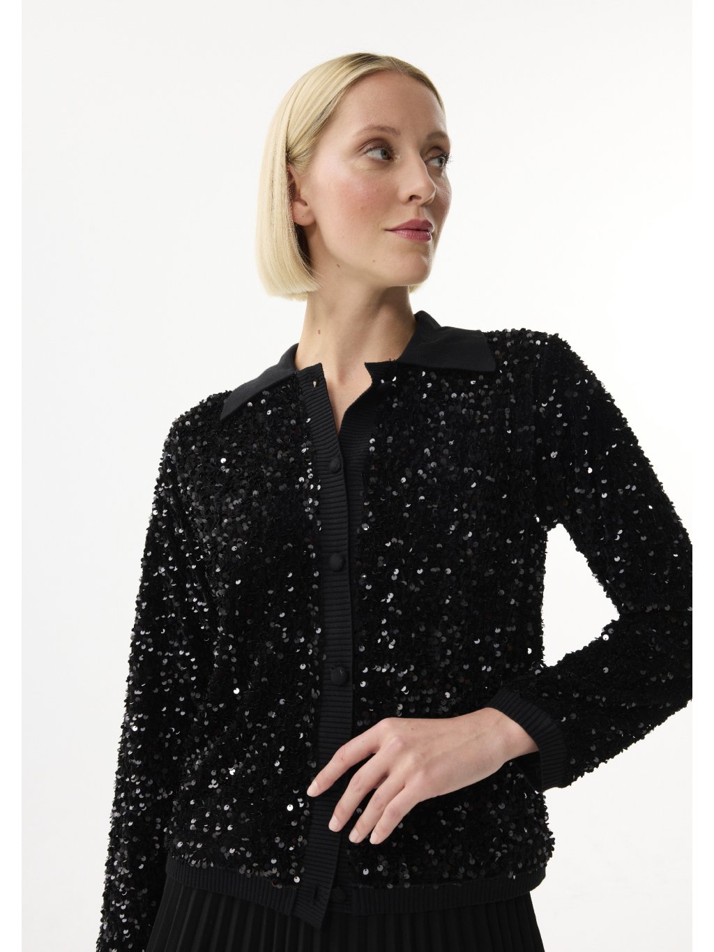 Elegantní propínací svetřík, který v sobě spojuje pohodlí a třpyt. Jemný úplet je po celé ploše zdoben drobnými flitry, které se při pohybu krásně lesknou a dodávají outfitu slavnostní charakter. Má klasický střih s límečkem, kulatým výstřihem a zapínáním na knoflíky zaručuje univerzální využití - od denního nošení po večerní styling.
