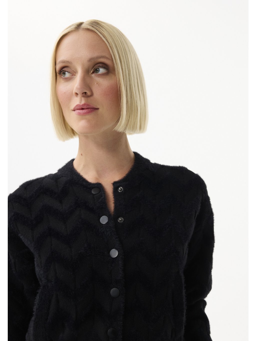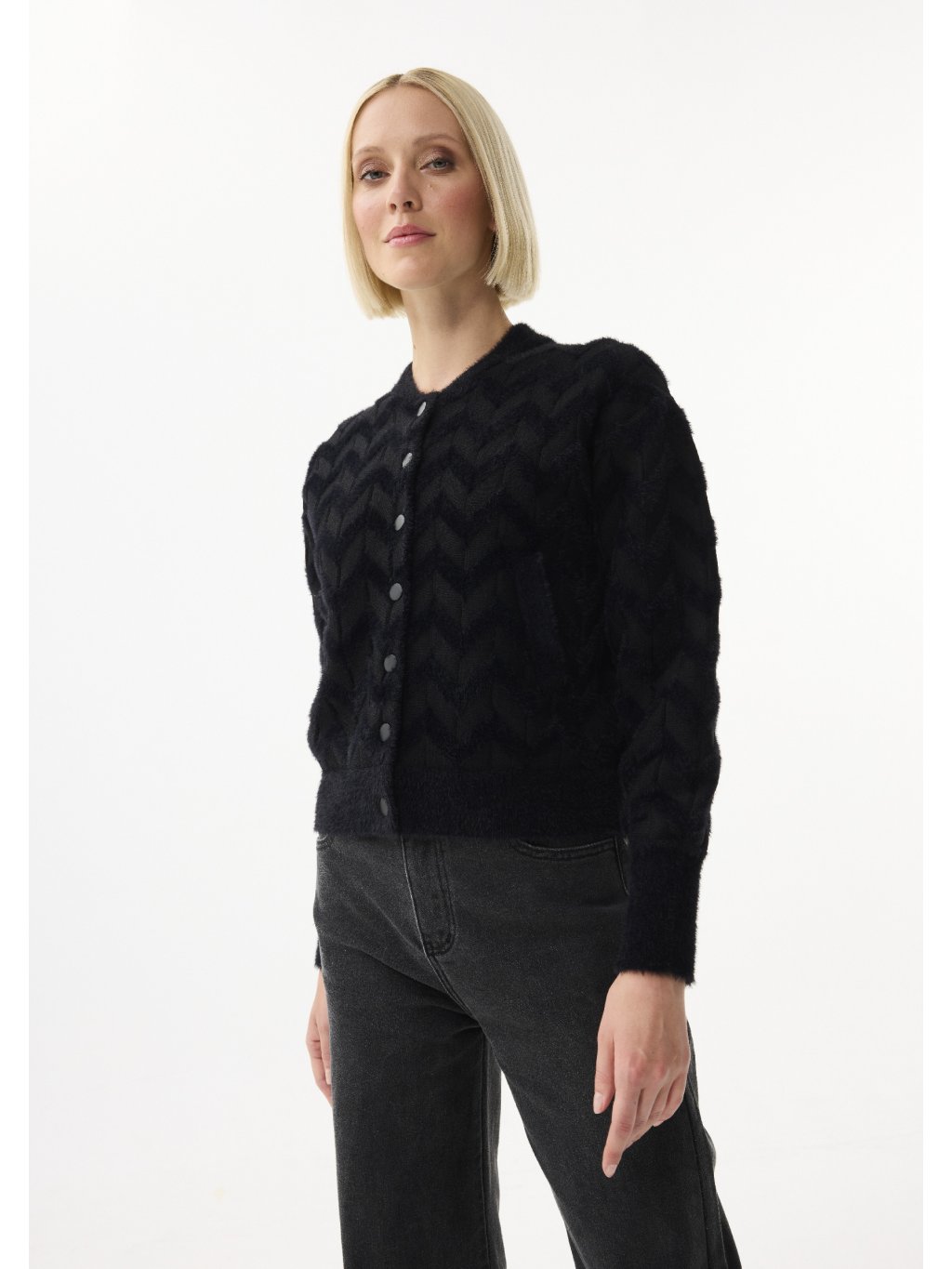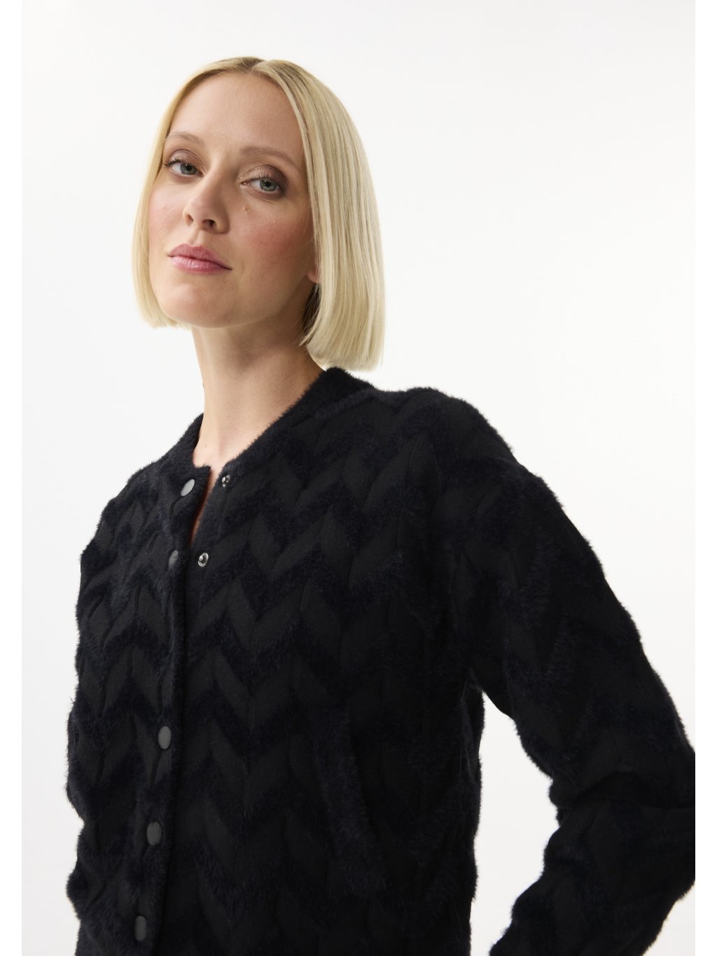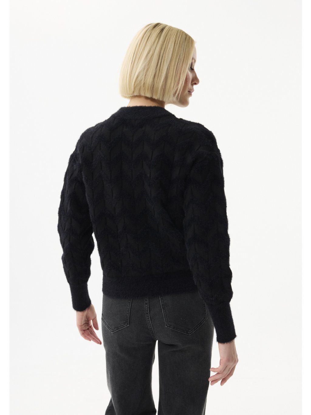 Nádherný model 💎- působí luxusně , ale stále jemně. Textura pleteniny s plastickým vzorem je krásně viditelná a matné druky mu dodávají moderní nádech . Materiál je měkký, hřejivý a velmi příjemný na nošení - ideální pro vrstvení přes šaty, top nebo roláček. Stylový základ pro každý den, který působí sofistikovaně i bez nápadných detailů.