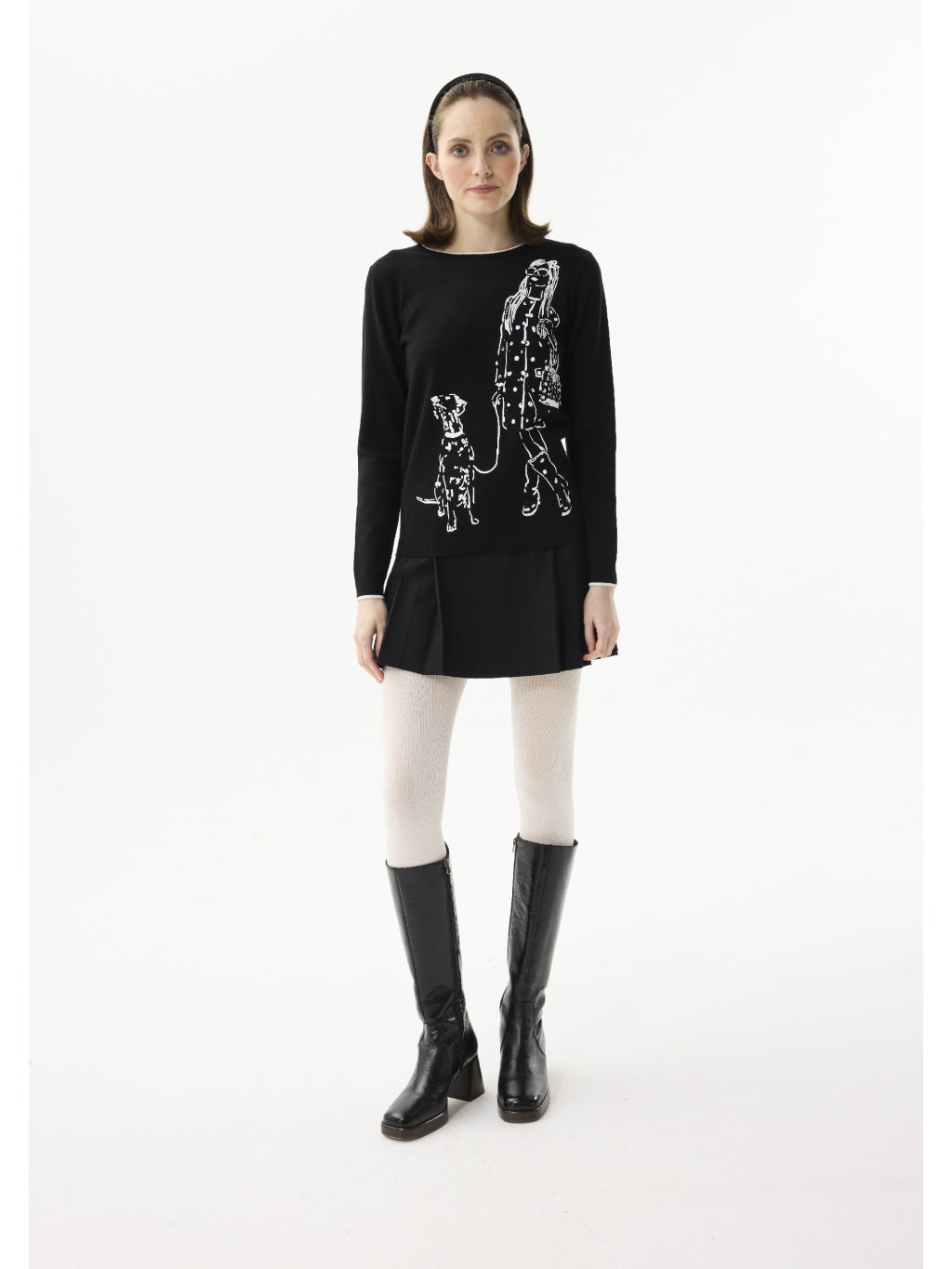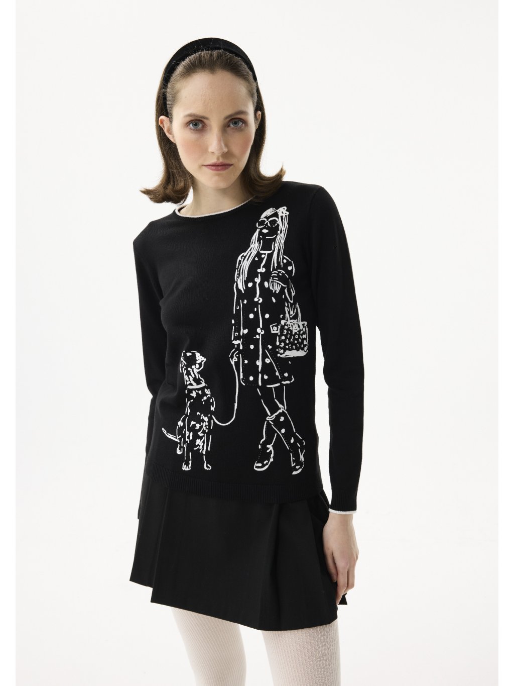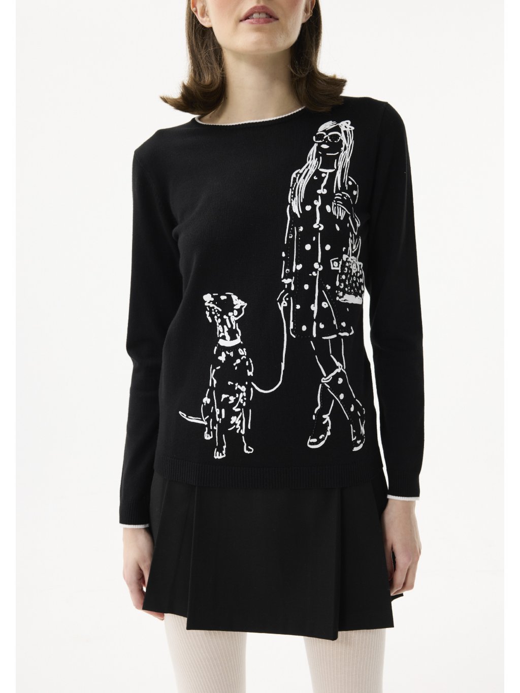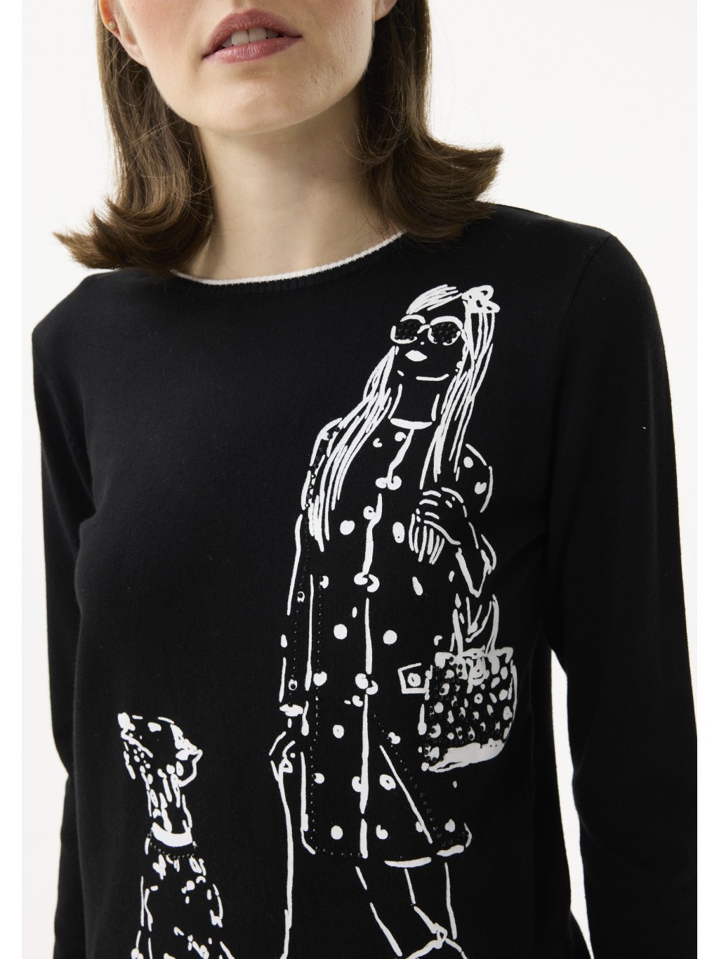 Tento svetřík je naprosto typický pro LEO UGO - originální, hravý, ale stále elegantní . Motiv "dámy s pejskem" působí jako umělecký potisk s pařížským nádechem. 🖤