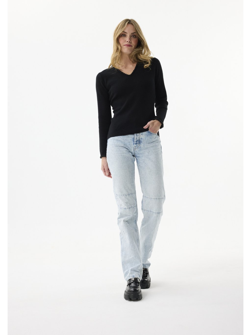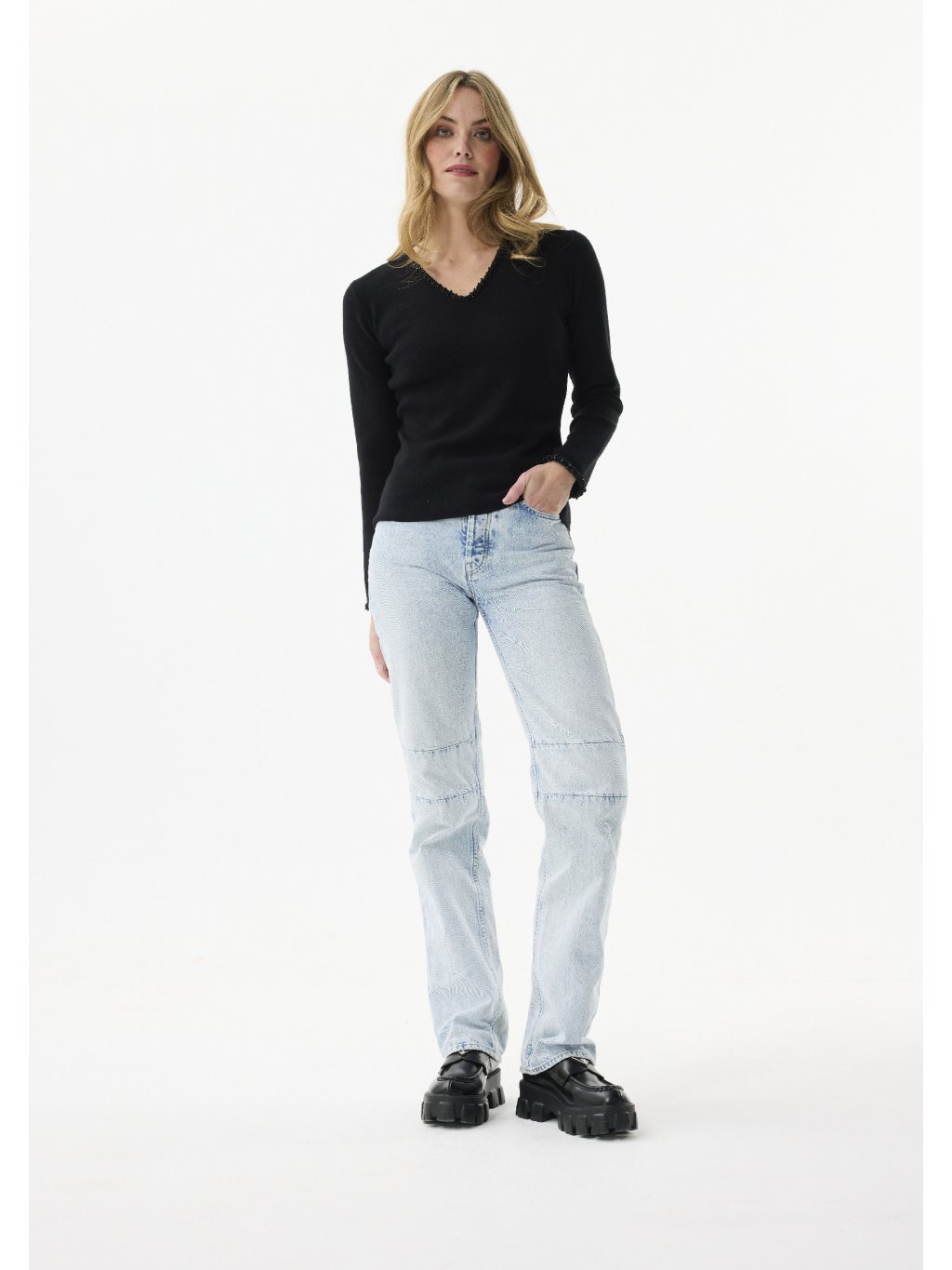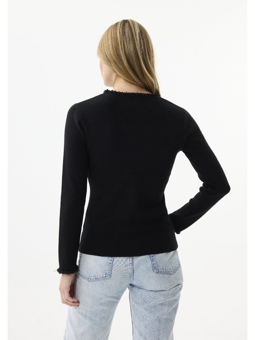 Jemný černý svetřík s výstřihem do "V" zdobený ručně vyšívanými korálky. Korálky elegantně lemují výstřih i zakončení rukávů a vytvářejí tak sofistikovaný detail, který podtrhne ženskost. Měkký, příjemně pružný materiál se krásně přizpůsobí postavě a posyktuje pohodlí po celý den. Perfektní volba k elegantní sukni, kalhotám i džínům.