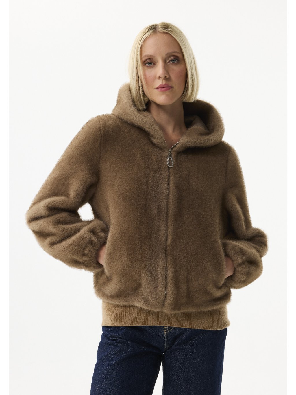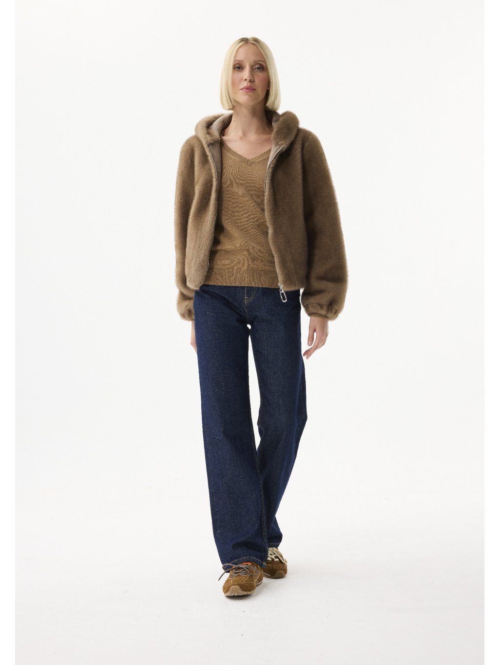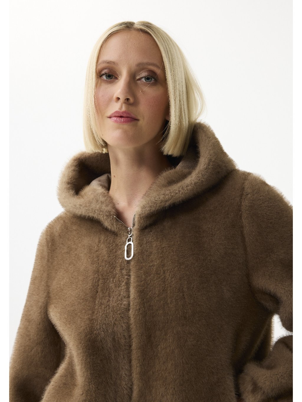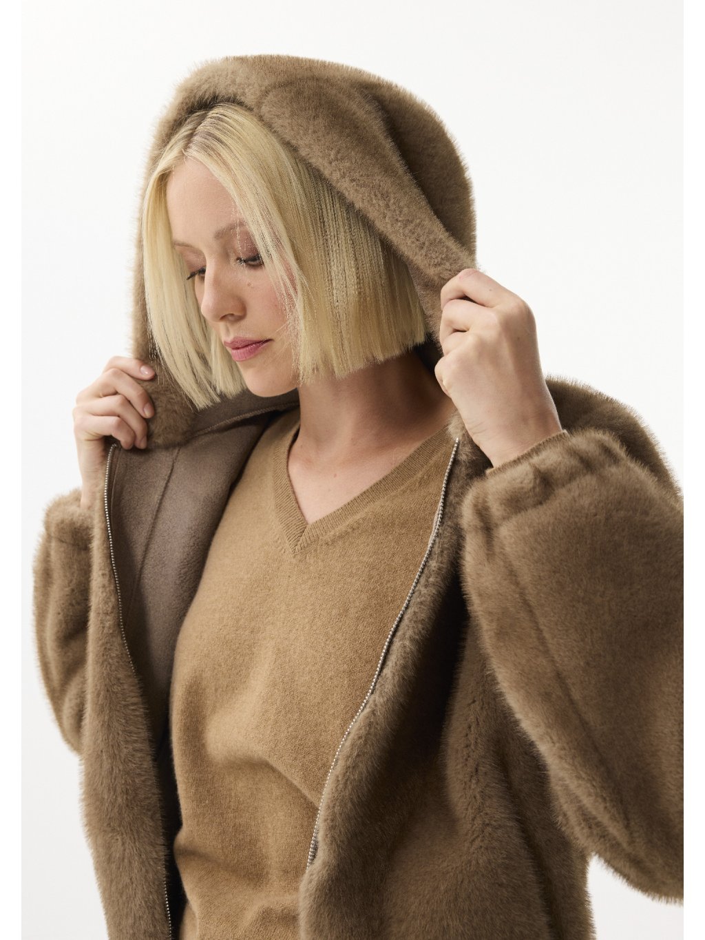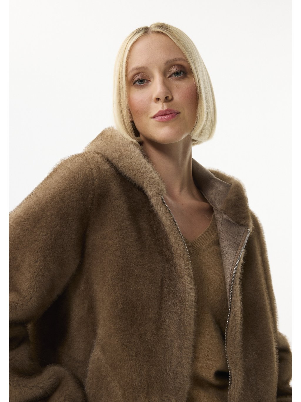 Stylový krátký kabátek z jemné umělé kožešiny v teplém odtínu camel. Model je oboustranný - z jedné strany měkký kožíškový efekt, z druhé strany hladký povrch tónu látky. Má praktickou kapuci, zipové zapínání a pohodlý ležérní střih, který se skvěle kombinuje s džínami i elegantními kalhotami. Luxusní, ale neokázalý kousek, který si zamilujete pro jeho měkkost a variablitu.