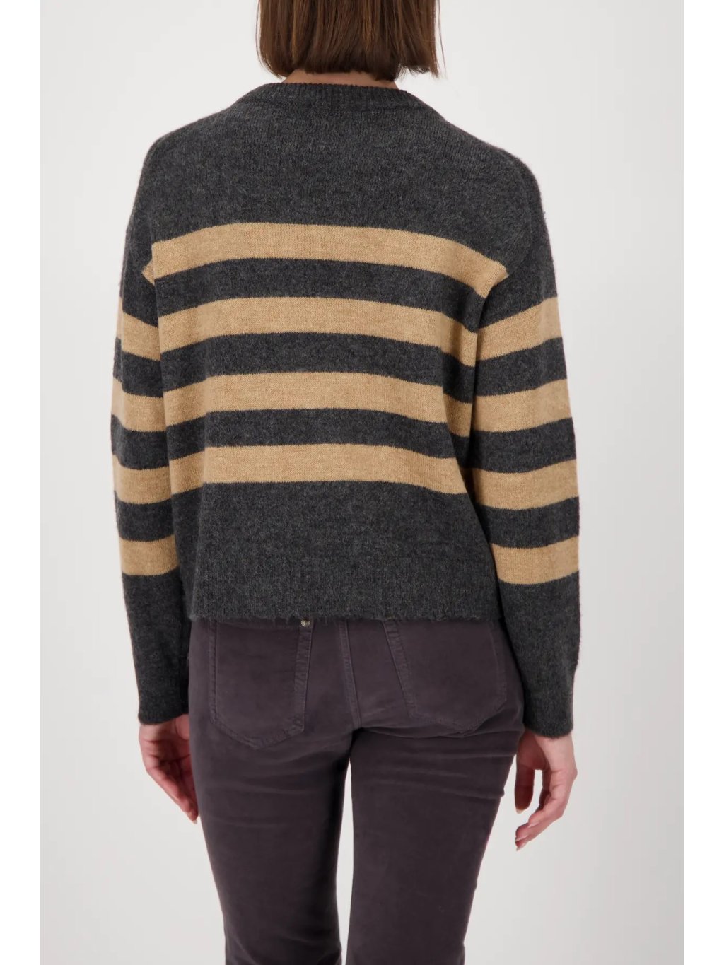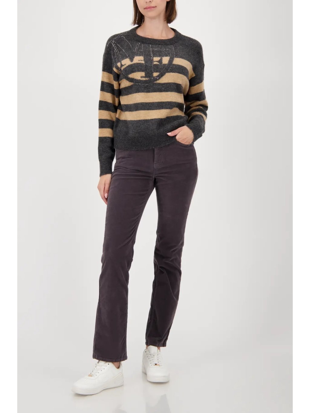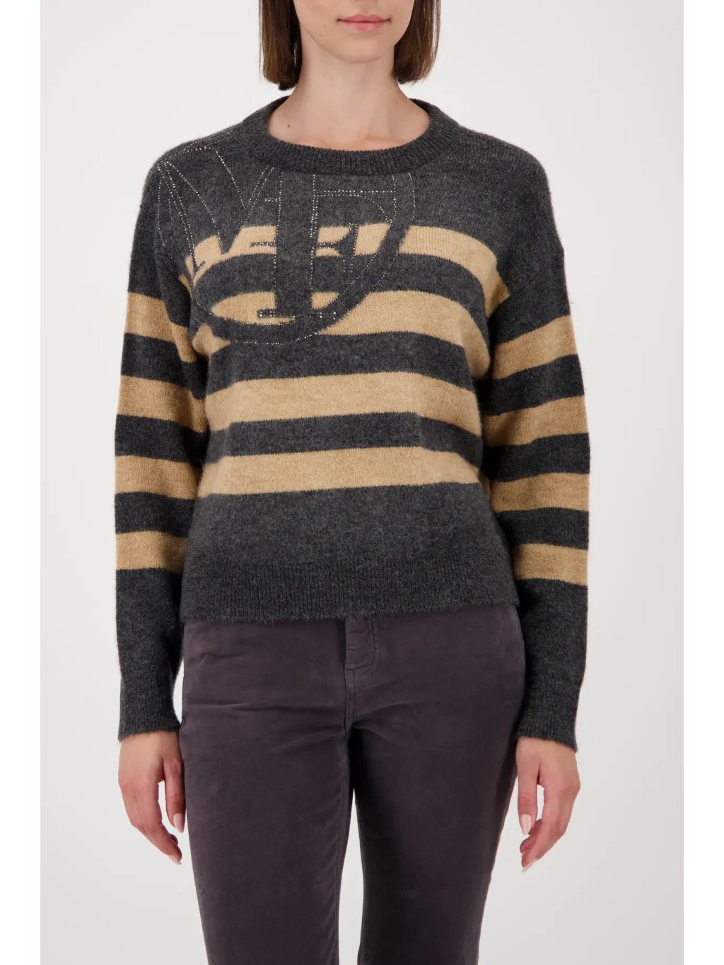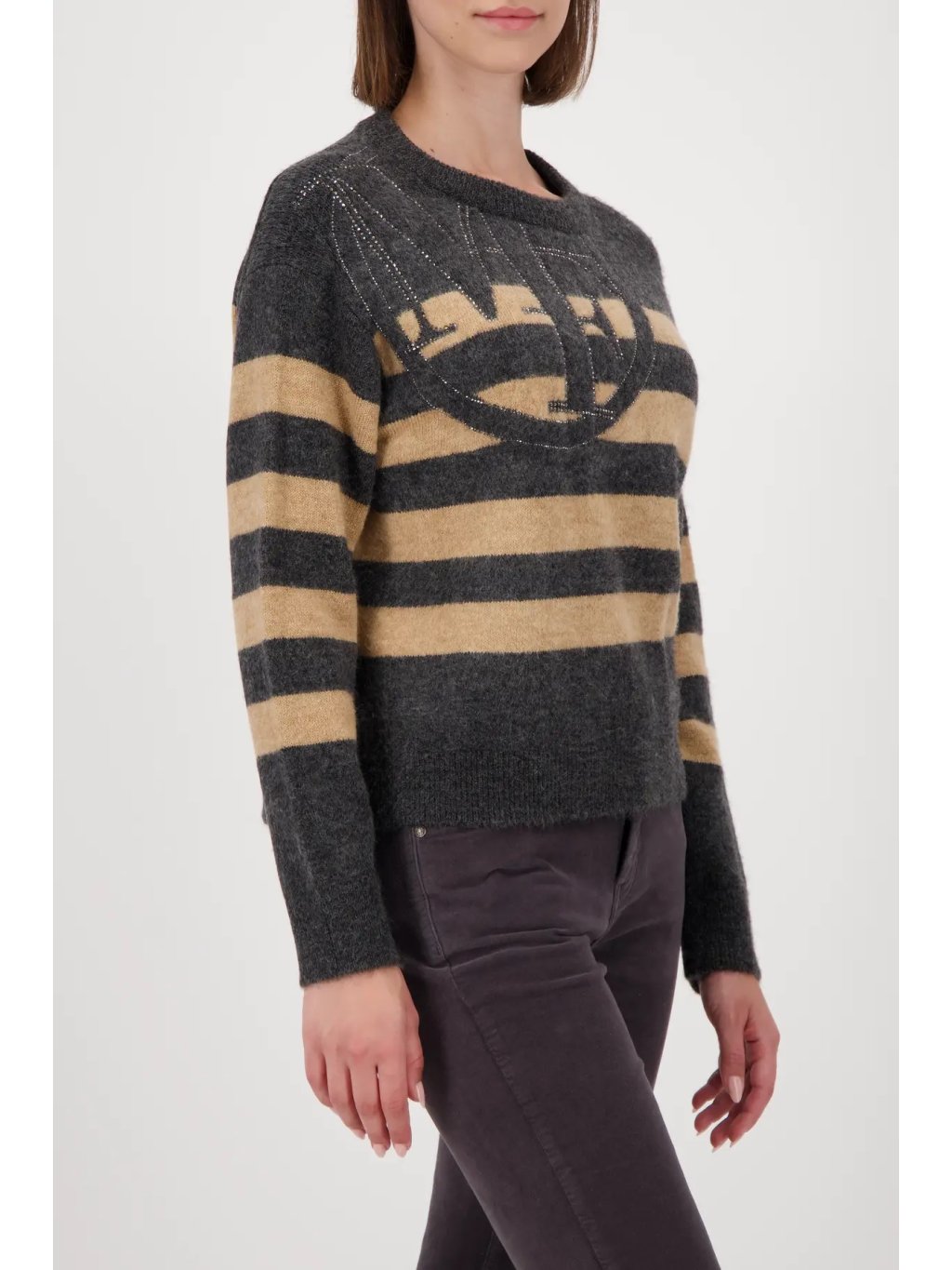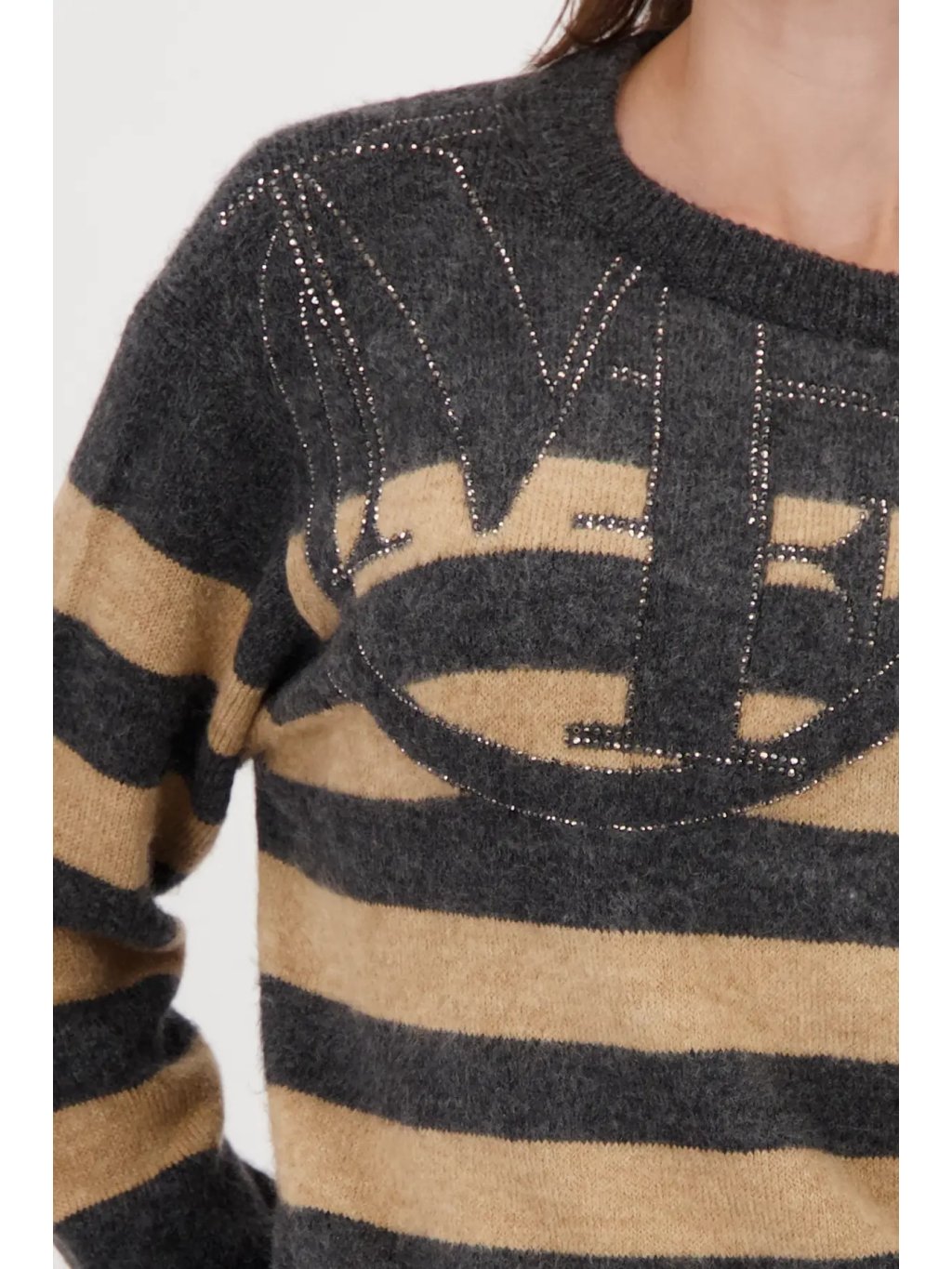 Elegantní svetr s pruhovaným vzorem v jemném odstínu antracit-mandle působí svěže a nadčasově. Zdobený jemnými lesklými kaminky a plastickým logem, které dodávají luxusní detail.