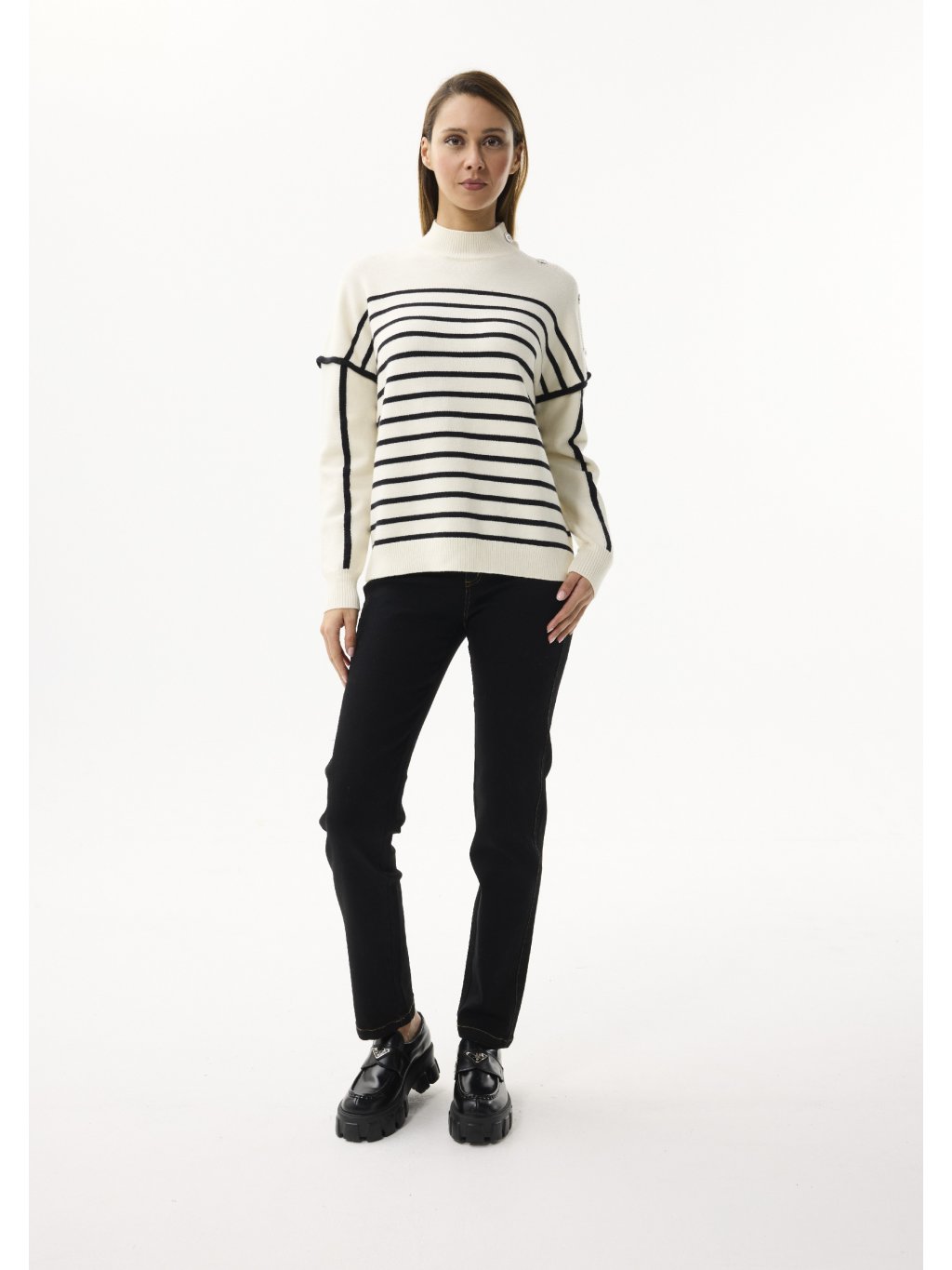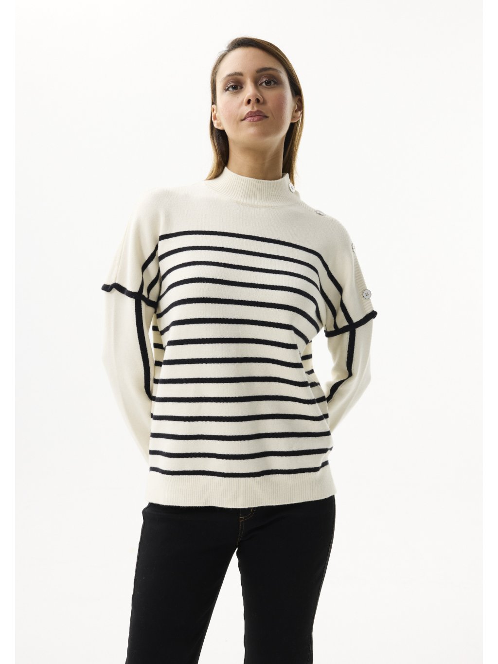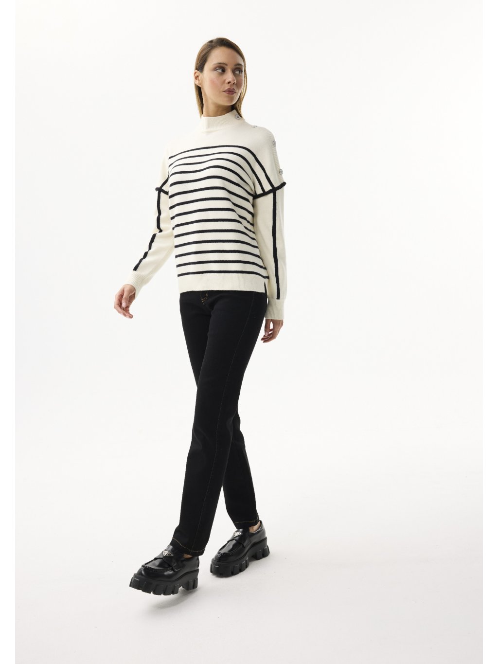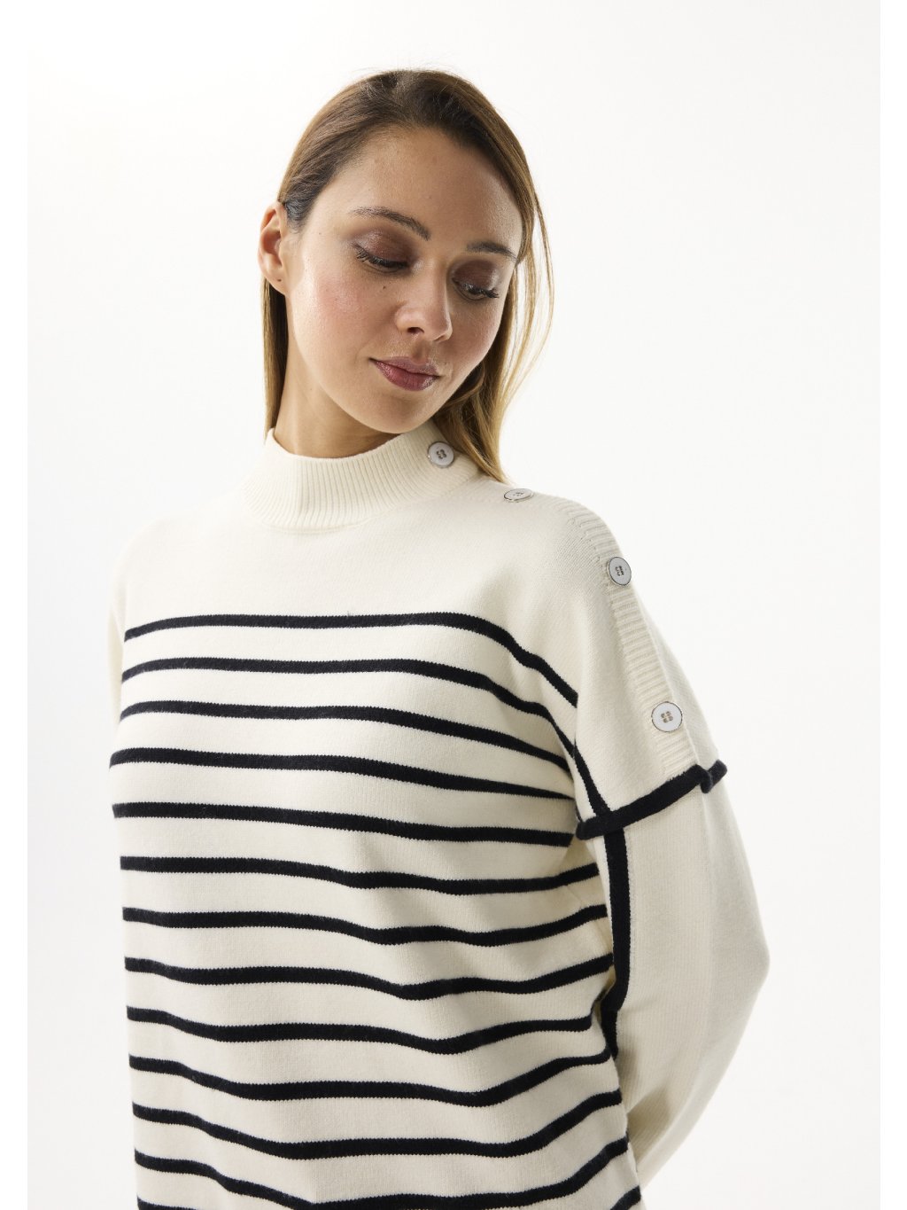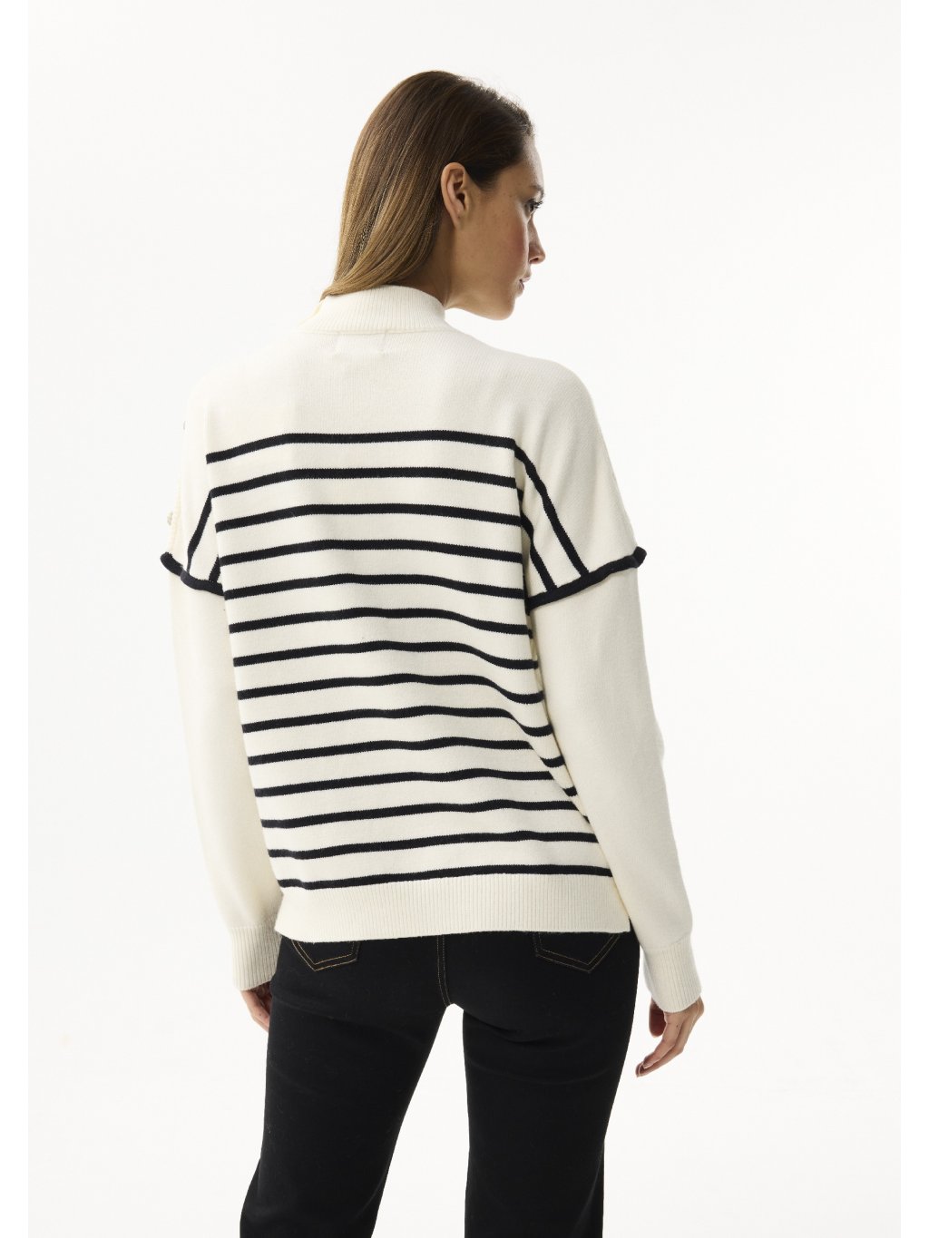 Nadčasový pruhovaný úplet v kominaci bílo a černé barvy. Moderní střih se stojáčkem doplňují ozdobné knoflíky na rameni a rukávech, které dodávají modelu osobitý francouzský šmrnc. Ideální pro elegantní i casual styling.
