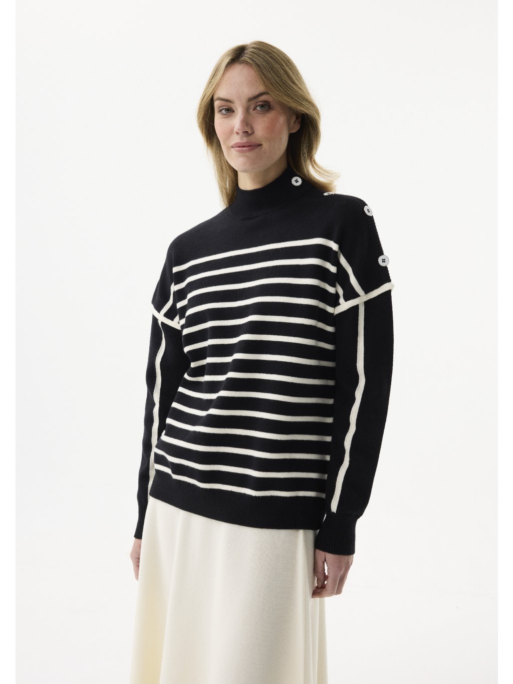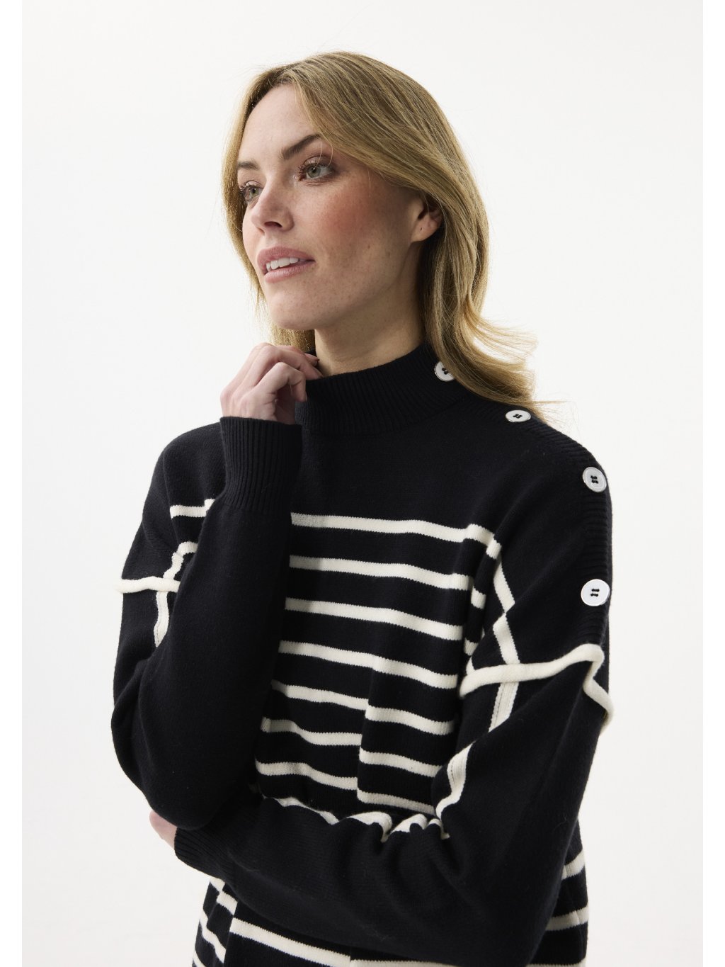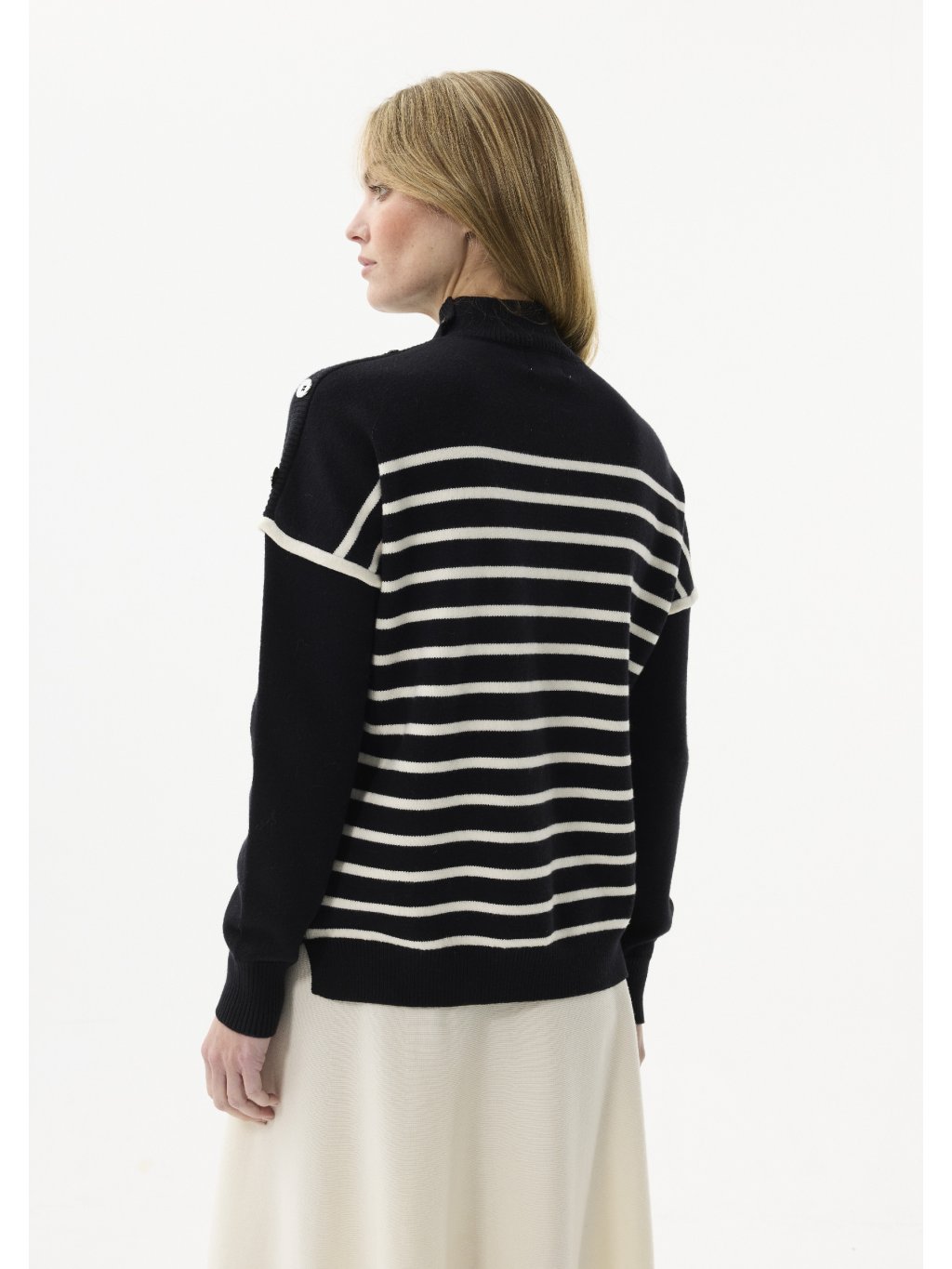 Nadčasový pruhovaný úplet v kombinaci černé a smetanové barvy. Moderní střih se stojáčkem doplňují ozdobné knoflíky na rameni a rukávech,které dodávají modelu osobitý francouzský šmrnc. Ideální pro elegantní i casual styling.