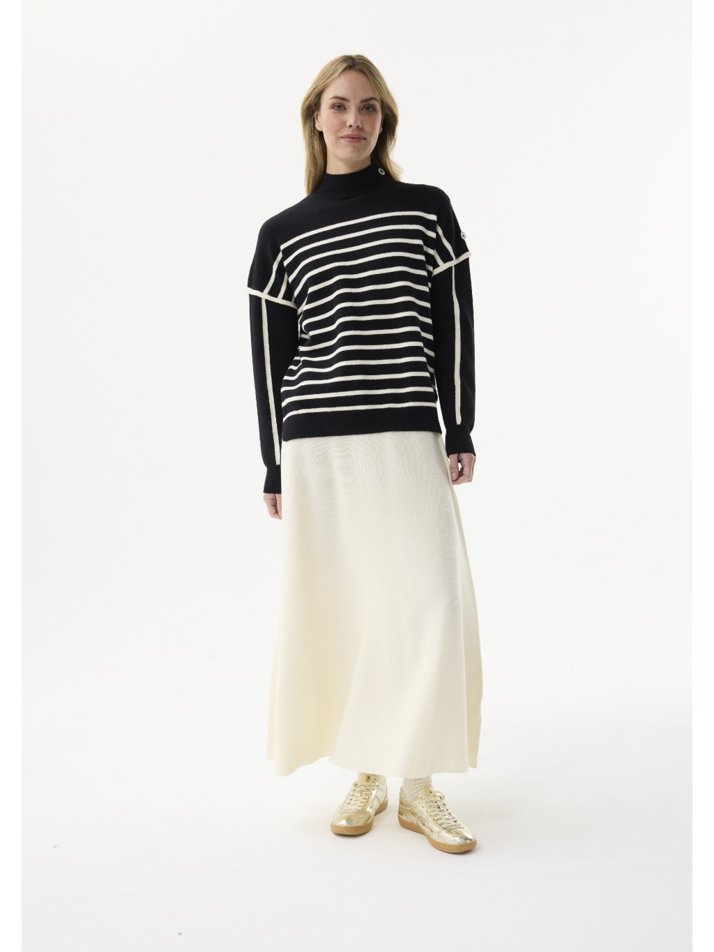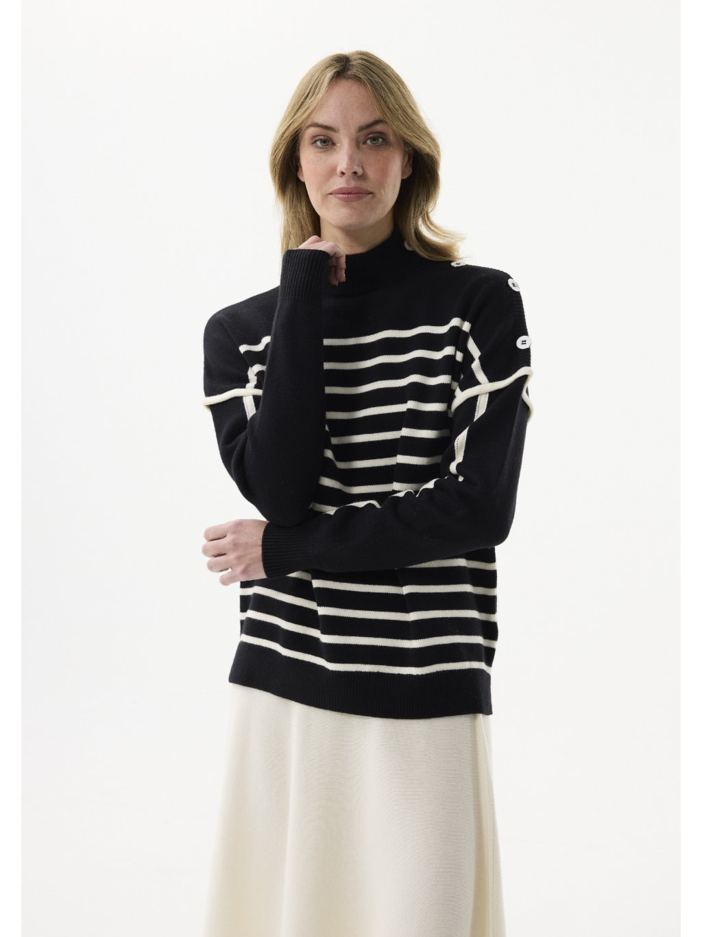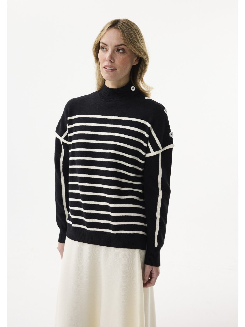Nadčasový pruhovaný úplet v kombinaci černé a smetanové barvy. Moderní střih se stojáčkem doplňují ozdobné knoflíky na rameni a rukávech,které dodávají modelu osobitý francouzský šmrnc. Ideální pro elegantní i casual styling.