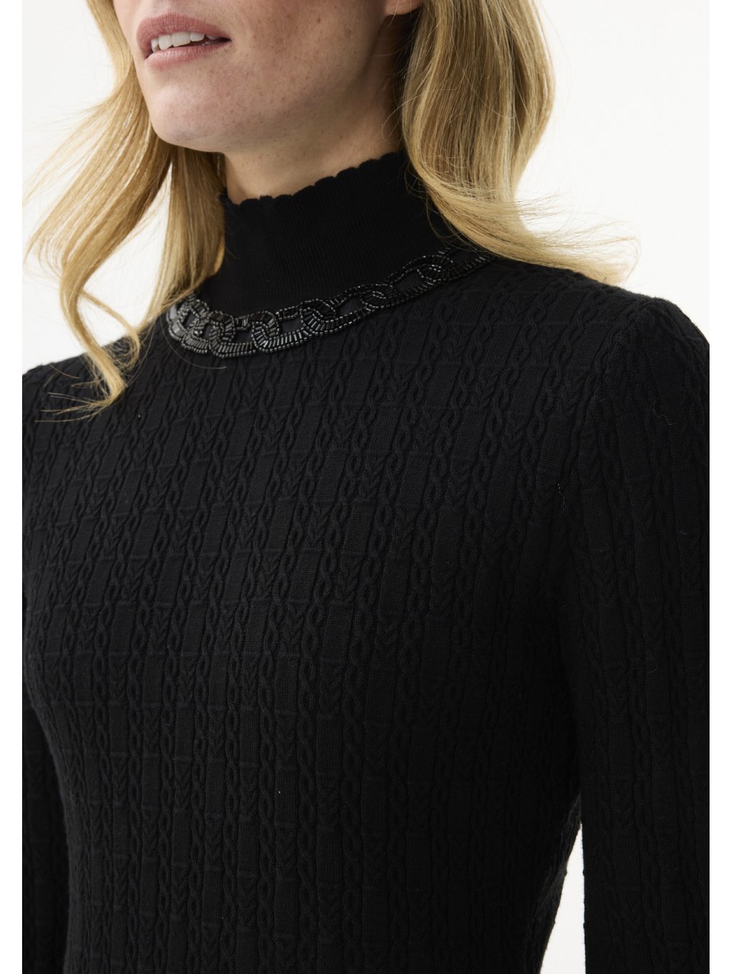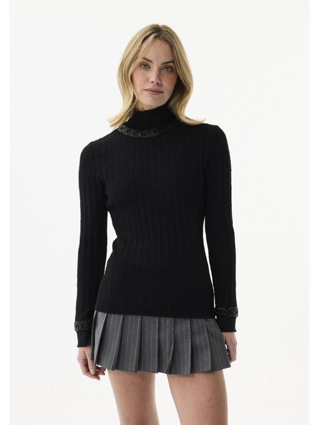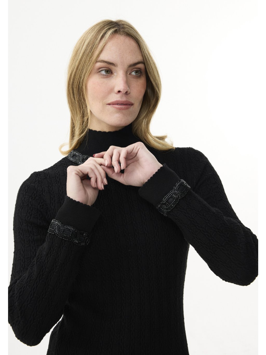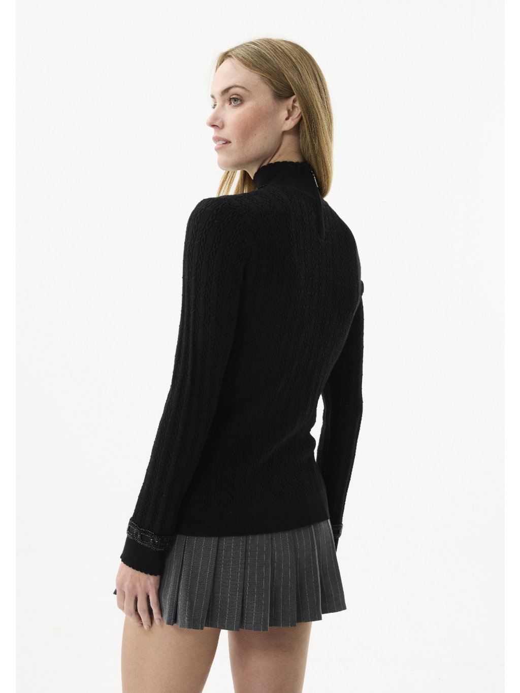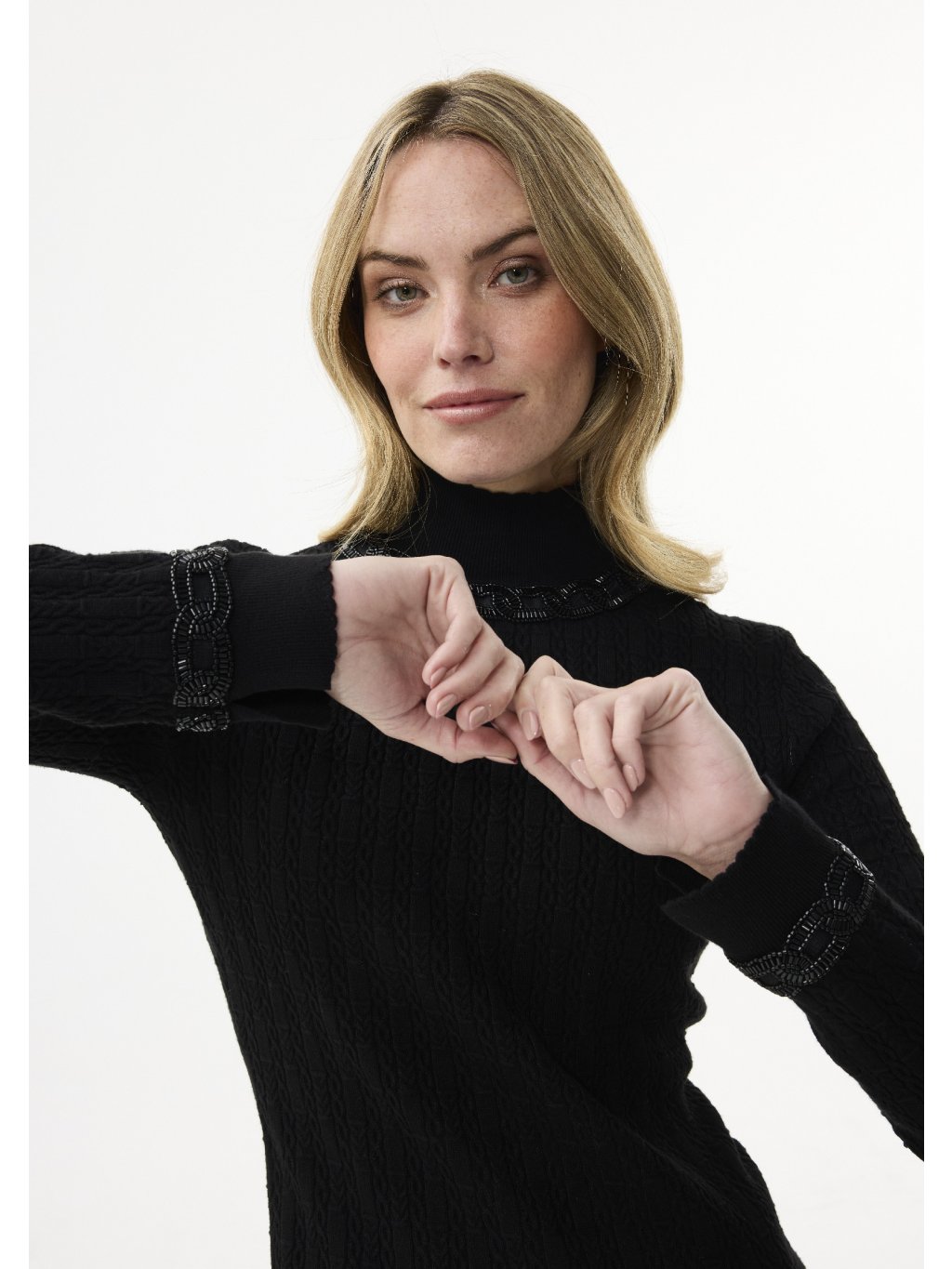 Černý rolák z jemného úpletu a ozdobným zipem na zadním díle u krku , který kombinuje čistotu střihu s precizním zdobením. Rukávy jsou zakončeny manžetami s elegantní výšivkou z perliček, které dodávají celému modelu ženský, rafinovaný vzhled.