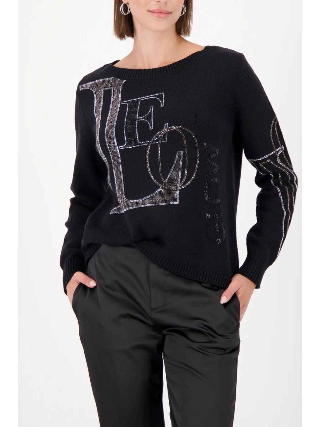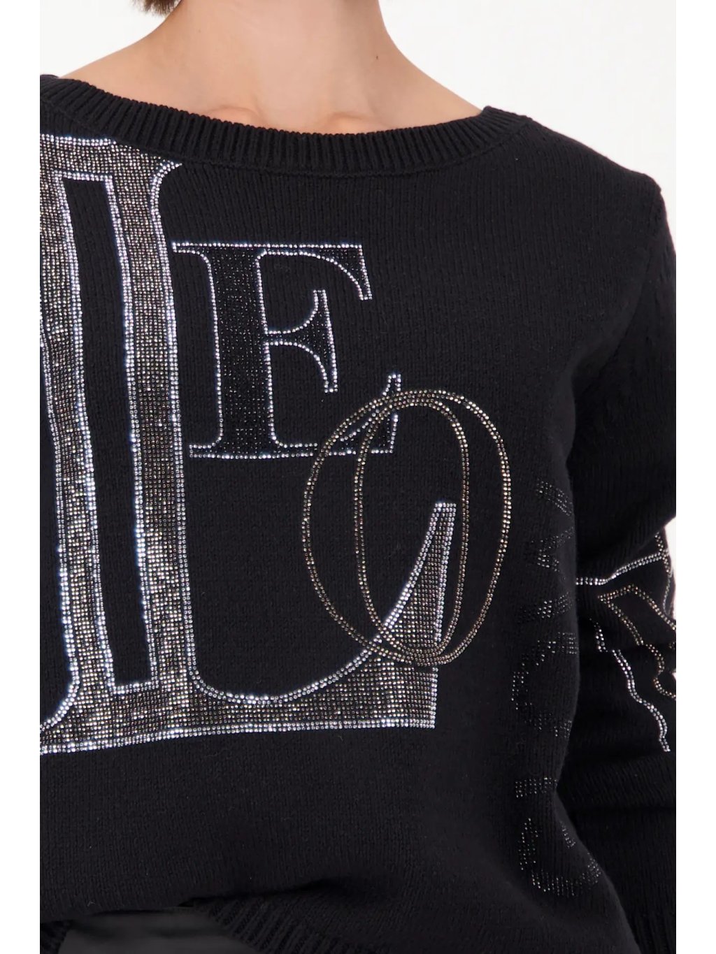 Slušivý černý svetr z kvalitní bavlněné směsi upoutá na první pohled výrazným nápisem zdobený třpytivými kamínky na předním díle i rukávech. Pohodlný střih s kulatým výstřihem a jemným úpletem poskytuje maximální komfort, zatímco třpytivé detaily dodávají modelu jedinečný šarm .