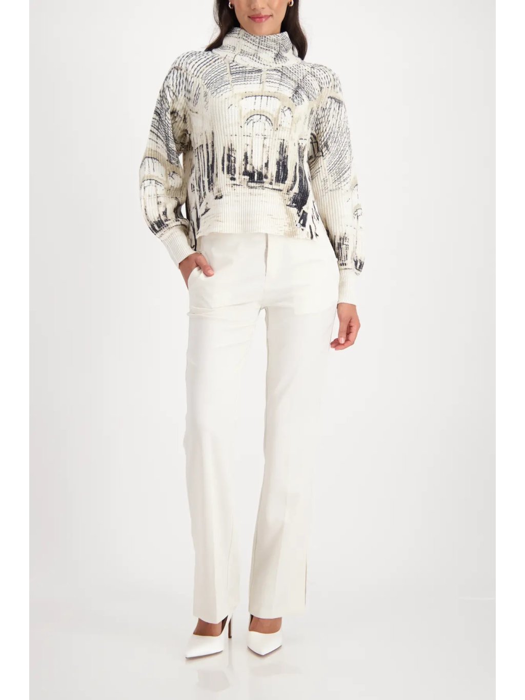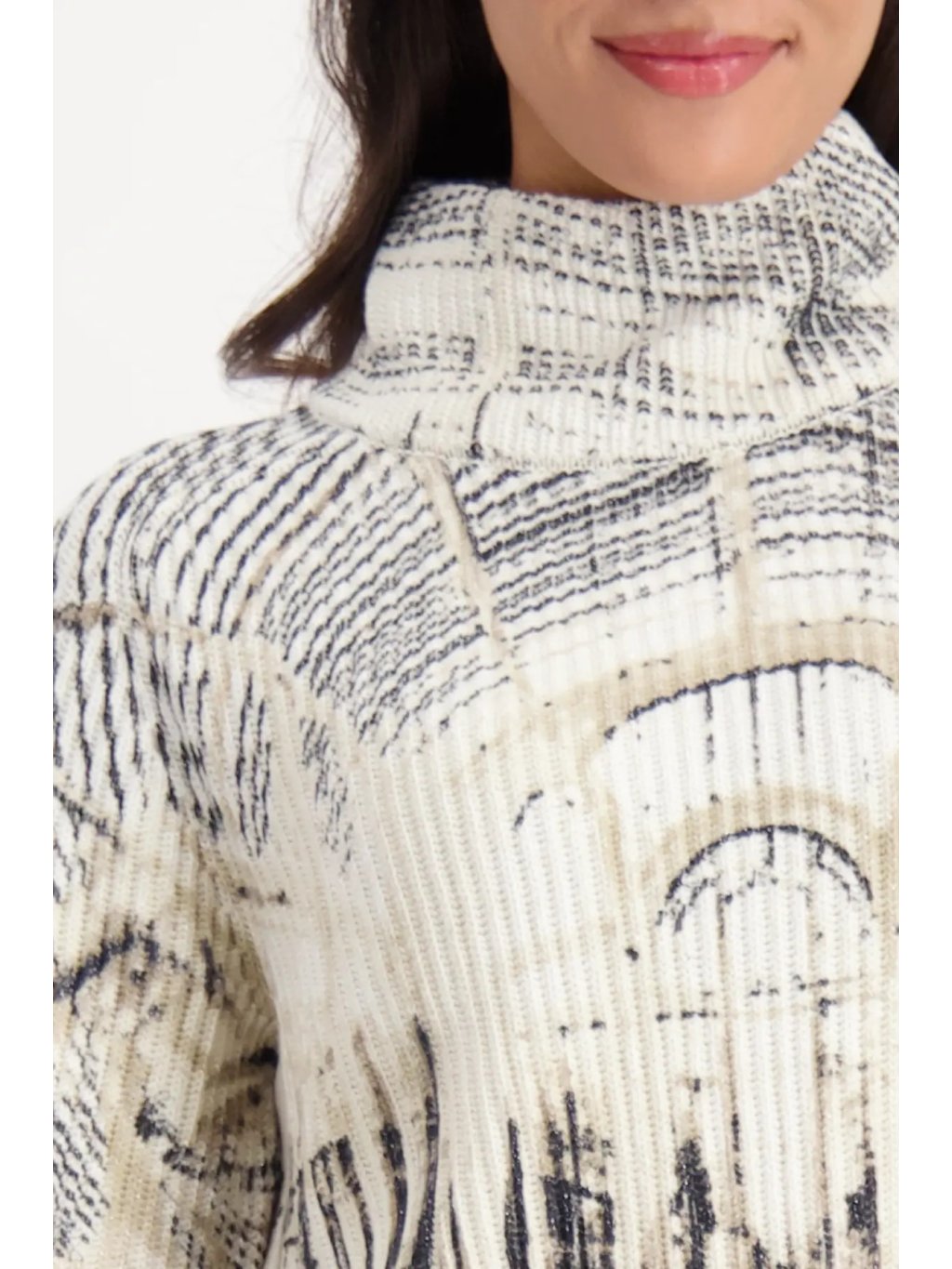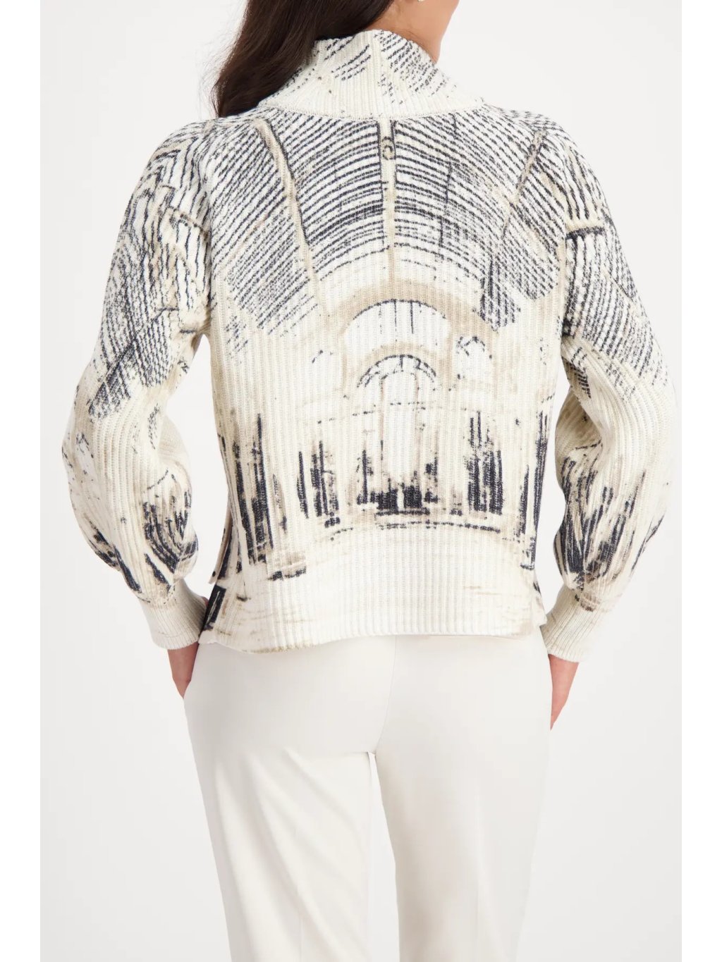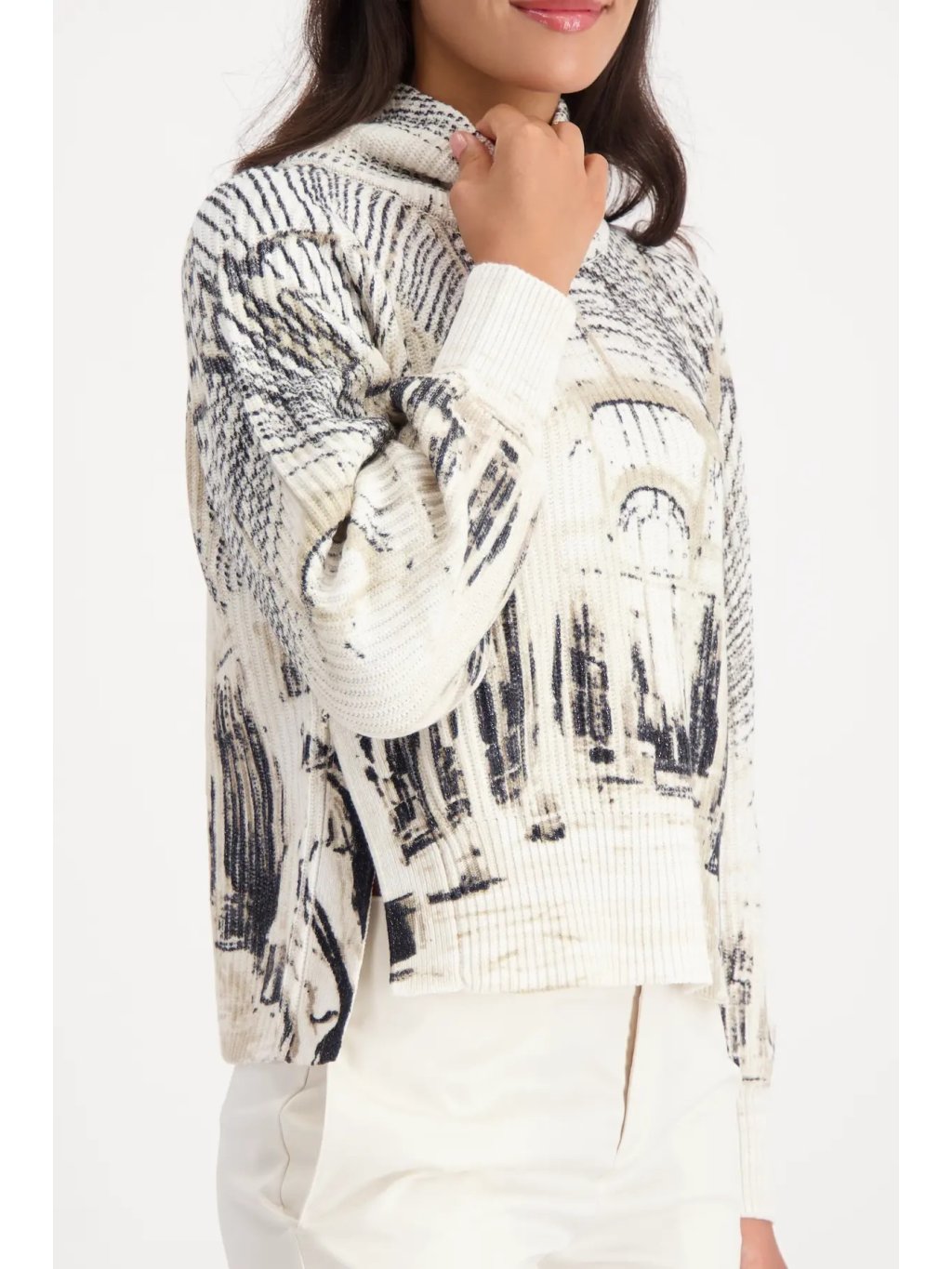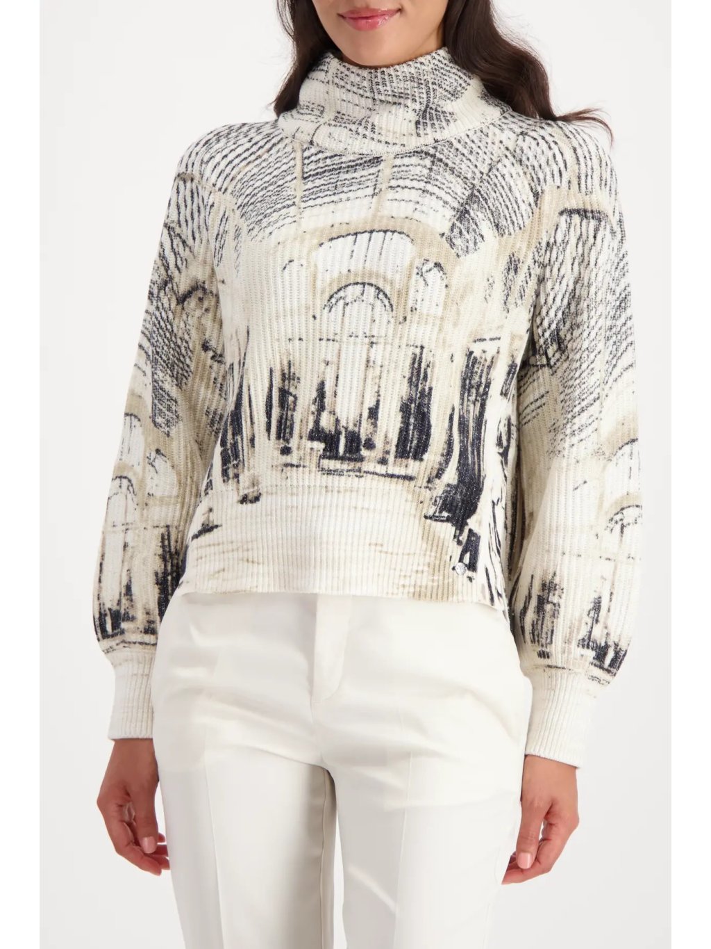 Elegantní svetr z kvalitní směsi bavlny a lurexu zaujme uměleckým potiskem architektury v odstínech mandlové a černé. Jemný lesk vláken dodává modelu sofistikovaný vzhled, zatímco stojáček a mírně spadlá ramena podtrhují moderní střih.