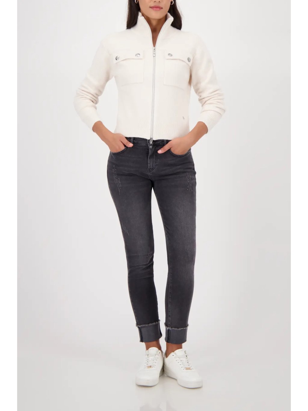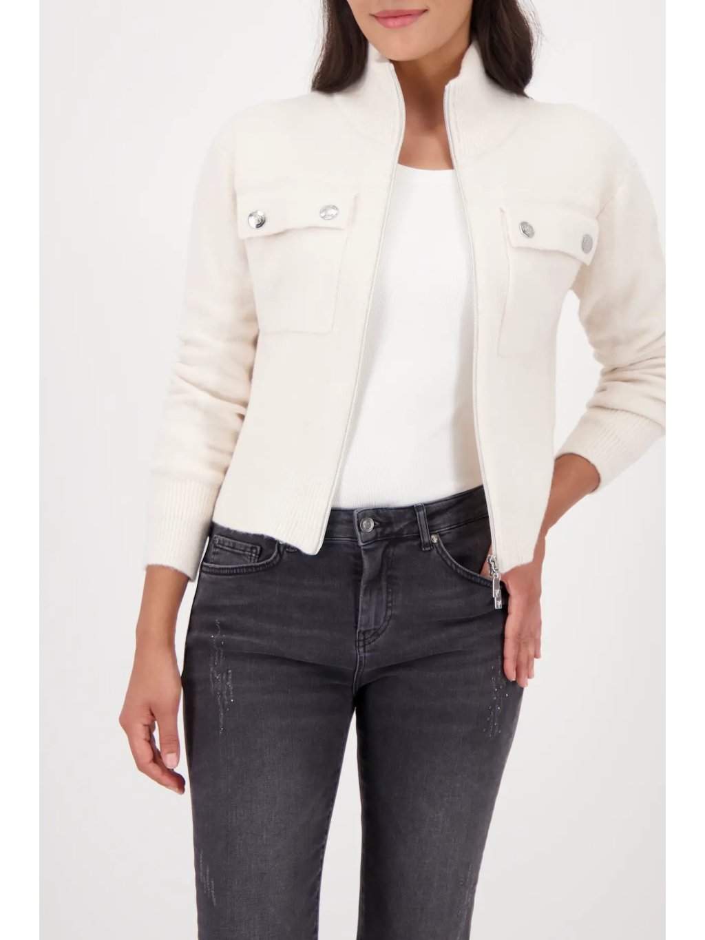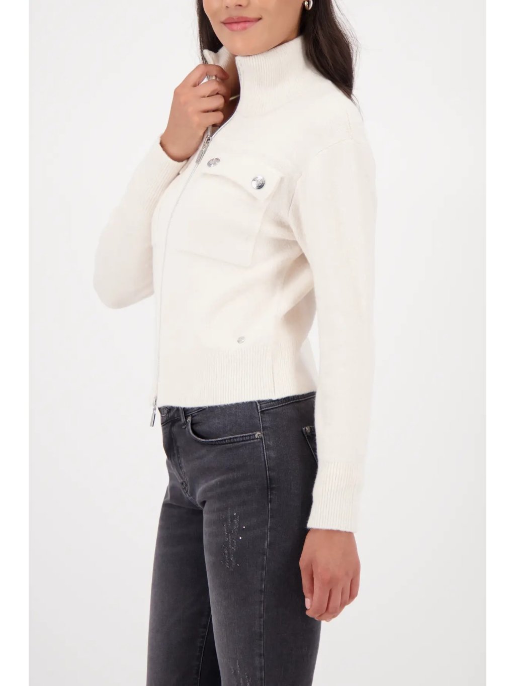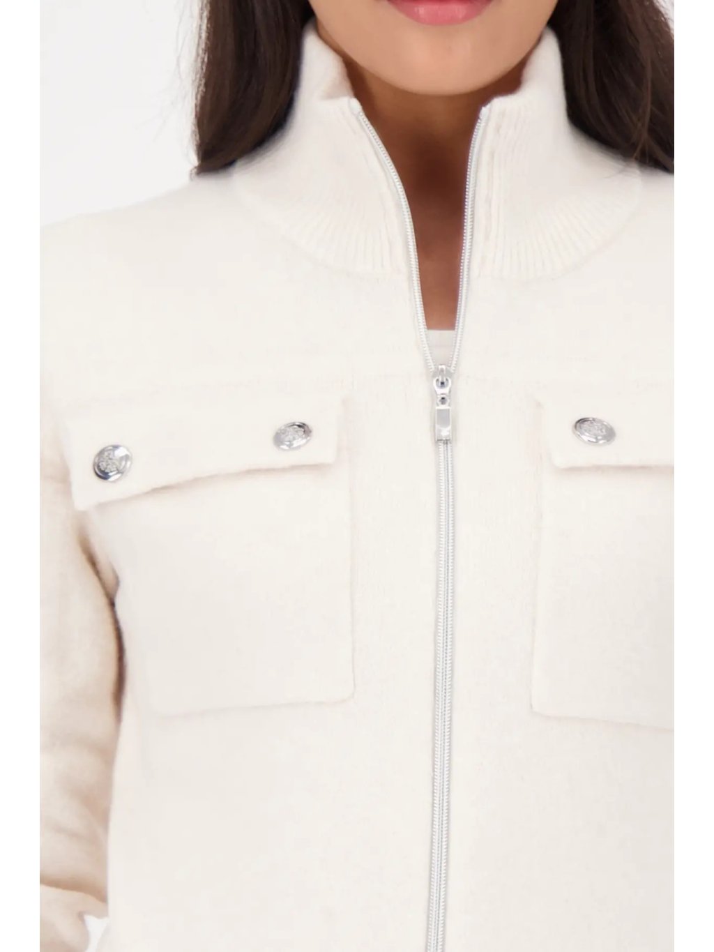 Elegantní svetrová bunda se stojáčkem v jemném odstínu almond spojuje eleganci saka a pohodlí svetru. Zaujme jemnou strukturou úpletu, kapsami s patkami a praktickým 2cestným zipem, který umožňuje různé způsoby zapínání.