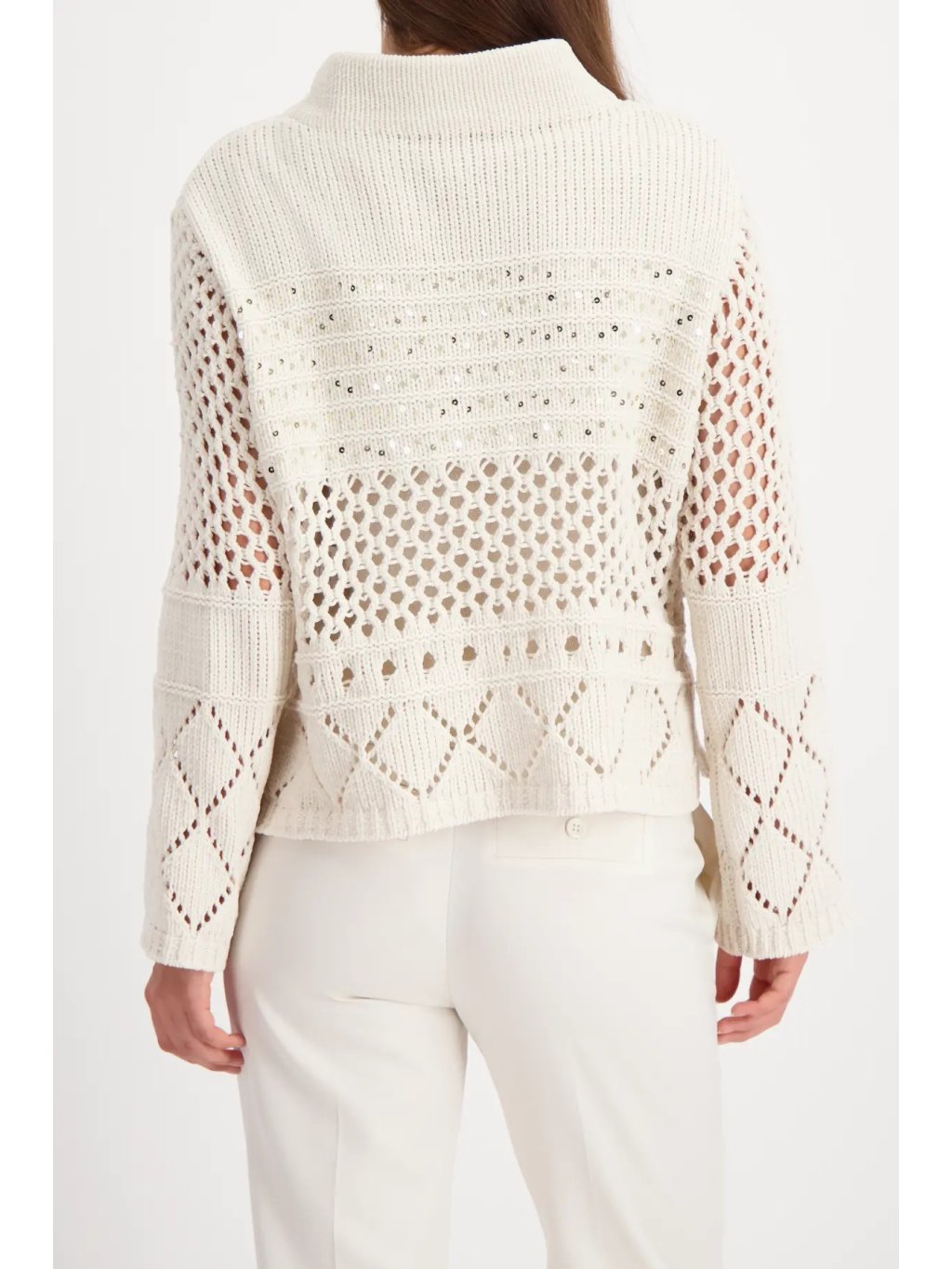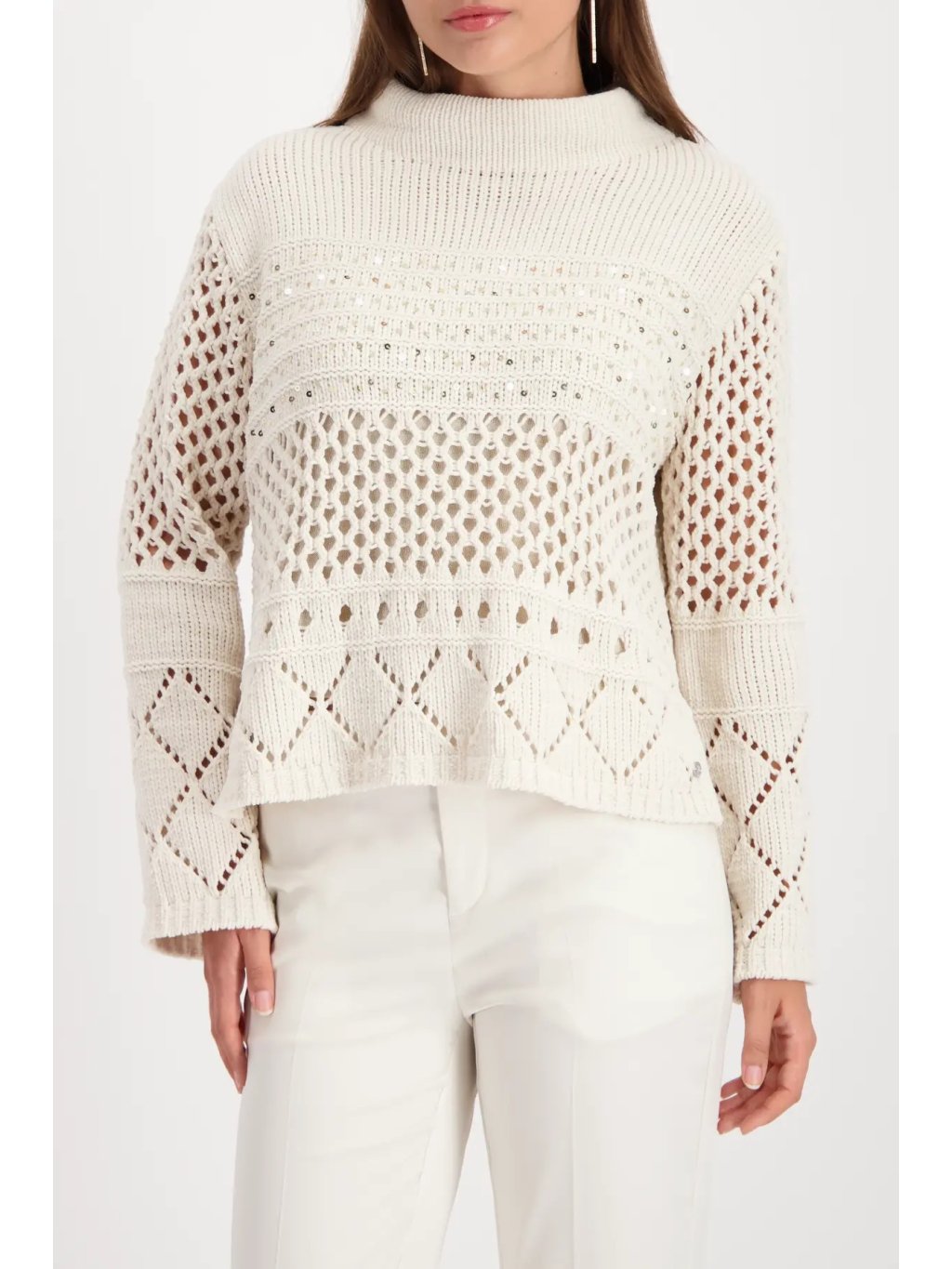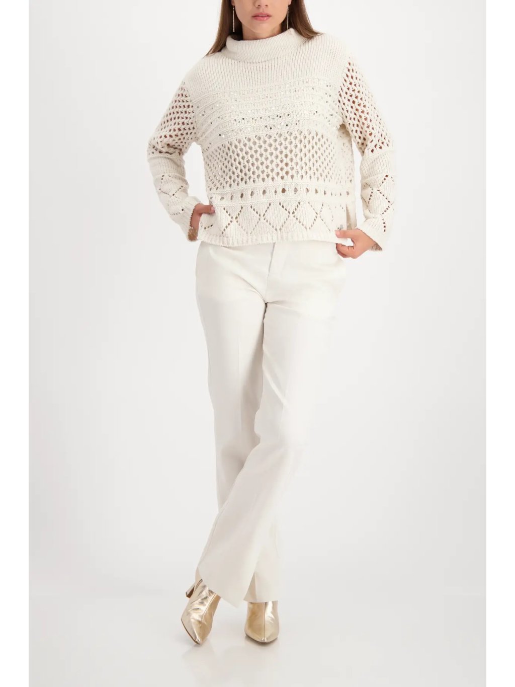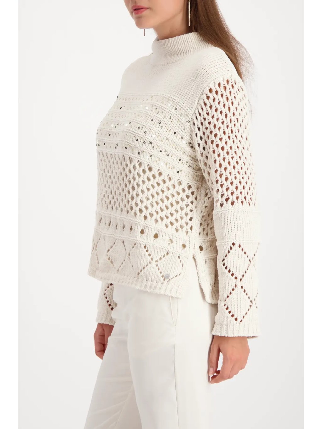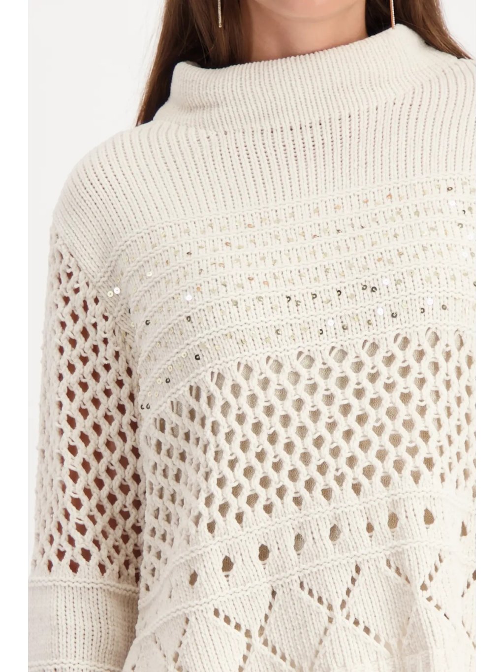 Moderní pletený svetr v odstínu almond zaujme krásným ajour vzorem - tedy jemným dírkovaný / krajkovým pletením, které dodává celému modelu lehkost, vzdušnost a ženský výraz. Vrchní část je z hebké chenille příze s velmi měkkým omakem, spodní část tvoří prolamovaný vzor doplněný o decetní třpytivé detaily. Stojáček elegantně rámuje krk a volnější střih působí módně a uvolněně.