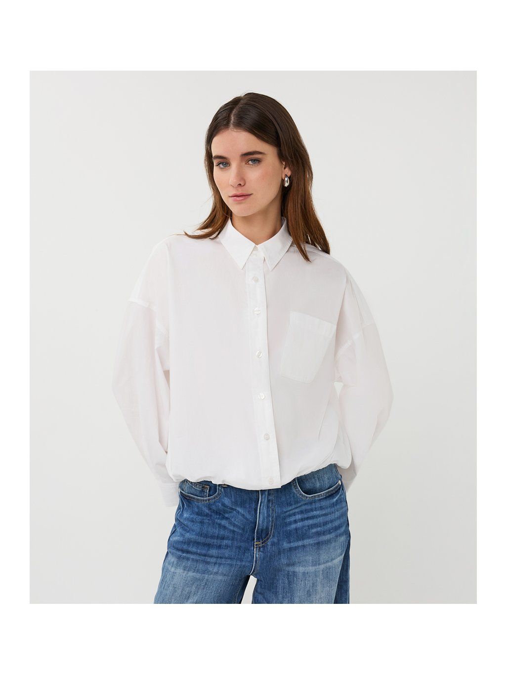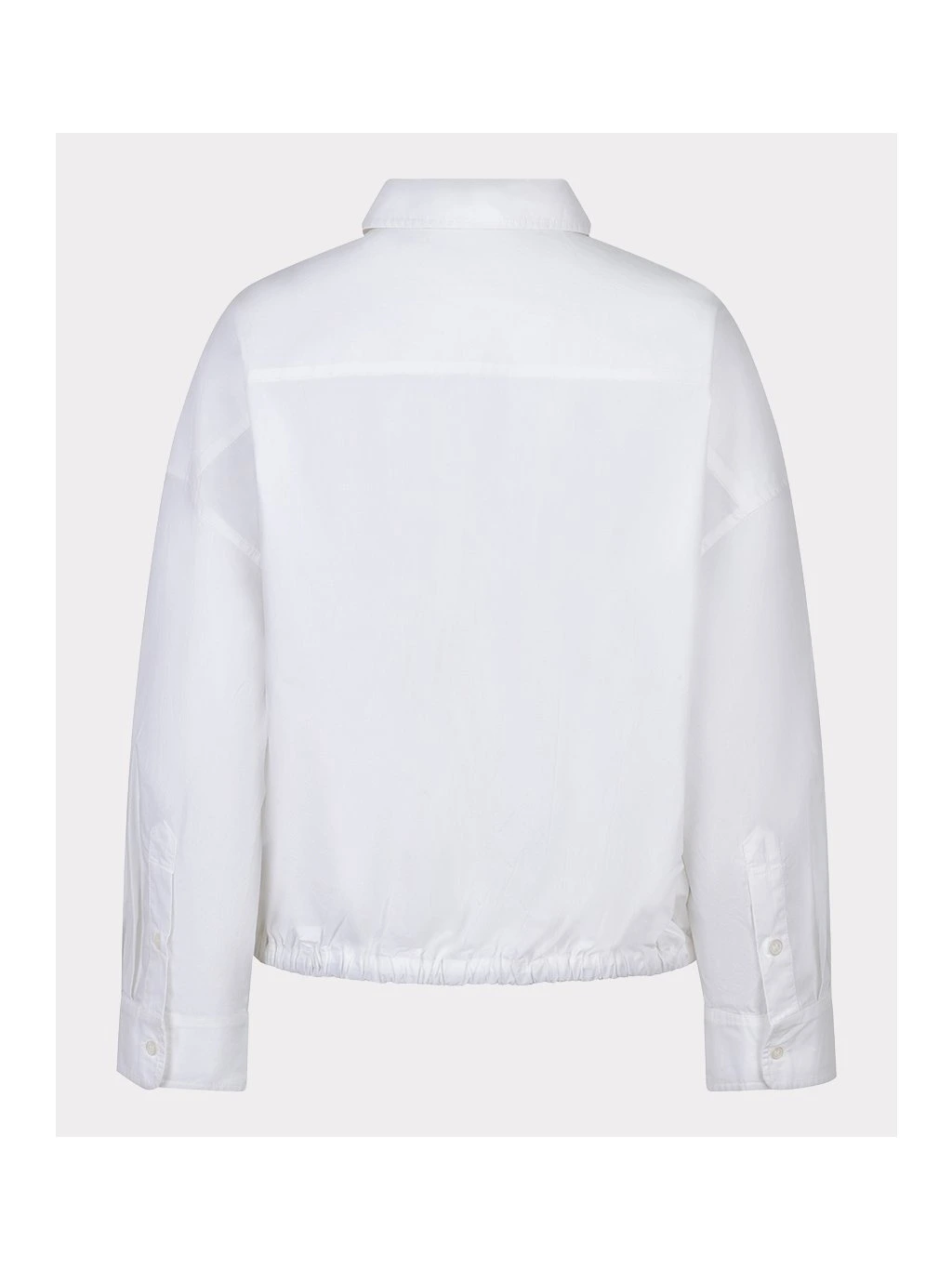 Košile má klasický límeček, zapínání na knoflíky a praktické zakončení do pružné gumy v pase, díky kterému krásně sedí na postavě a jemně ji tvaruje. Tento detail dodává modelu moderní vzhled a zároveň zajišťuje pohodlí při nošení – košile se nevytahuje a drží tvar.