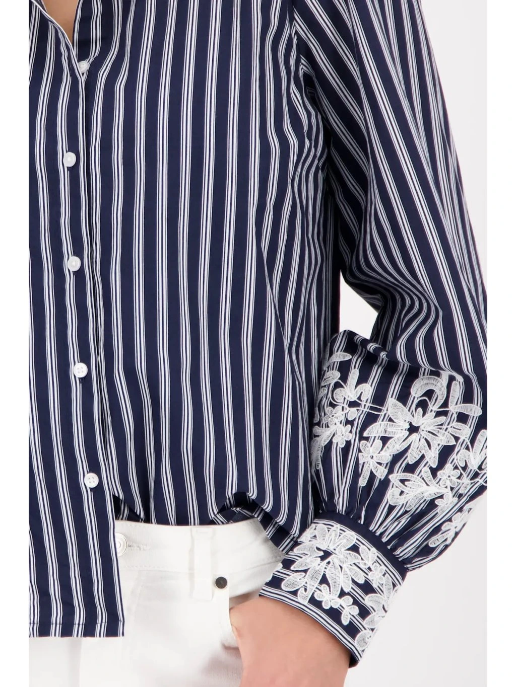 Tato dámská halenka v kombinaci tmavě modré a bílé působí velmi žensky a elegantně. Jemný proužkový vzor dodává modelu nadčasový charakter, zatímco krajkové zdobení rukávů přináší lehký italský šmrnc , který zaujme na první pohled.