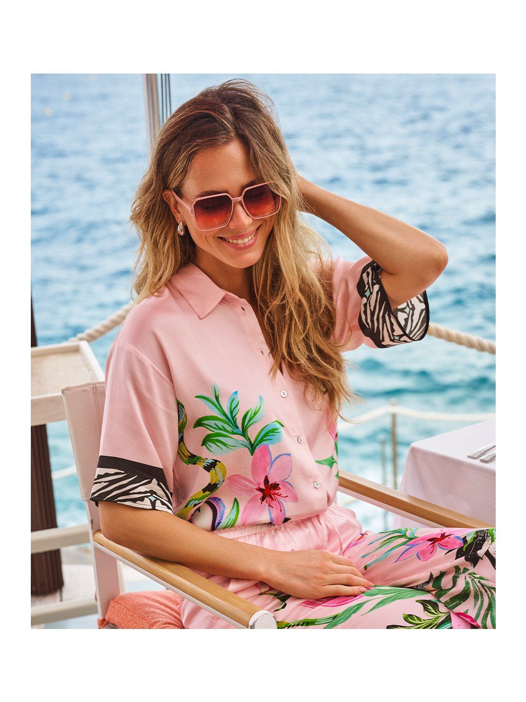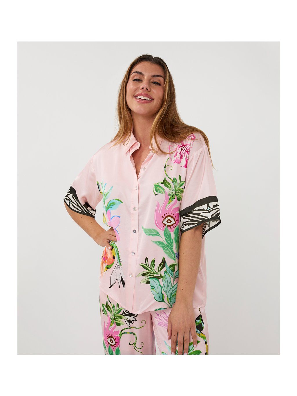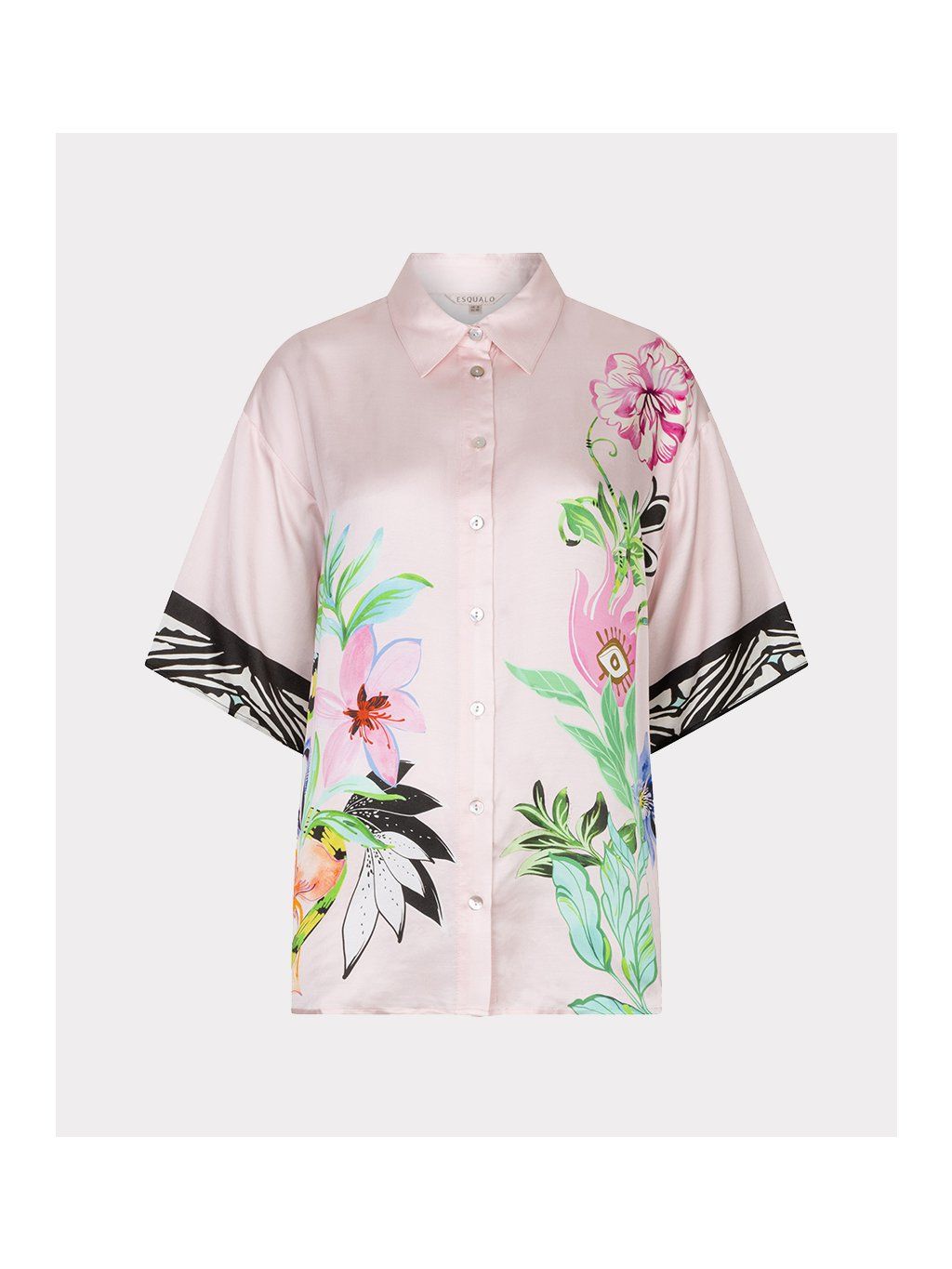Lehká dámská halenka značky EsQualo s originálním „Mystic“ potiskem zaujme na první pohled svým hravým a uměleckým designem. Jemný růžový podklad doplňují výrazné motivy květin, listů a detailů, které dodávají outfitu osobitost a šmrnc.