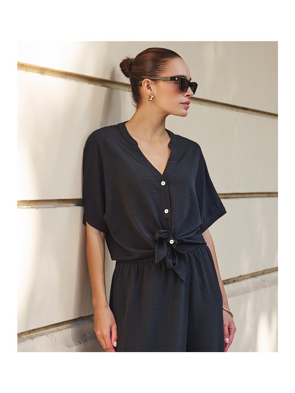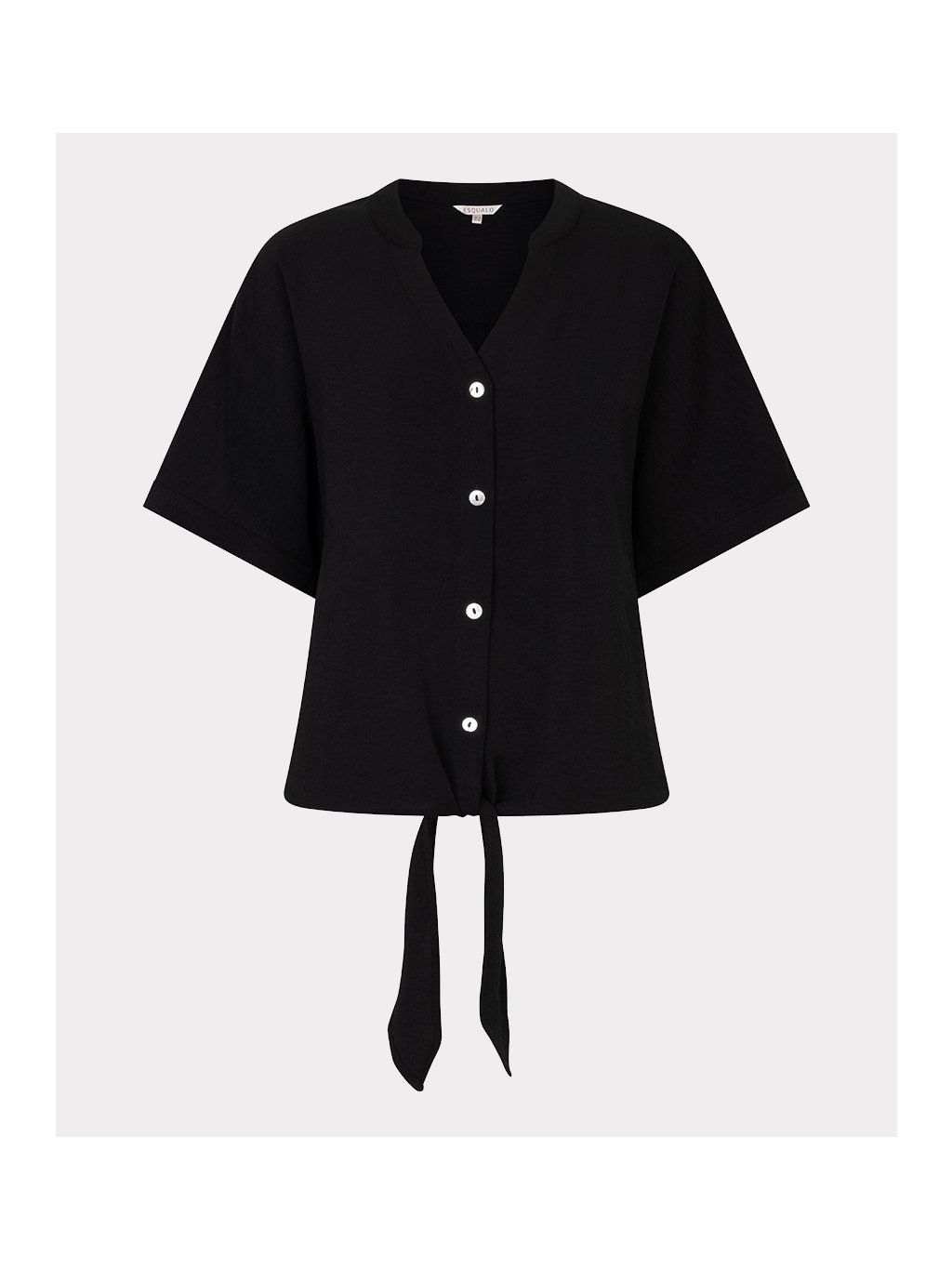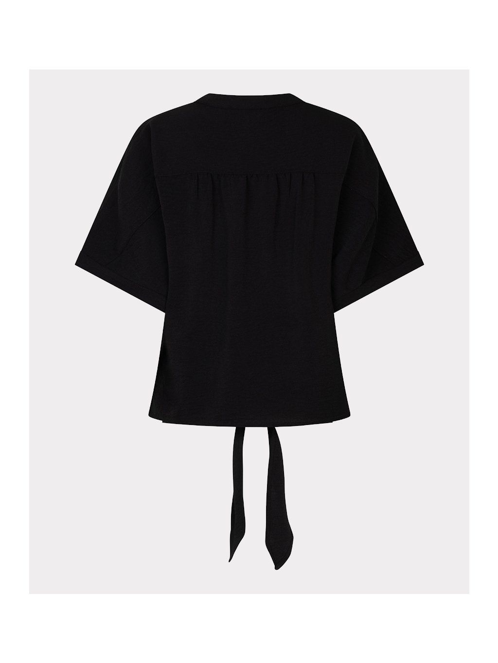 Elegantní halenka značky EsQualo v nadčasové černé barvě zaujme svým jednoduchým, ale velmi ženským designem. Přední část na zavazování vytváří jemný uzel, který krásně zvýrazní siluetu a dodá outfitu lehkost.