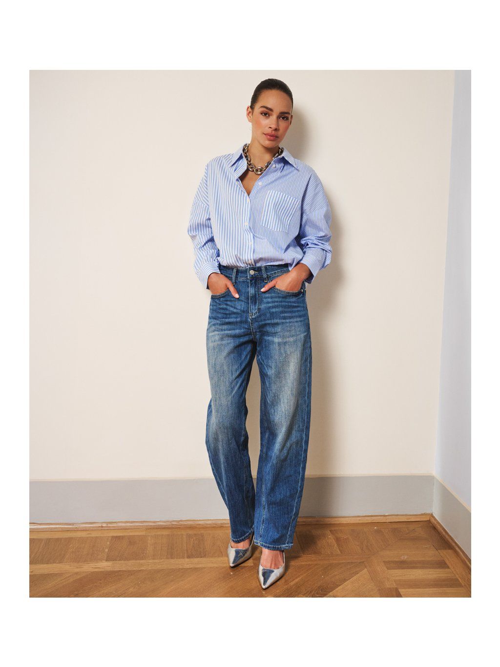 Klasický modrý denim působí nadčasově a snadno se kombinuje s košilemi, halenkami, svetry i saky. Džíny skvěle fungují jak v ležérním outfitu s teniskami, tak i v elegantnějším stylu s balerínami nebo lodičkami.