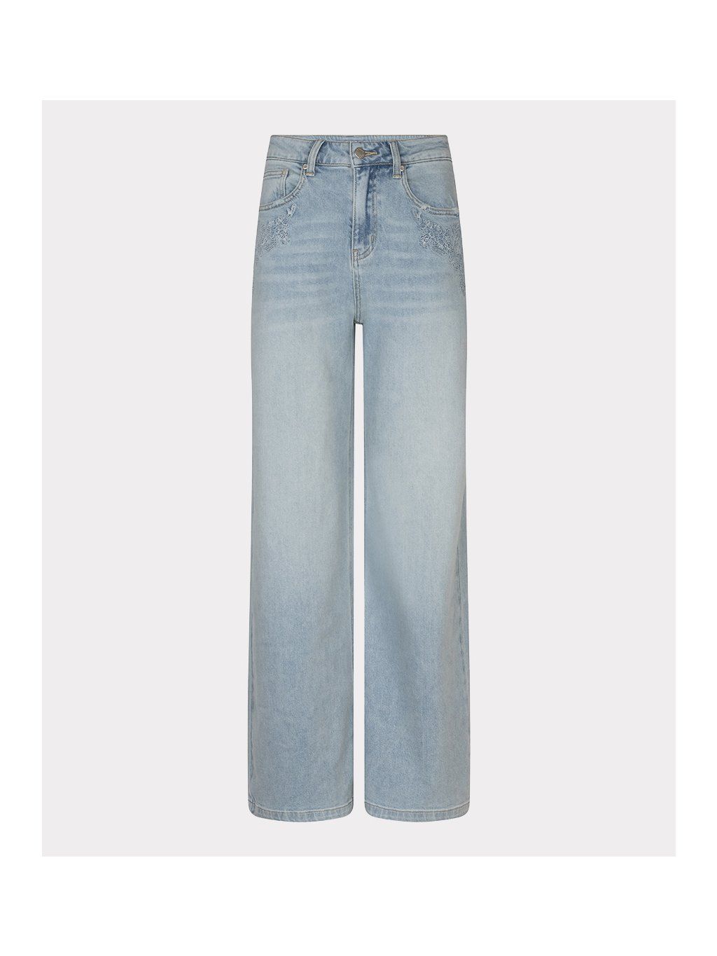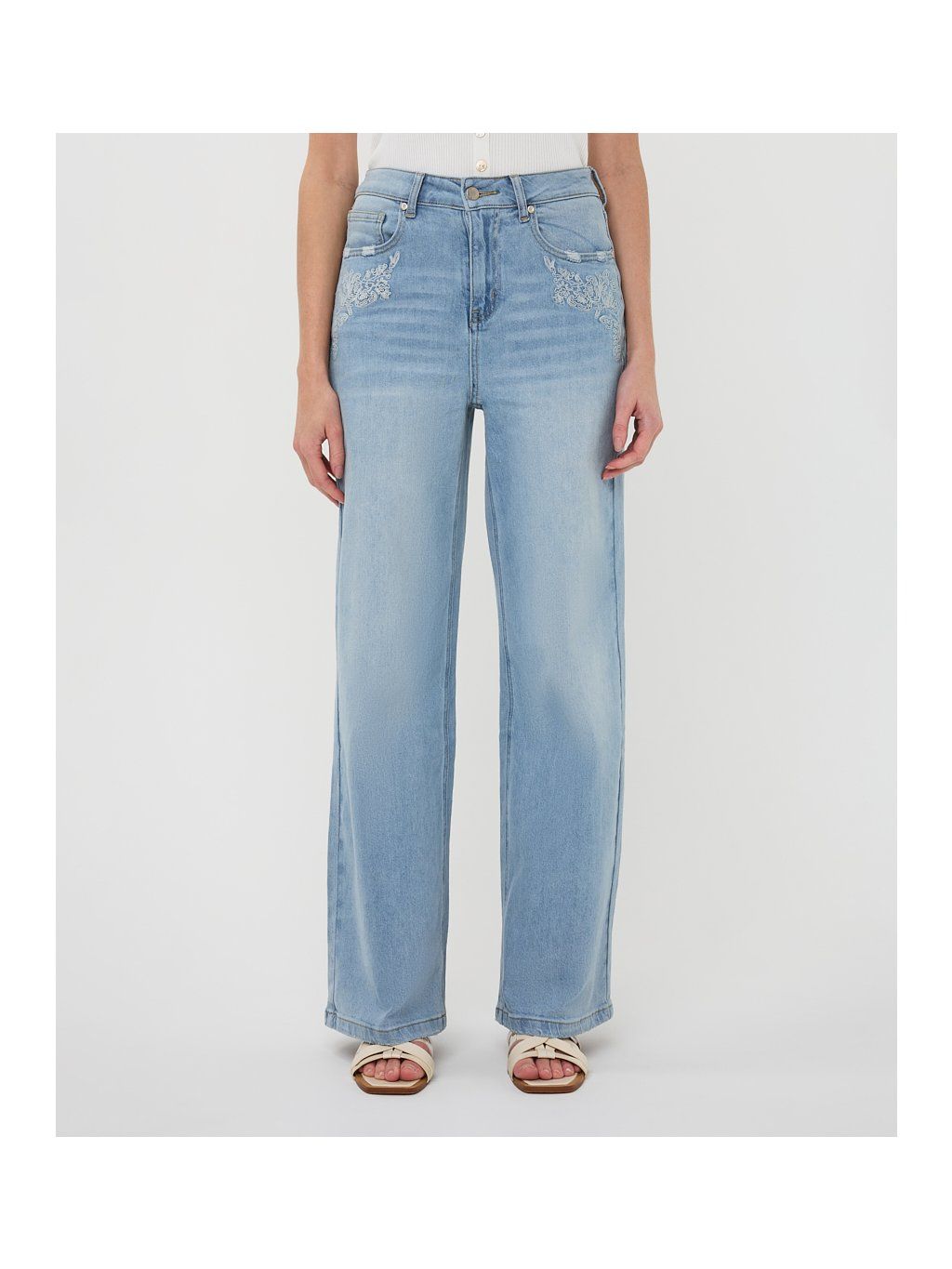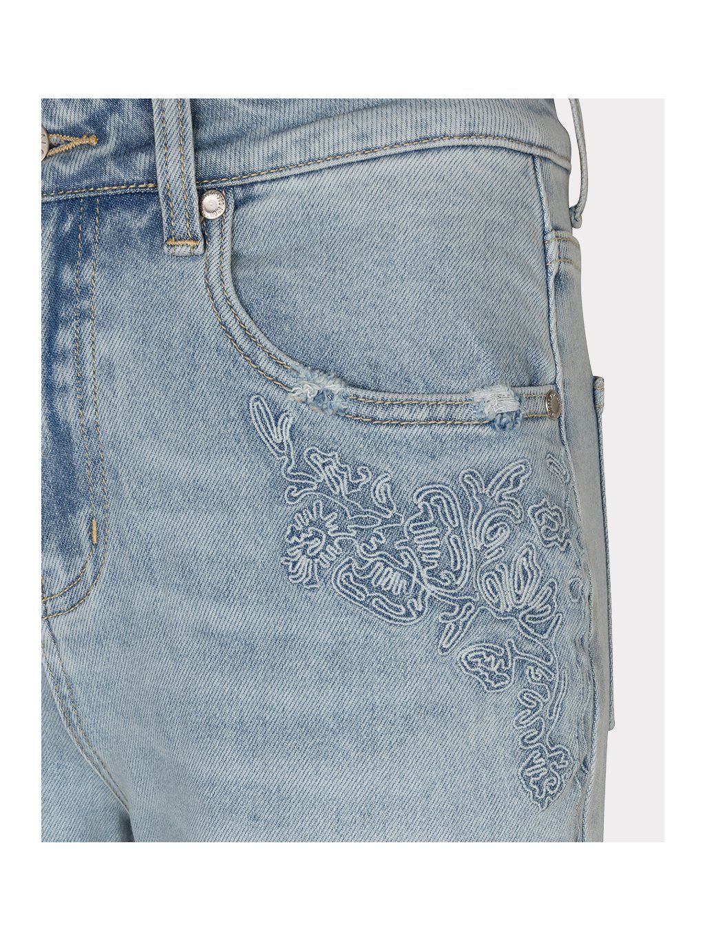 Stylové džíny značky EsQualo v jemném světle modrém odstínu zaujmou na první pohled elegantní výšivkou v oblasti kapes, která jim dodává ženský a originální detail.