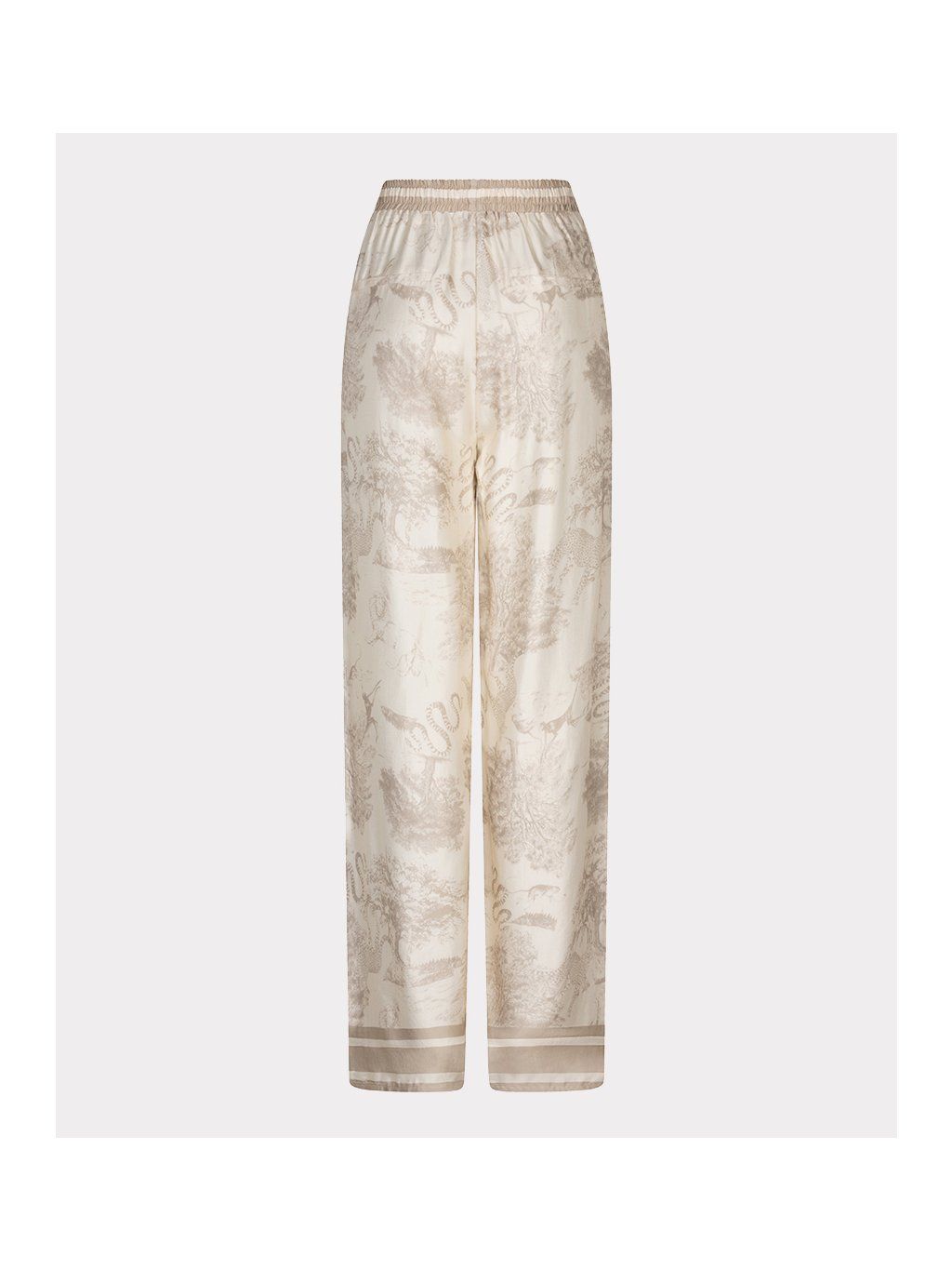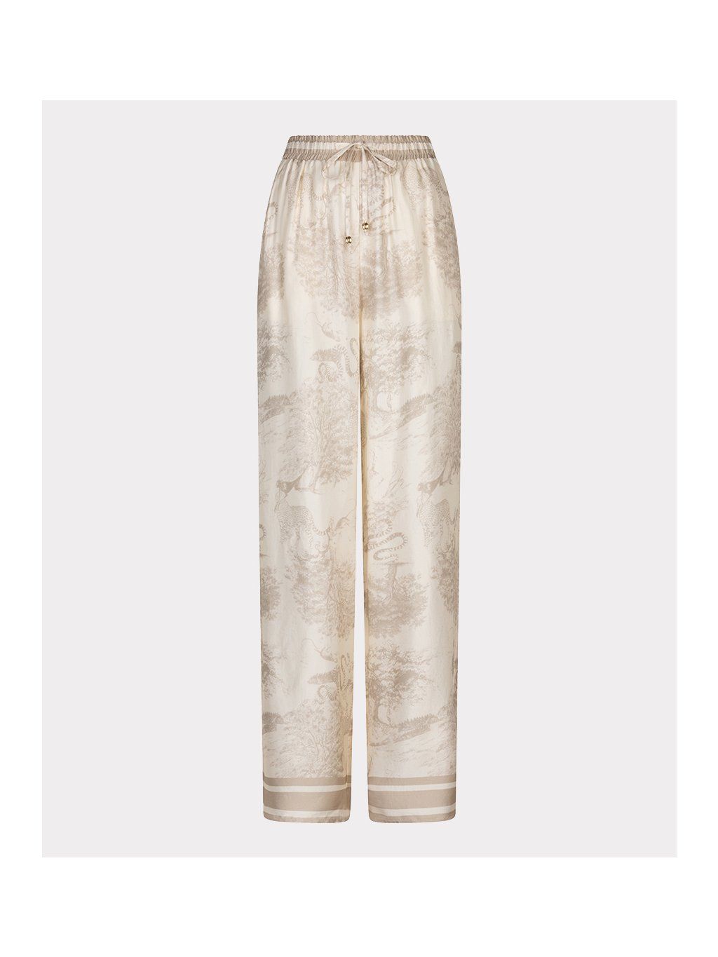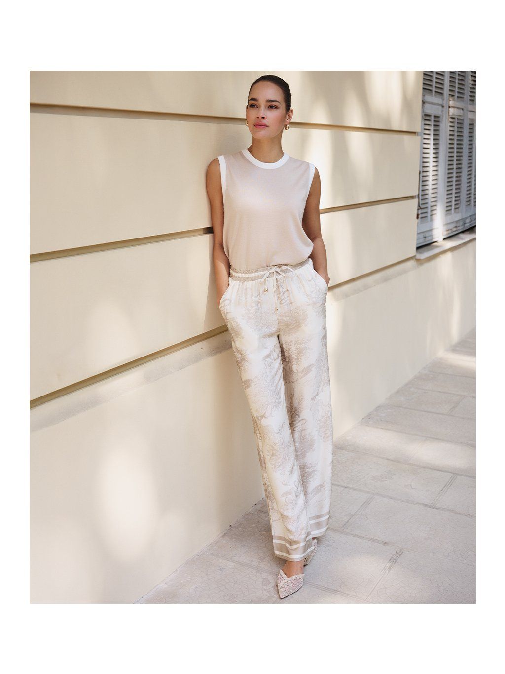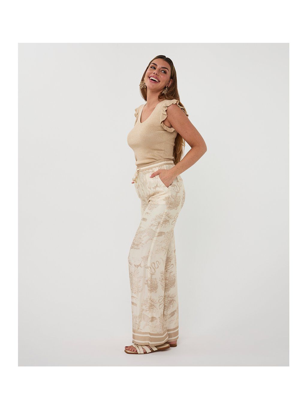 Lehké dámské kalhoty značky EsQualo v jemném „Safari“ potisku přinášejí pocit klidu, elegance a maximálního pohodlí. Neutrální béžové tóny s jemným vzorem působí velmi sofistikovaně a snadno se kombinují s dalšími kousky ve vašem šatníku.