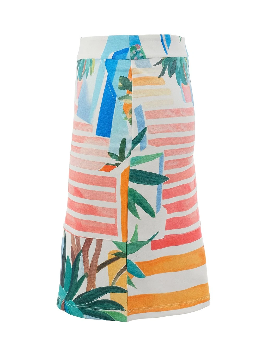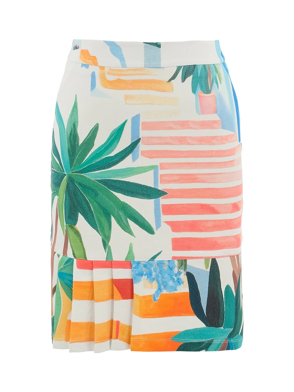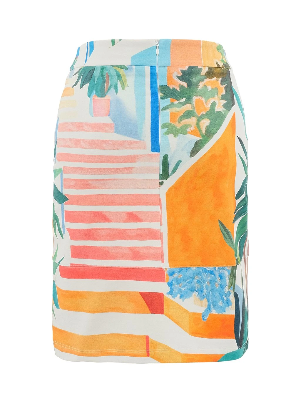 Stylová dámská sukně Dolcezza zaujme originálním uměleckým potiskem inspirovaným středomořskou atmosférou. Barevná kompozice s motivy palem, architektury a letních odstínů oranžové, modré a zelené vytváří výrazný a velmi ženský design.
