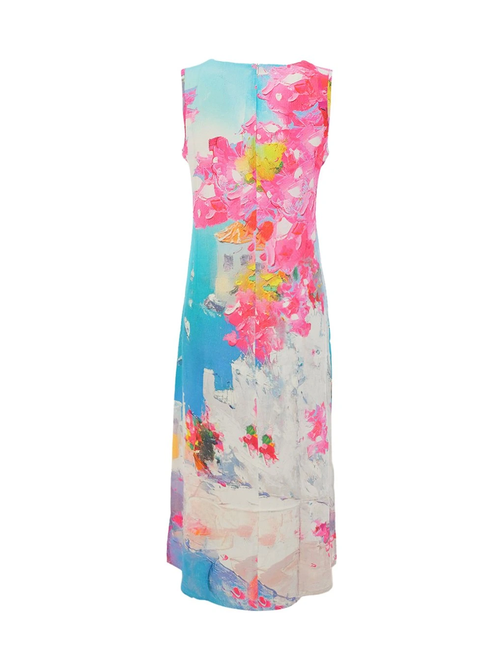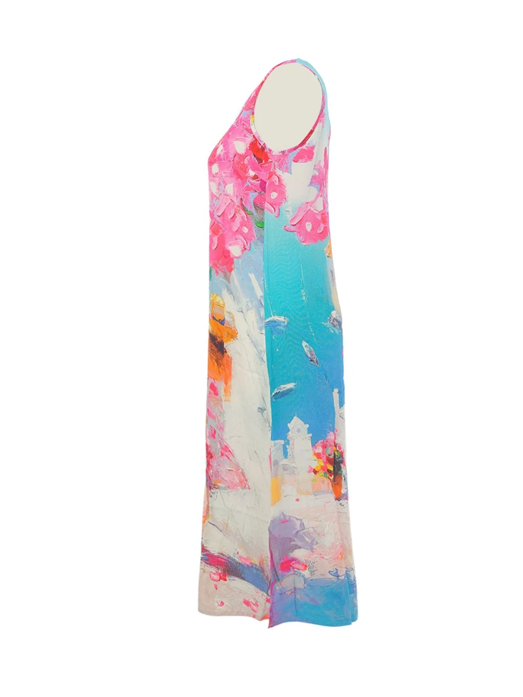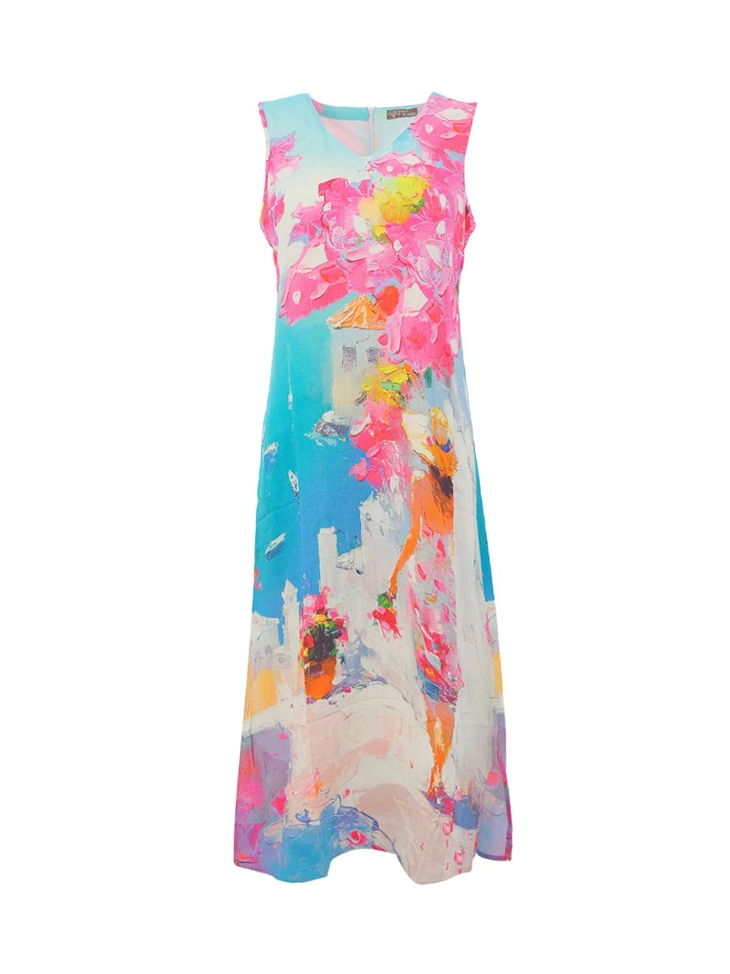 Elegantní dámské šaty značky Dolcezza zaujmou na první pohled originálním uměleckým potiskem v jemných letních barvách. Kombinace modrých, růžových a pastelových tónů vytváří velmi ženský a svěží dojem, který připomíná atmosféru letního města a rozkvetlé zahrady.