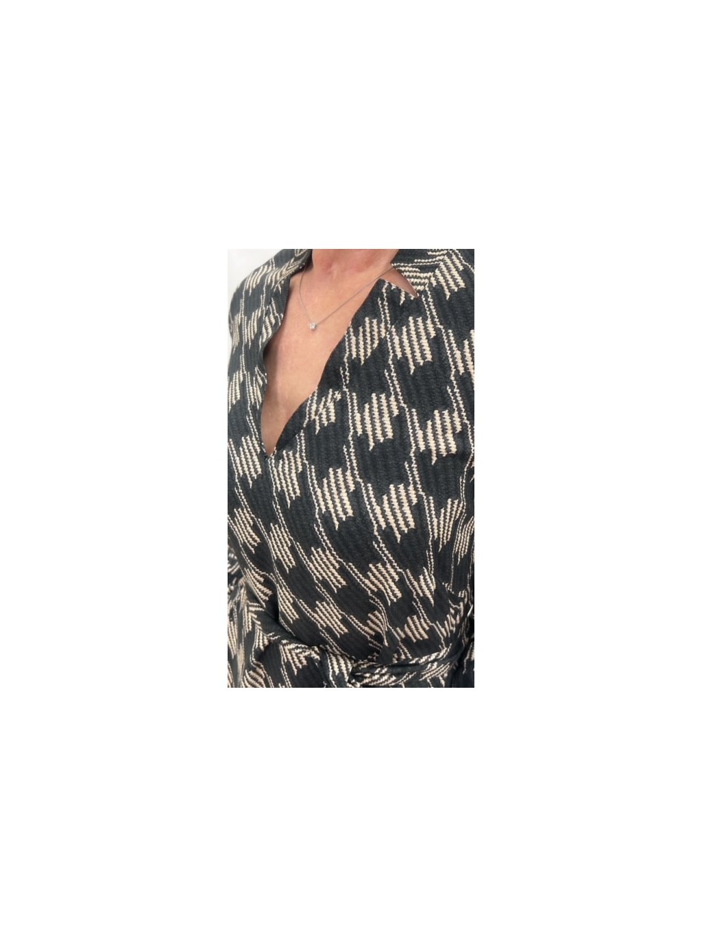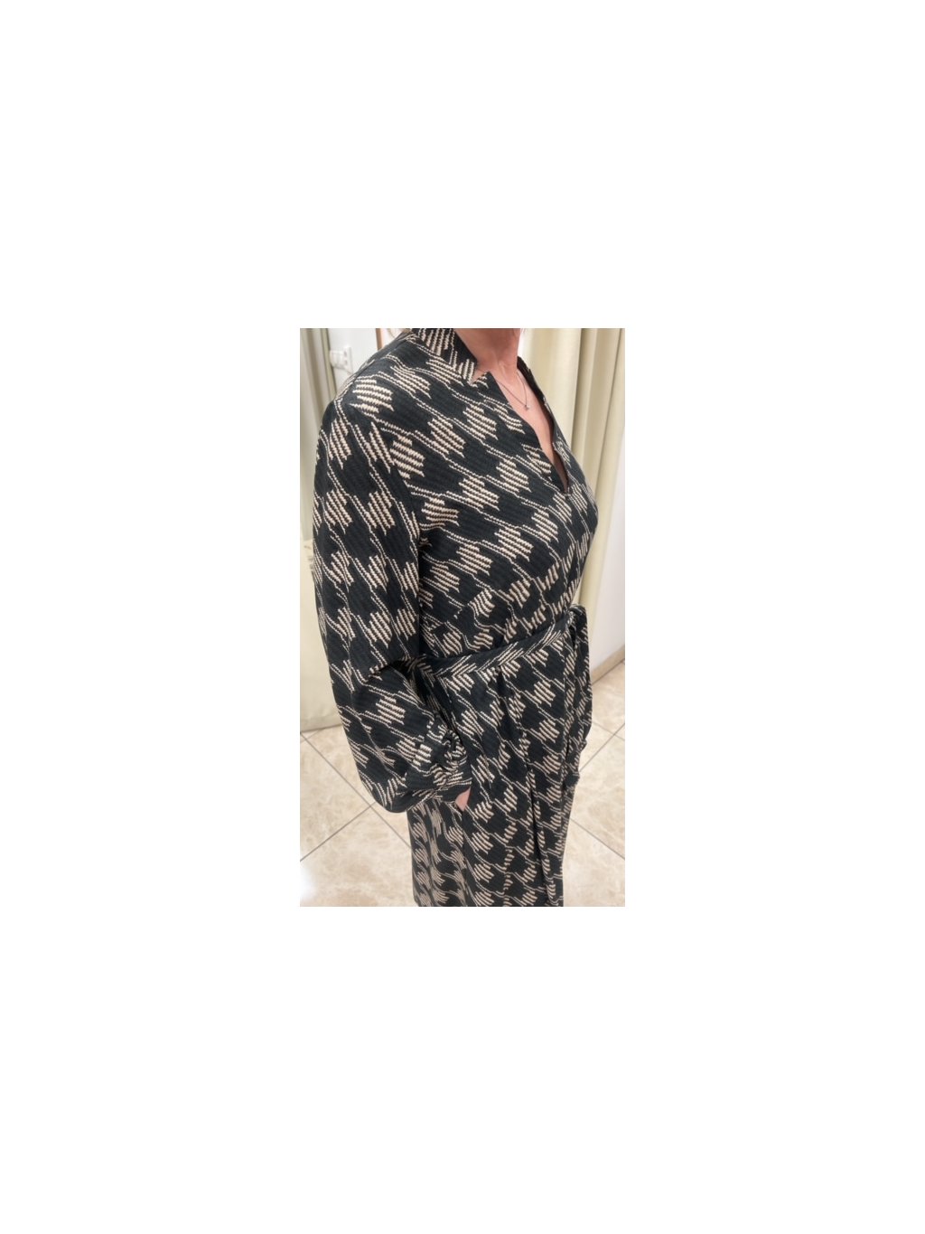 Elegantní šaty s výsřihem do V, s malým stojáčkem. Dlouhé rukávy na konflíček. Přistřižené v pase, z boku na zip a kapsy.