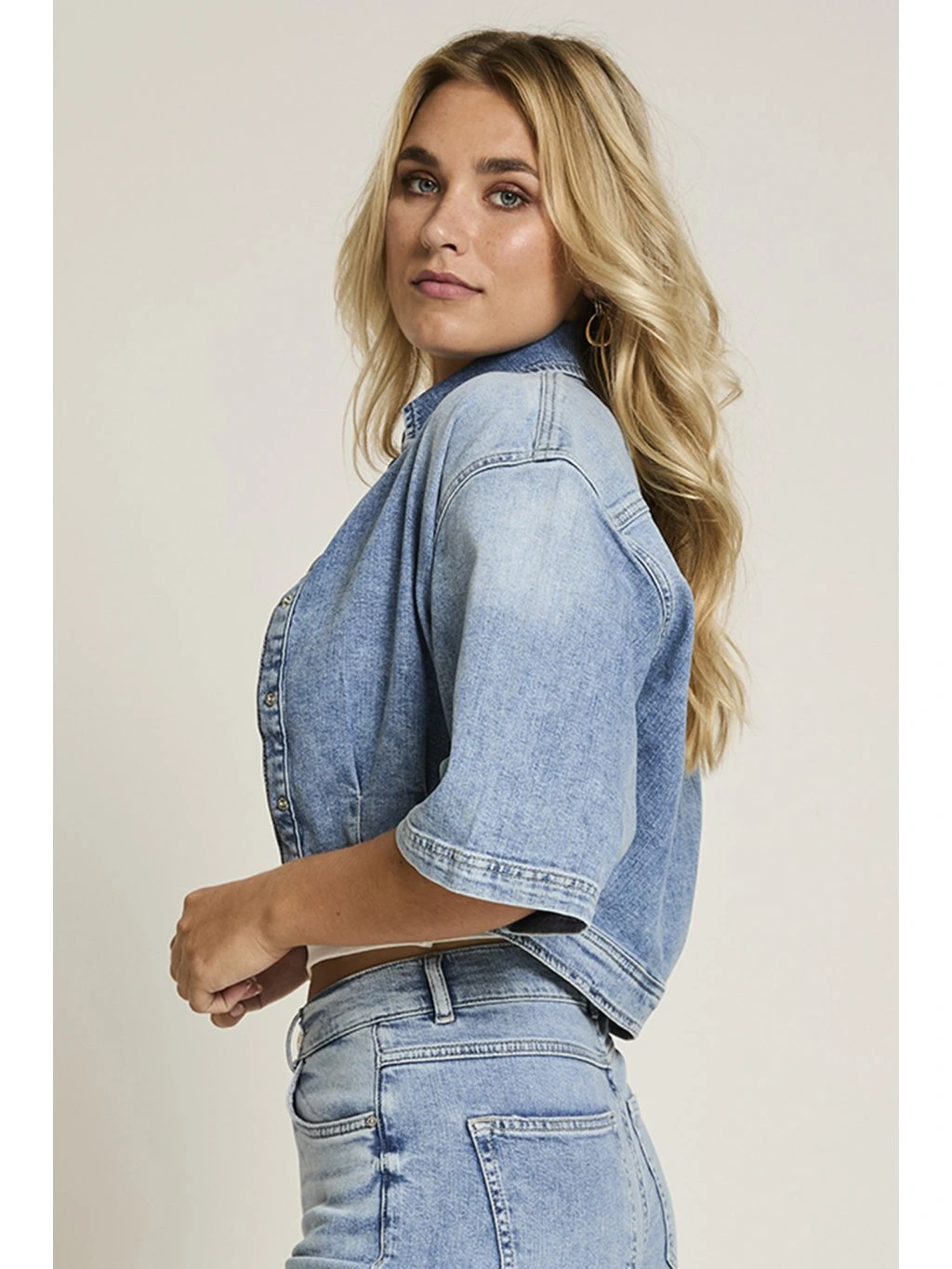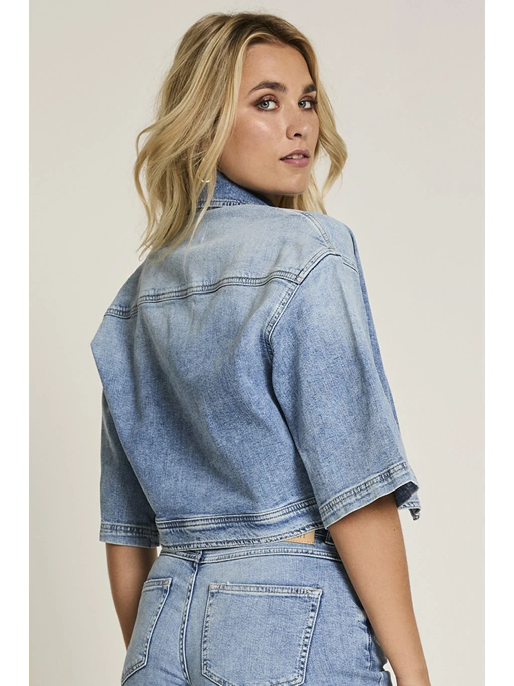 Krátká denimová bundička s moderním, lehce projmutým střihem, který krásně zvýrazní pas. Ozdobné patentky dodávají modelu čistý, elegantní vzhled a dělají z ní perfektní kousek jak k džínám, tak k šatům nebo sukním. Rukávy v délce ke lokti působí velmi svěže a žensky.