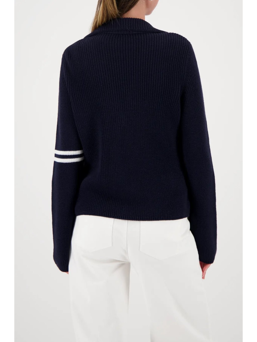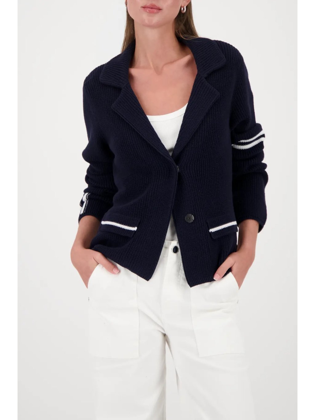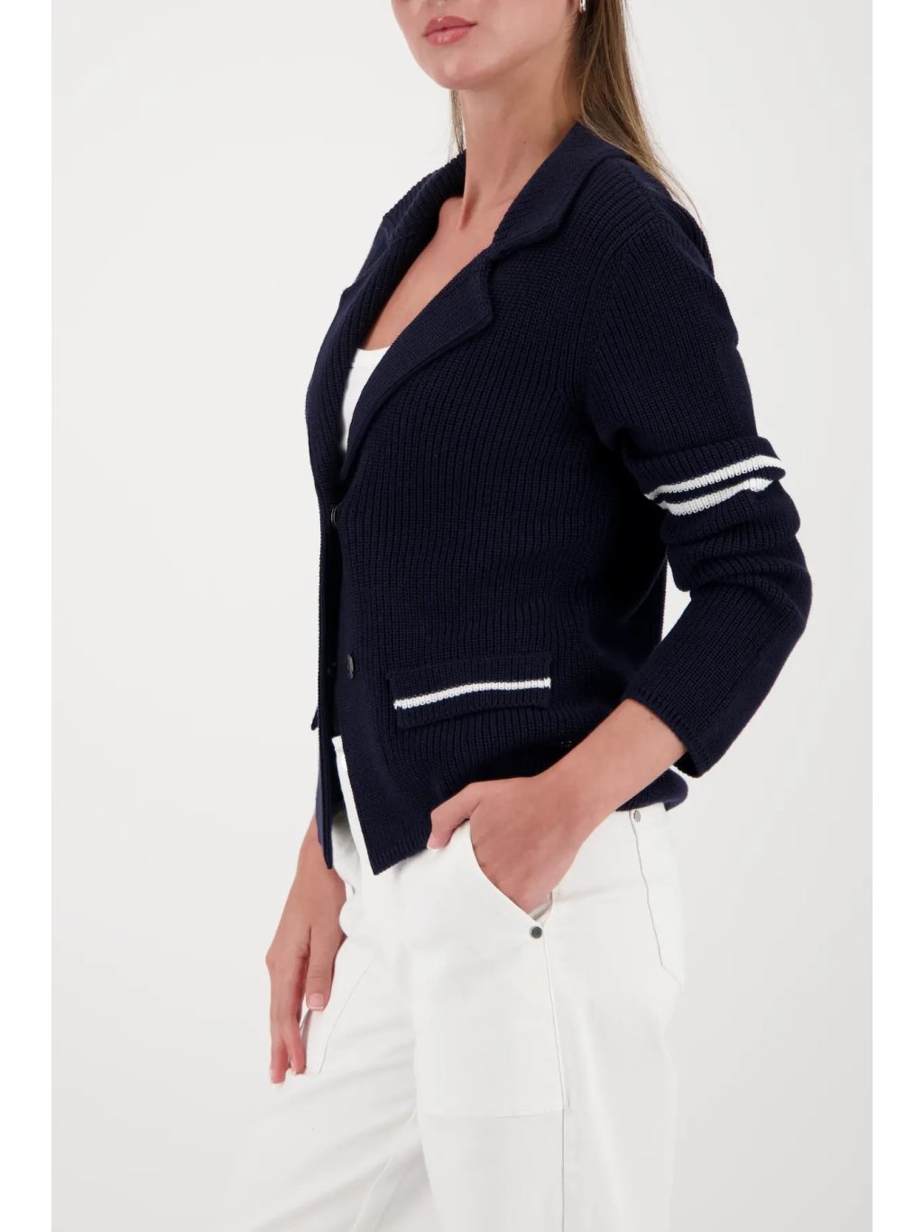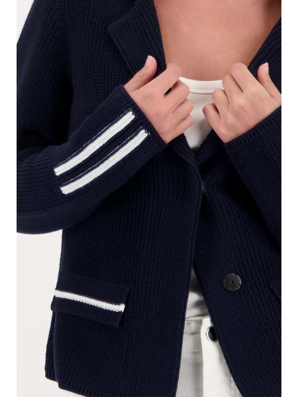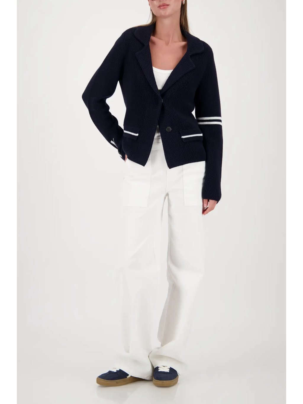 Elegantní pletený blazer v námořnických barvách je ztělesněním nadčasové elegance s lehkým francouzským šarmem. Působí klidně, sebevědomě a upraveně - je to kousek , který dodá oufitu styl, aniž by působil strojeně.