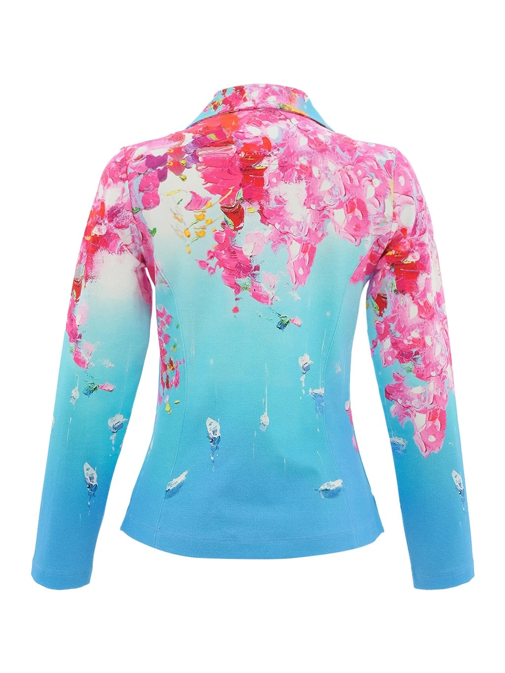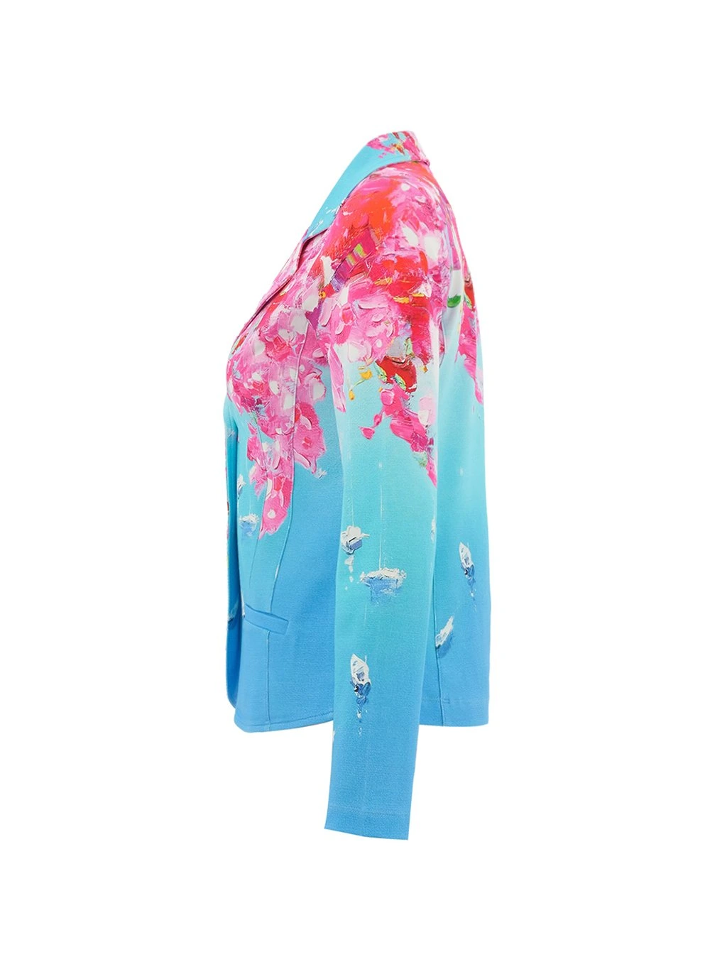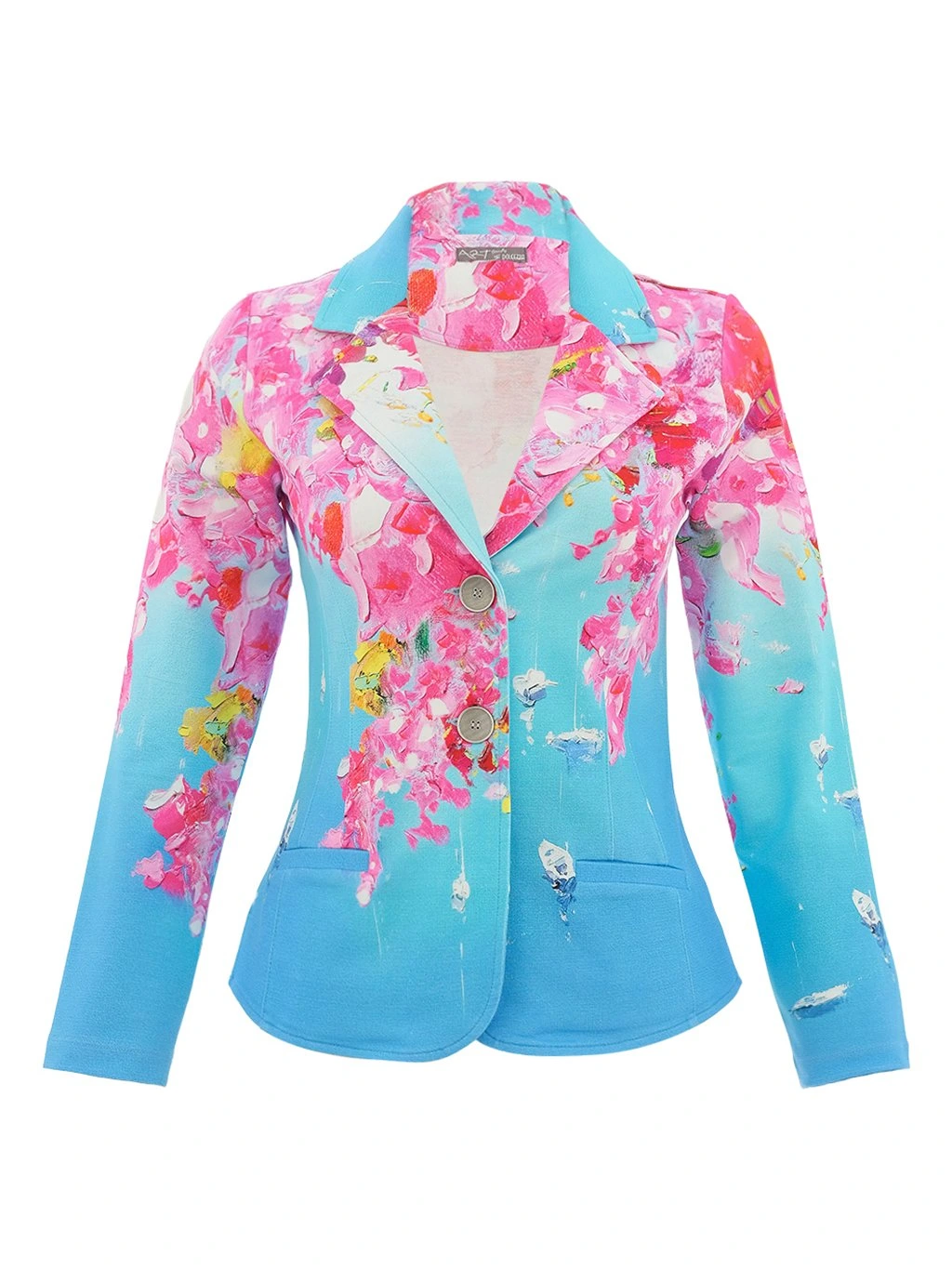 Elegantní dámské sako Dolcezza zaujme na první pohled výrazným uměleckým potiskem v jemných odstínech tyrkysové, růžové a bílé. Květinový motiv inspirovaný malířským stylem dodává modelu svěží, ženský a velmi originální charakter.