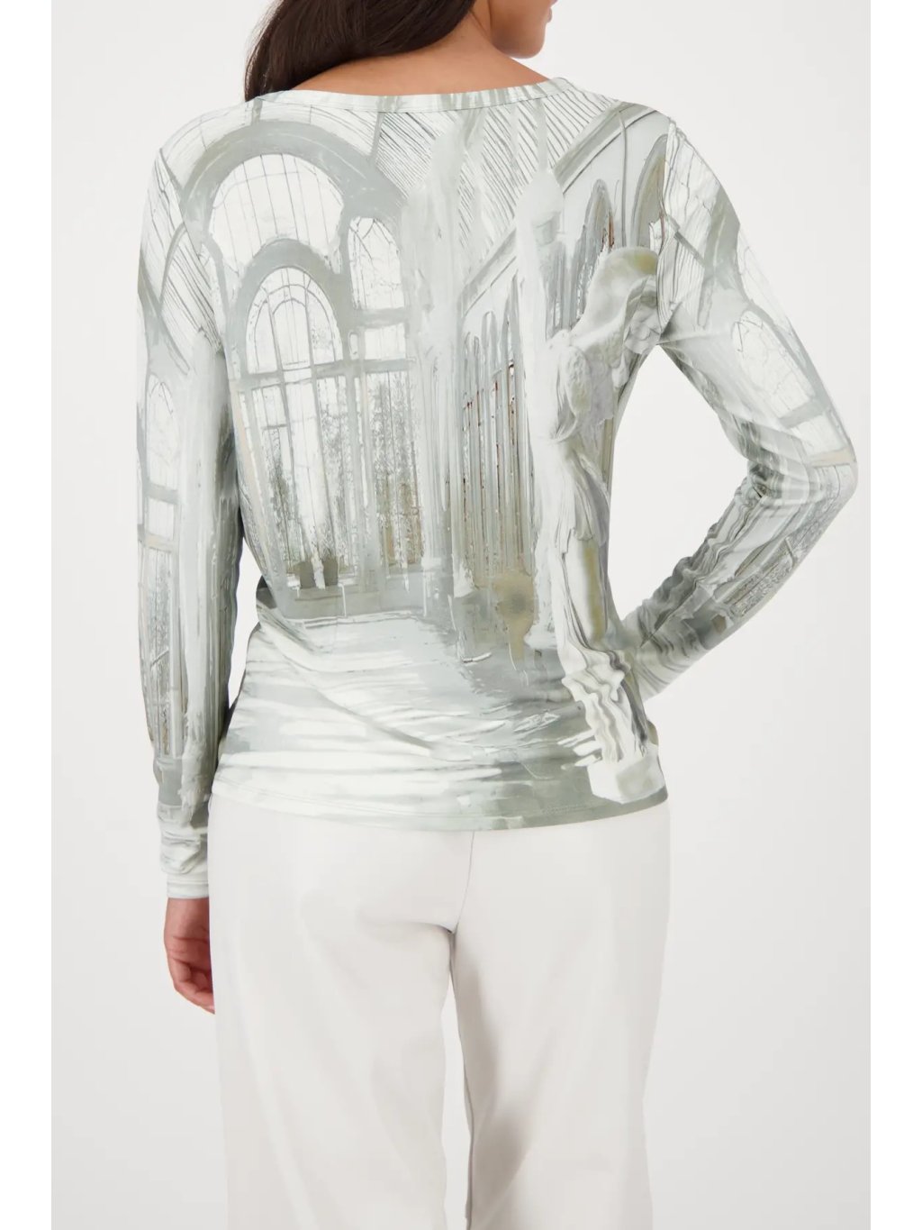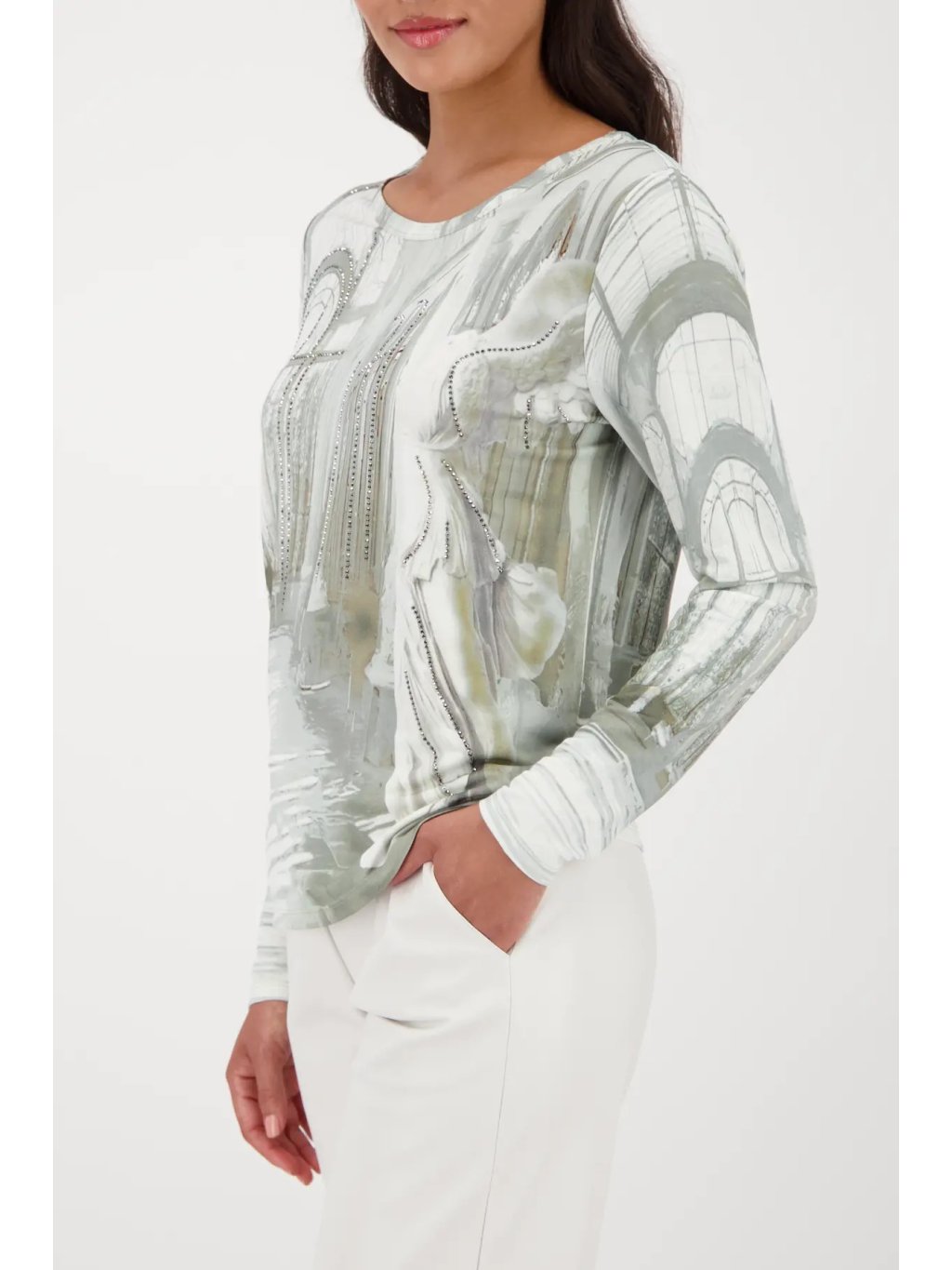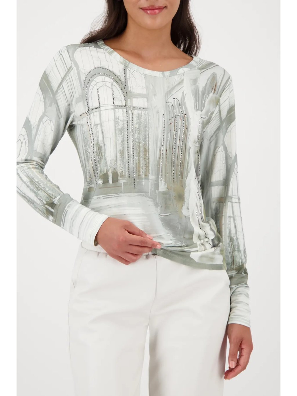 Elegantní triko s dlouhým rukávem z jemně splývavého materiálu s přímesí modalu zaujme originálním potiskem architektury v jemném šalvějovém odstínu . Na předním díle je zdobeno jemnými kamínky, které dodávají modelu ženský šmrnc. Příjemně elastický materiál zaručuje dokonalé pohodlí při nošení, zatímco rafinovaný střih s kulatým výstřihem lichotí postavě.