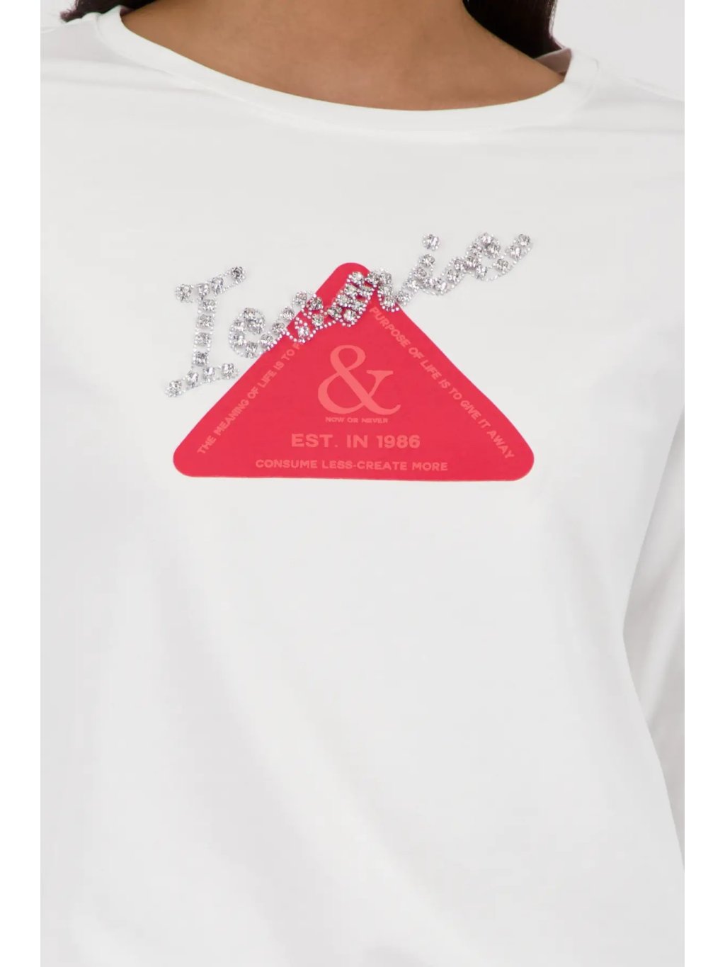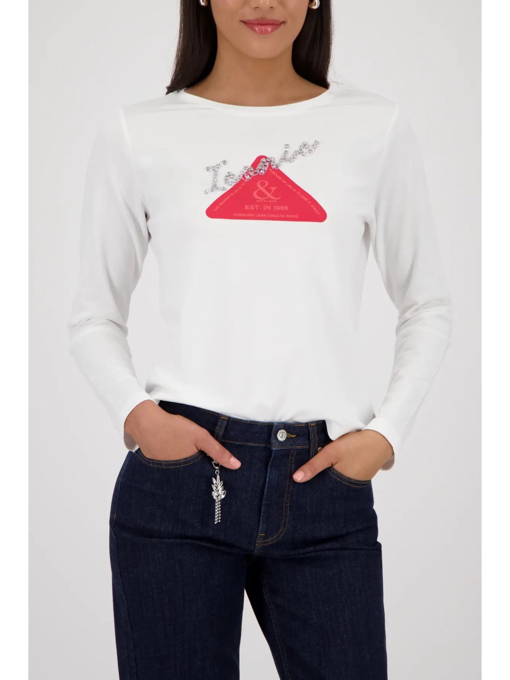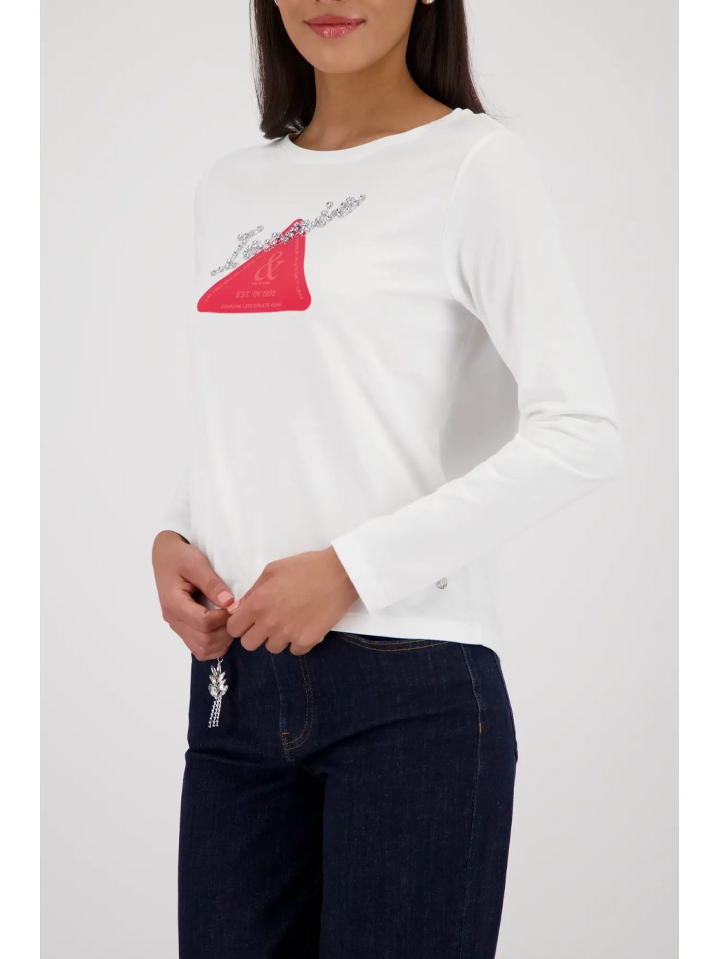 Elegantní dámské triko s dlouhým rukávem v jemné odstínu off-white je vyrobeno z kvalitní směsi bavlny a modalu, která je velmi příjemná na nošení. Přední díl zdobí výrazný emblém se třpytivými kamínky, který dodává modelu ženský a lechce luxusní nádech.