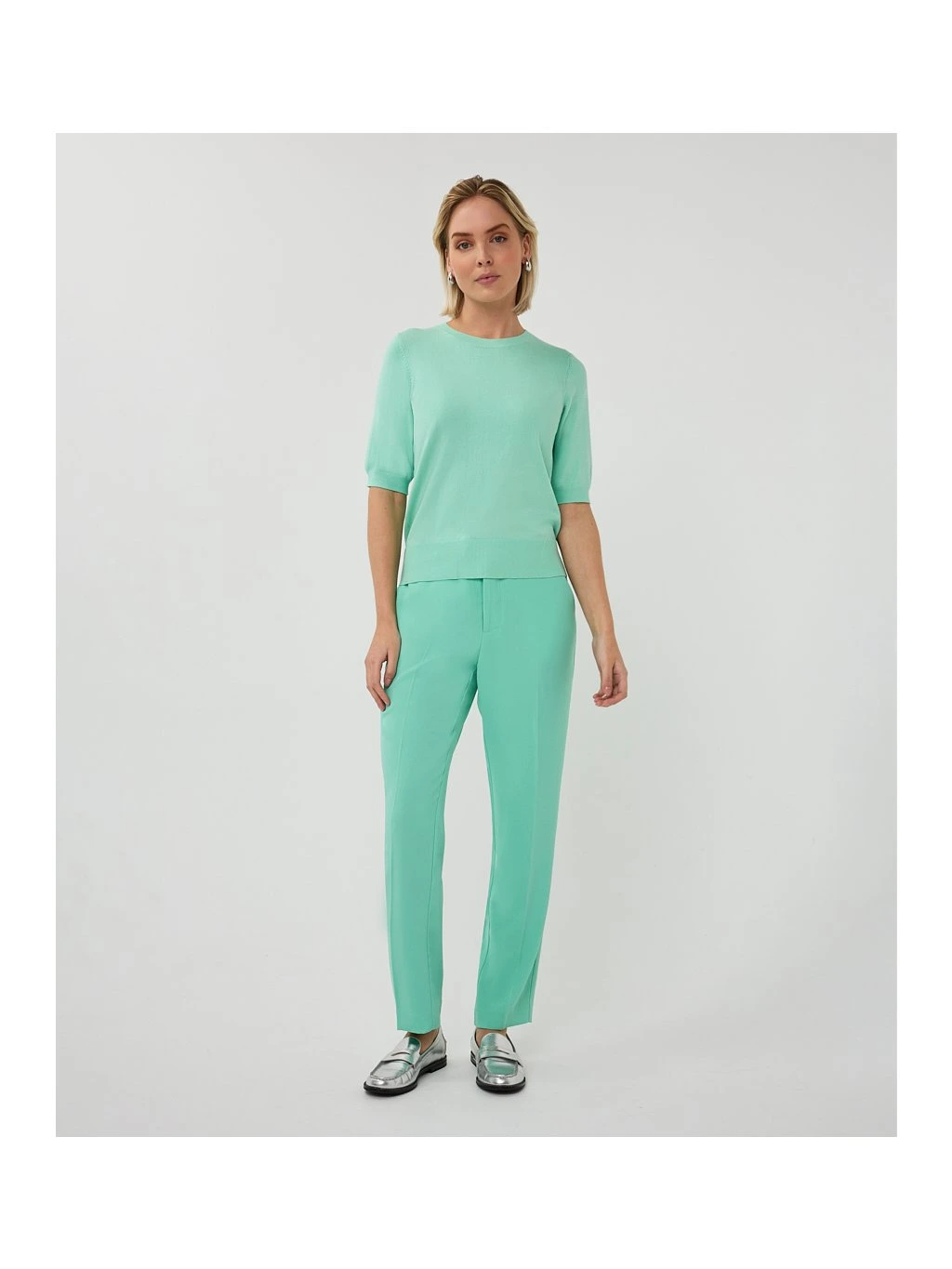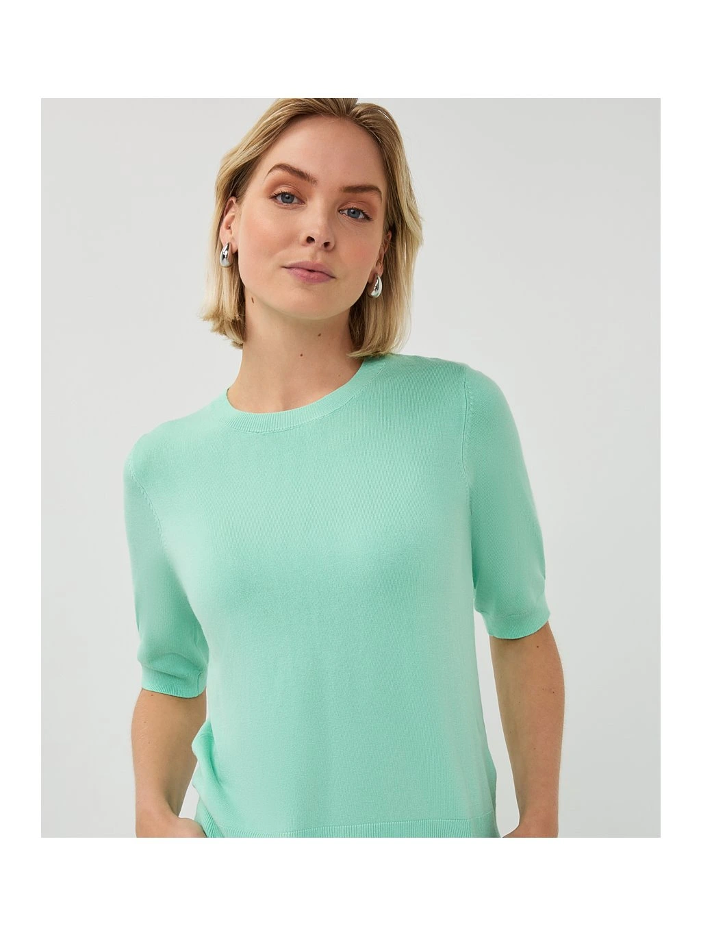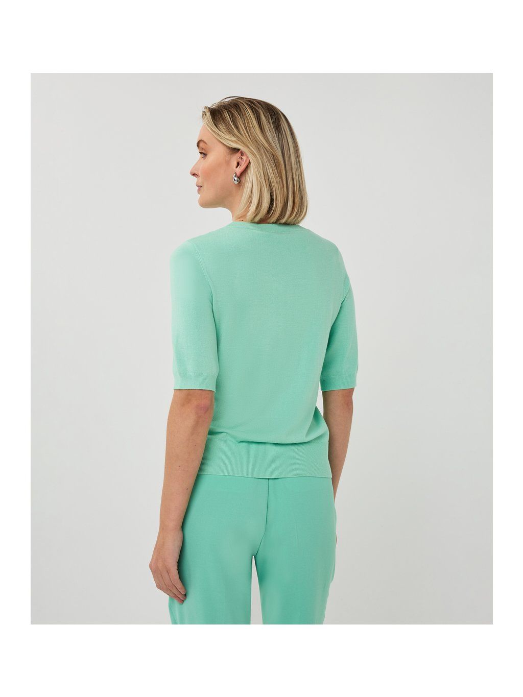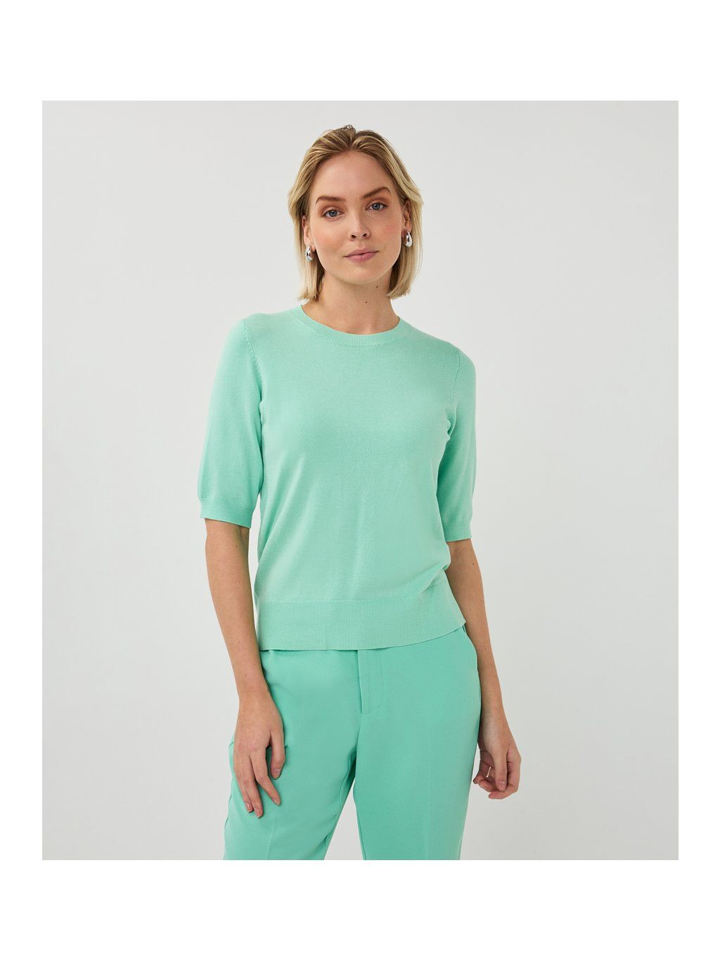 Elegantní dámský top značky EsQualo v jemném mint odstínu působí svěže, žensky a velmi sofistikovaně. Minimalistický design s krátkým rukávem a kulatým výstřihem je nadčasový a snadno kombinovatelný s kalhotami, džínami i sukní.