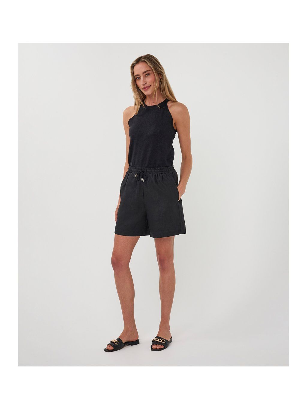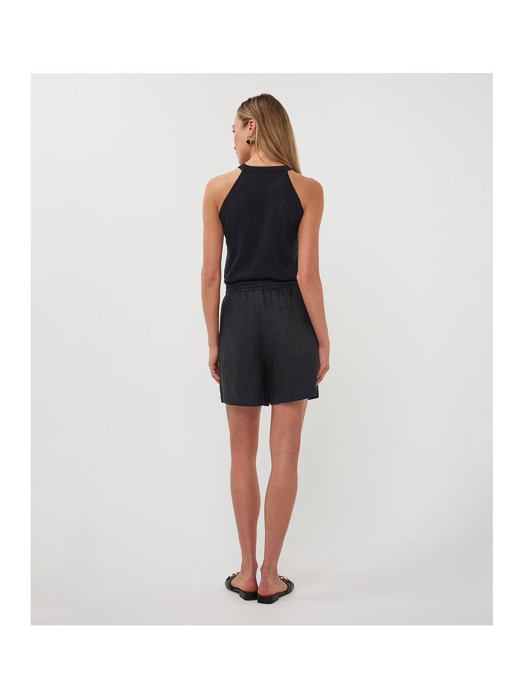Elegantní top značky EsQualo v nadčasové černé barvě zaujme svým halter střihem, který krásně zvýrazní ramena a dodá outfitu moderní, ženský vzhled.