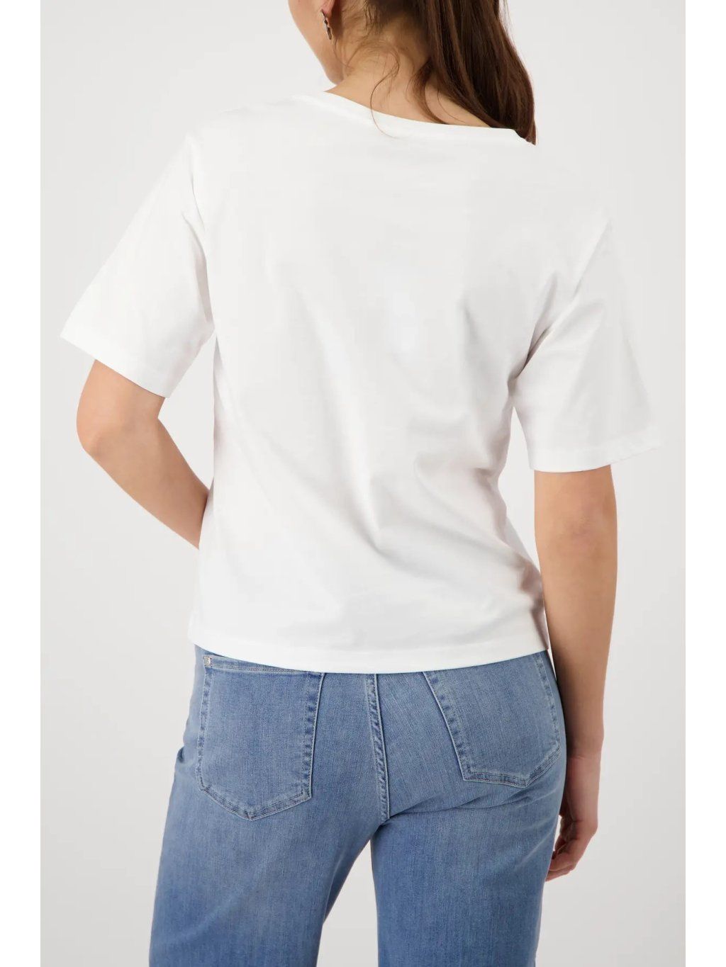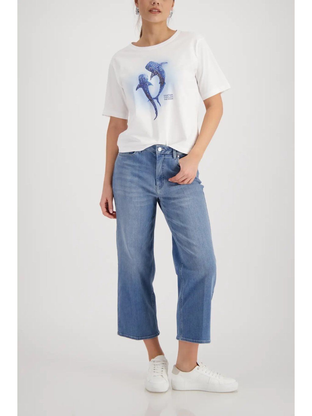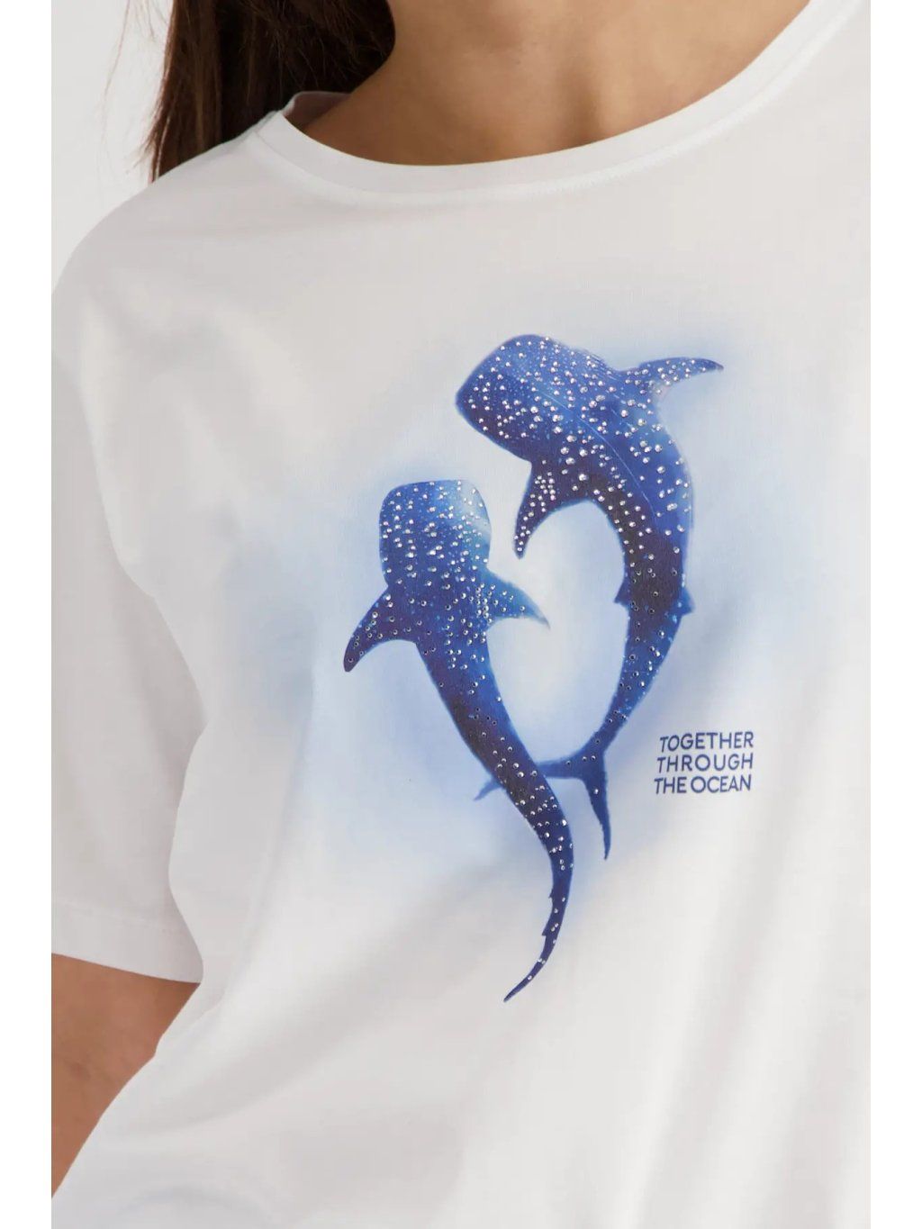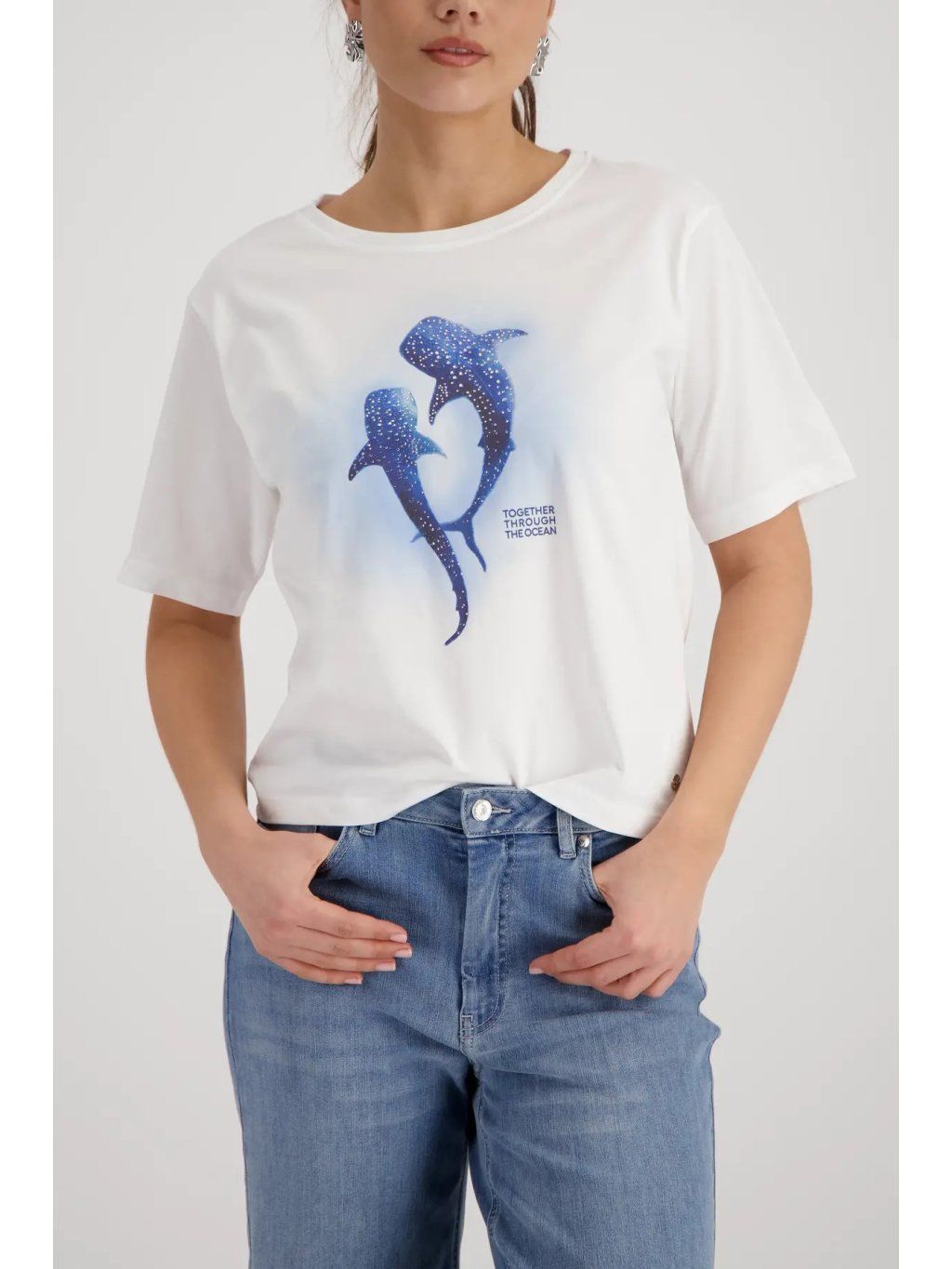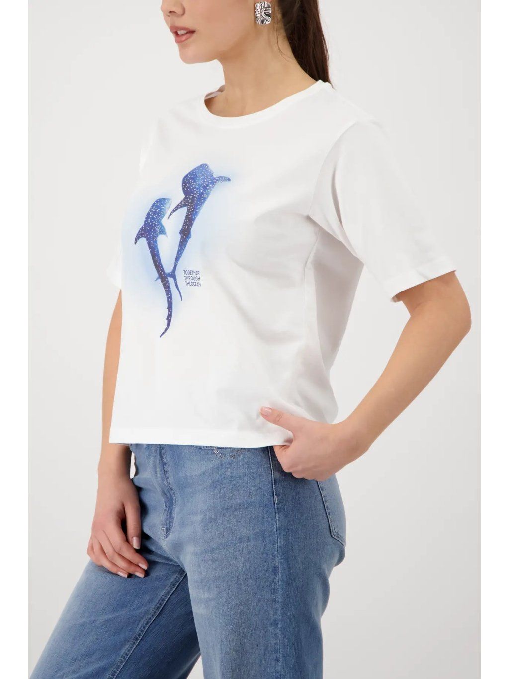 Stylové dámské triko MONARI v bílé barvě zaujme originálním potiskem velryb, který je doplněn o jemné třpytivé kamínky. Tento detail dodává tričku luxusní a hravý nádech zároveň.